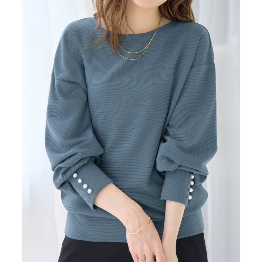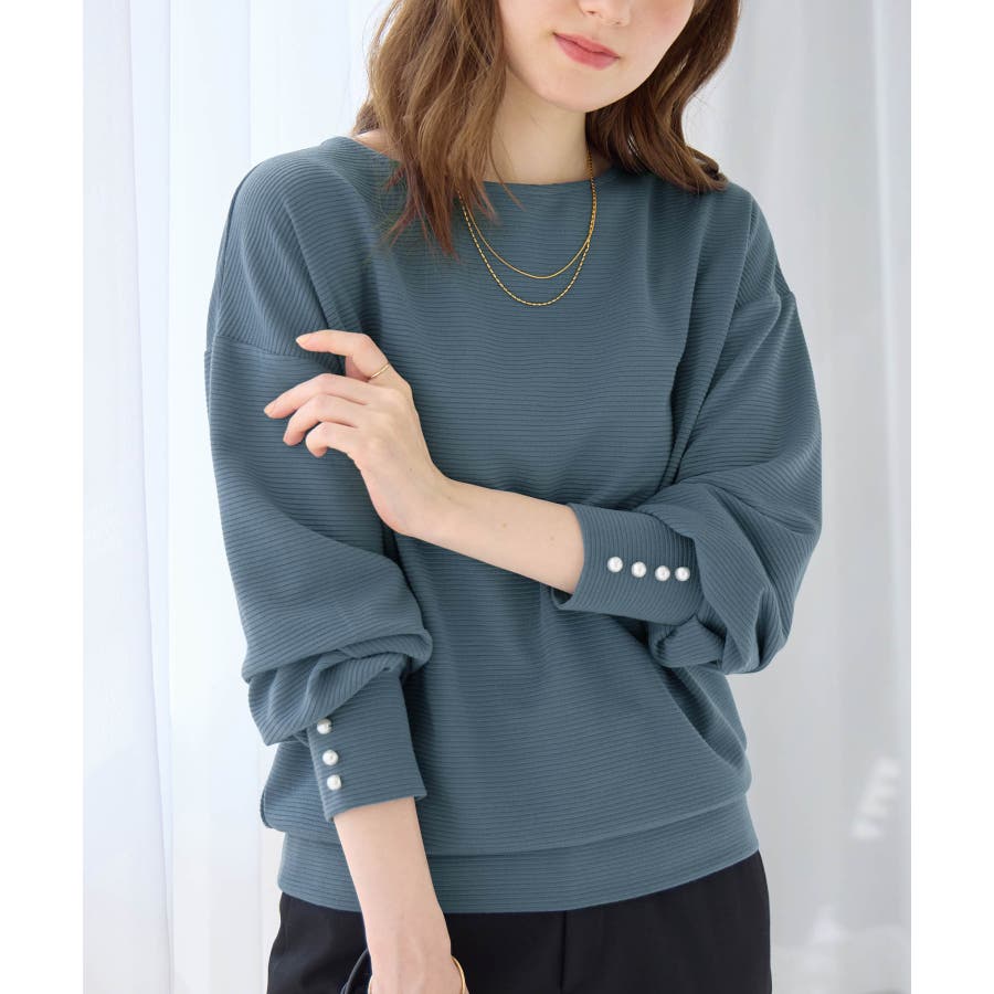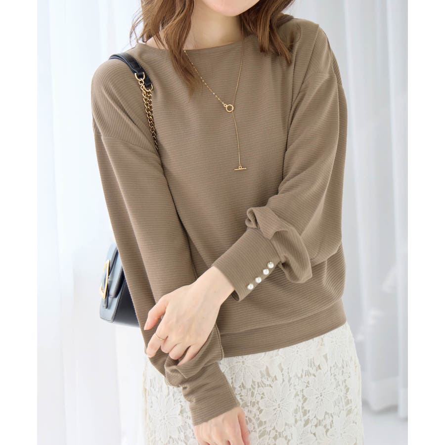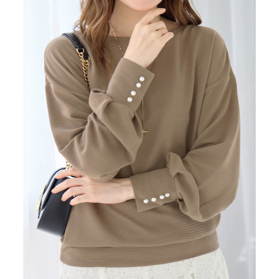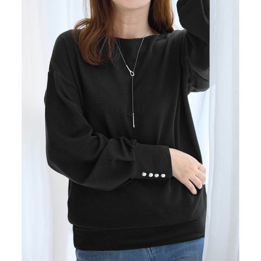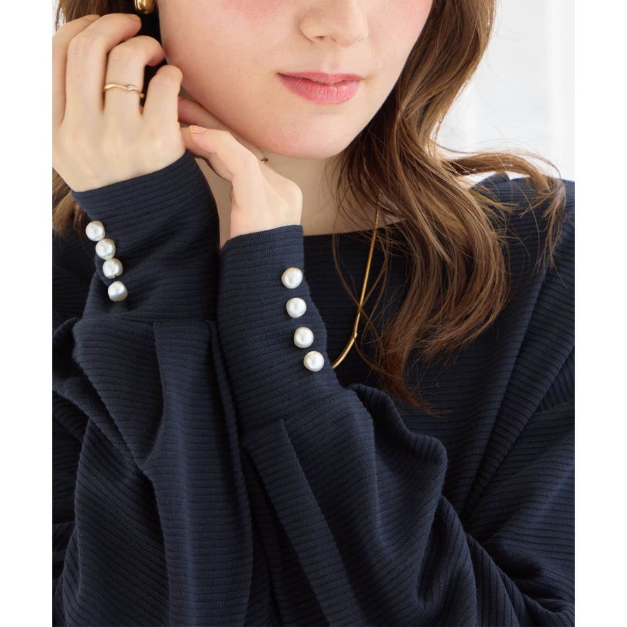 ・シンプルなトップスデザインに、袖口のパール調ボタンが上品なアクセント。