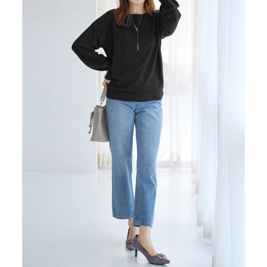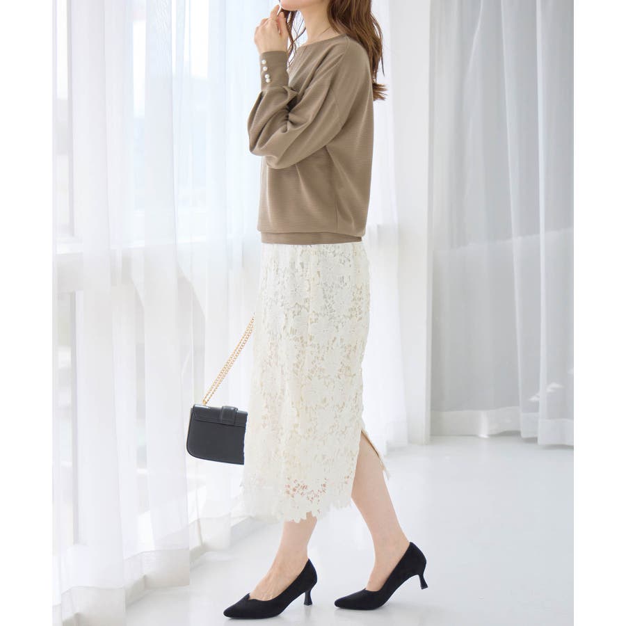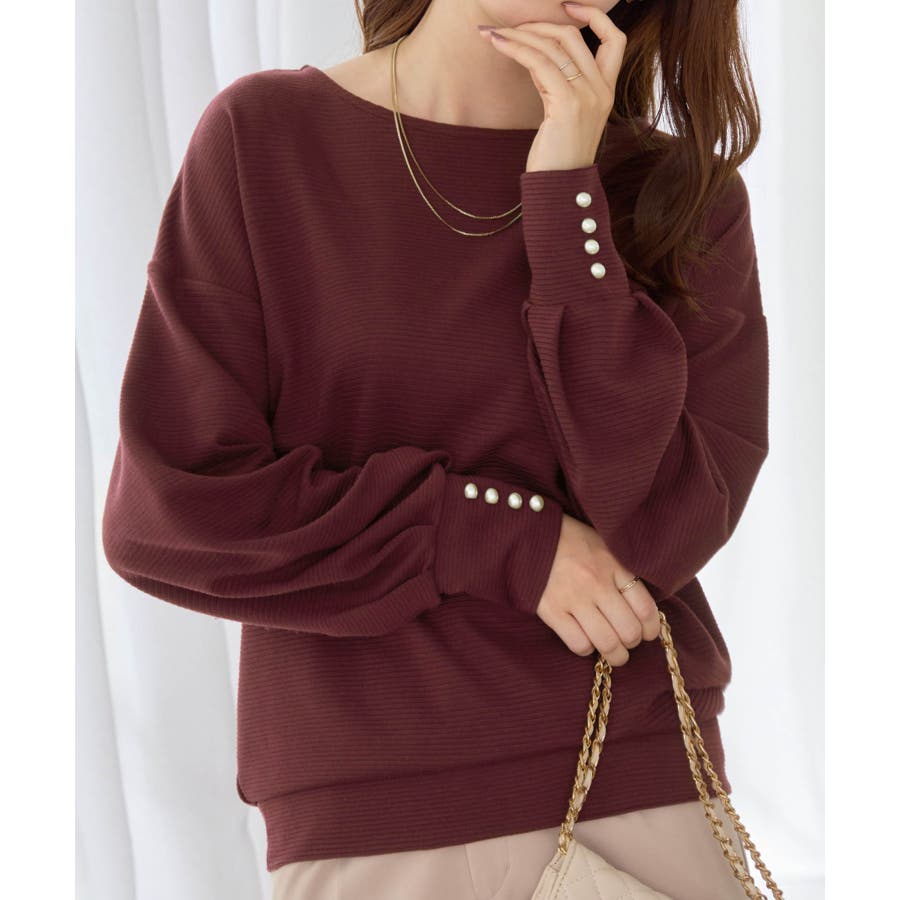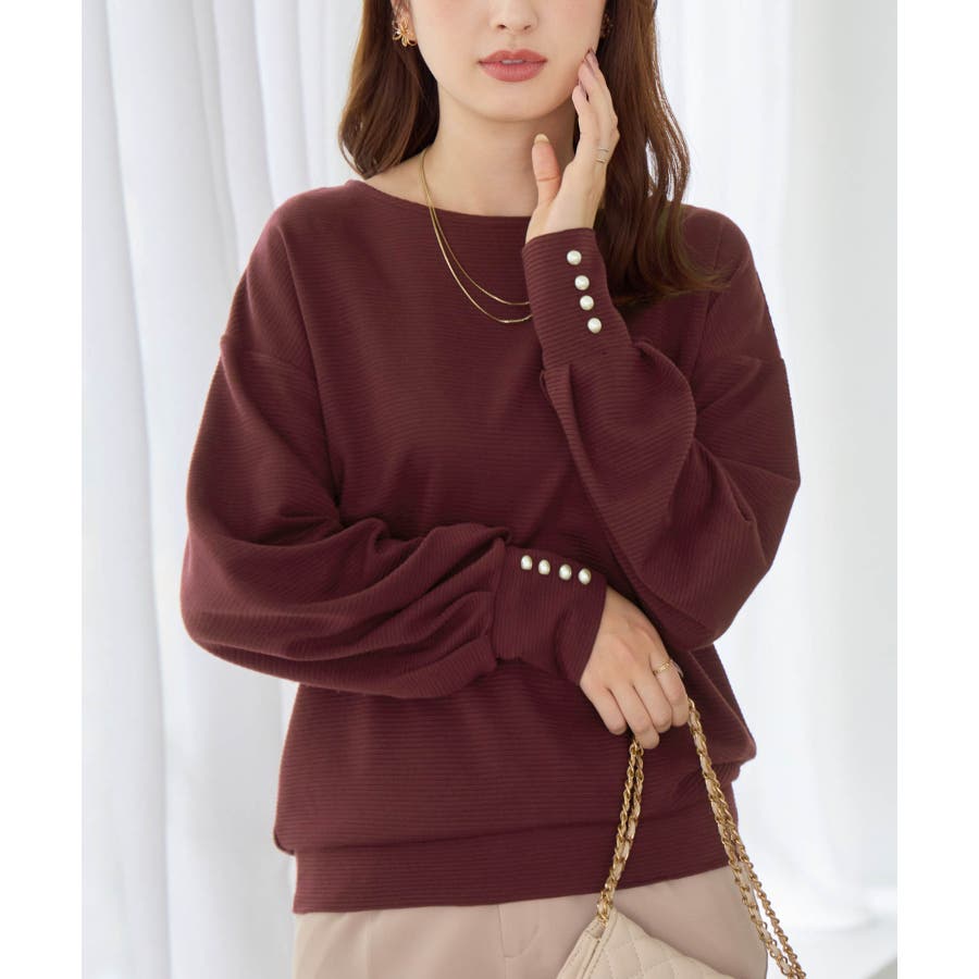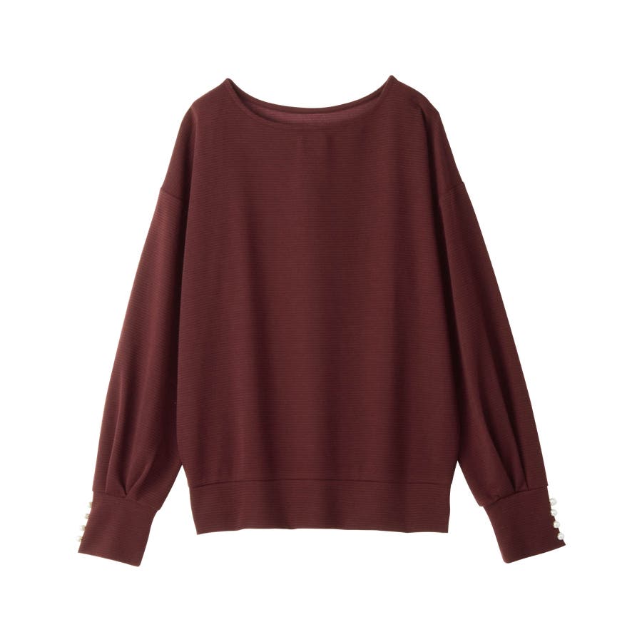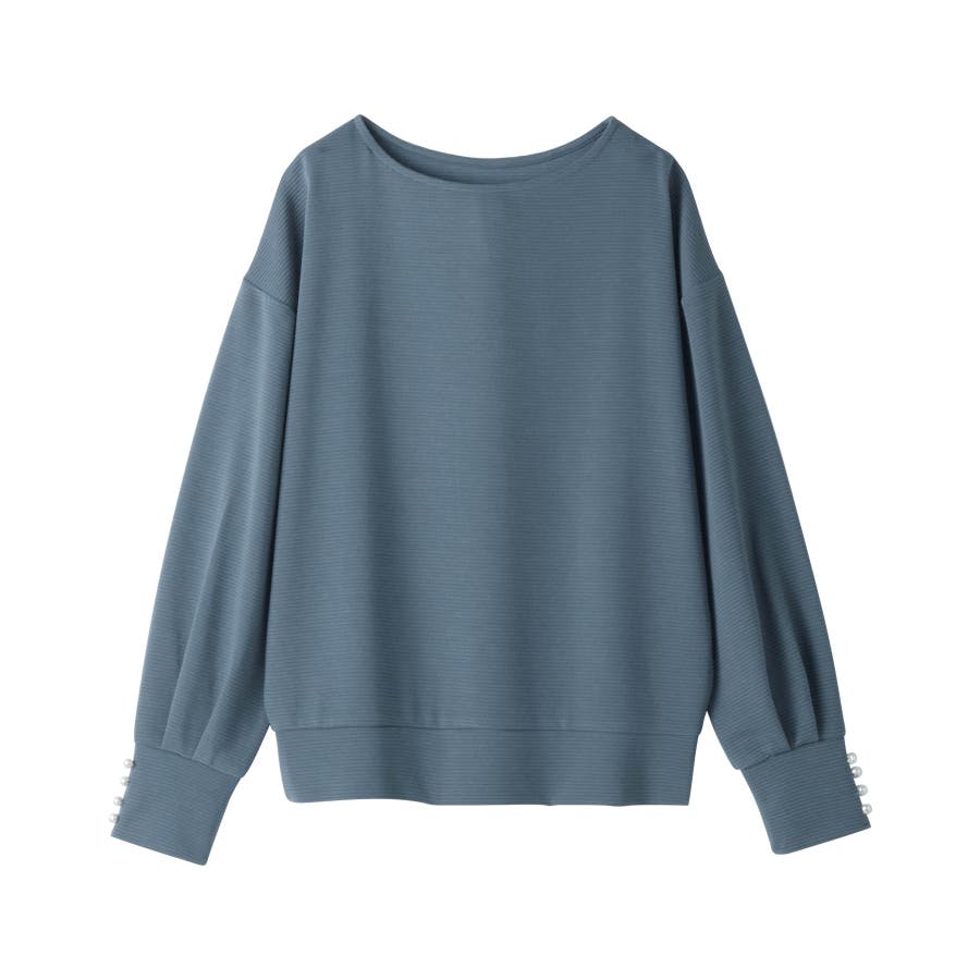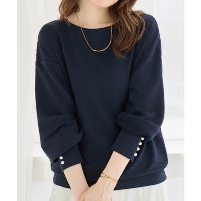 ・シンプルなトップスデザインに、袖口のパール調ボタンが上品なアクセント。