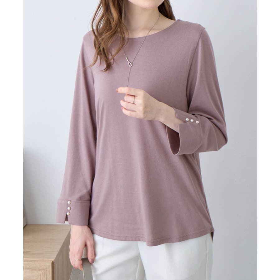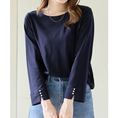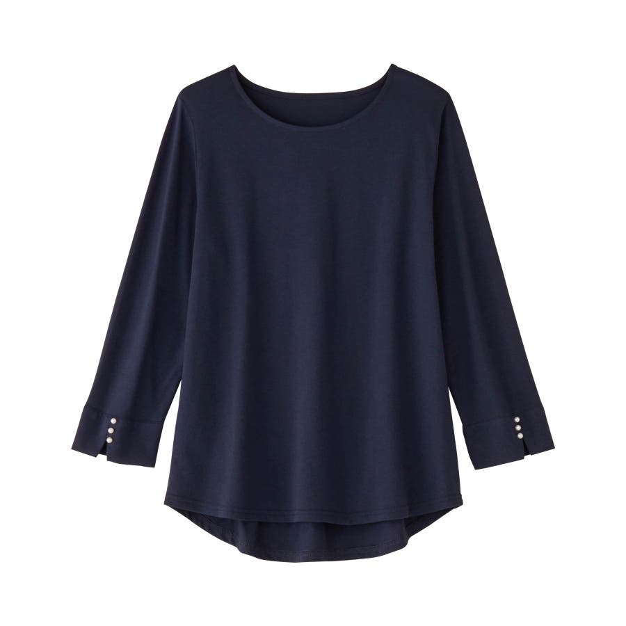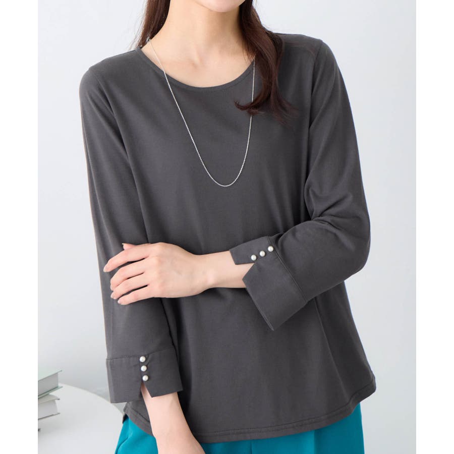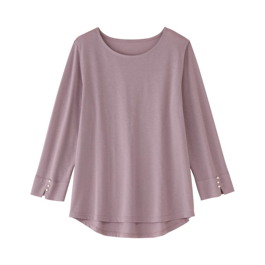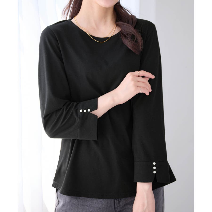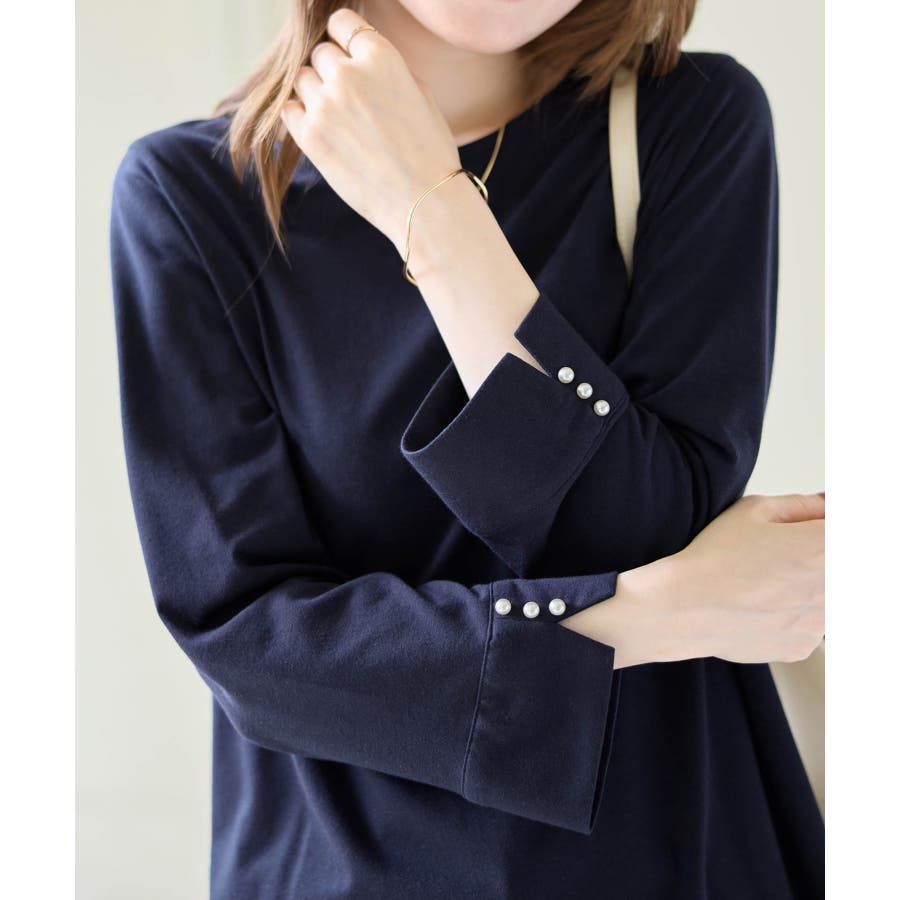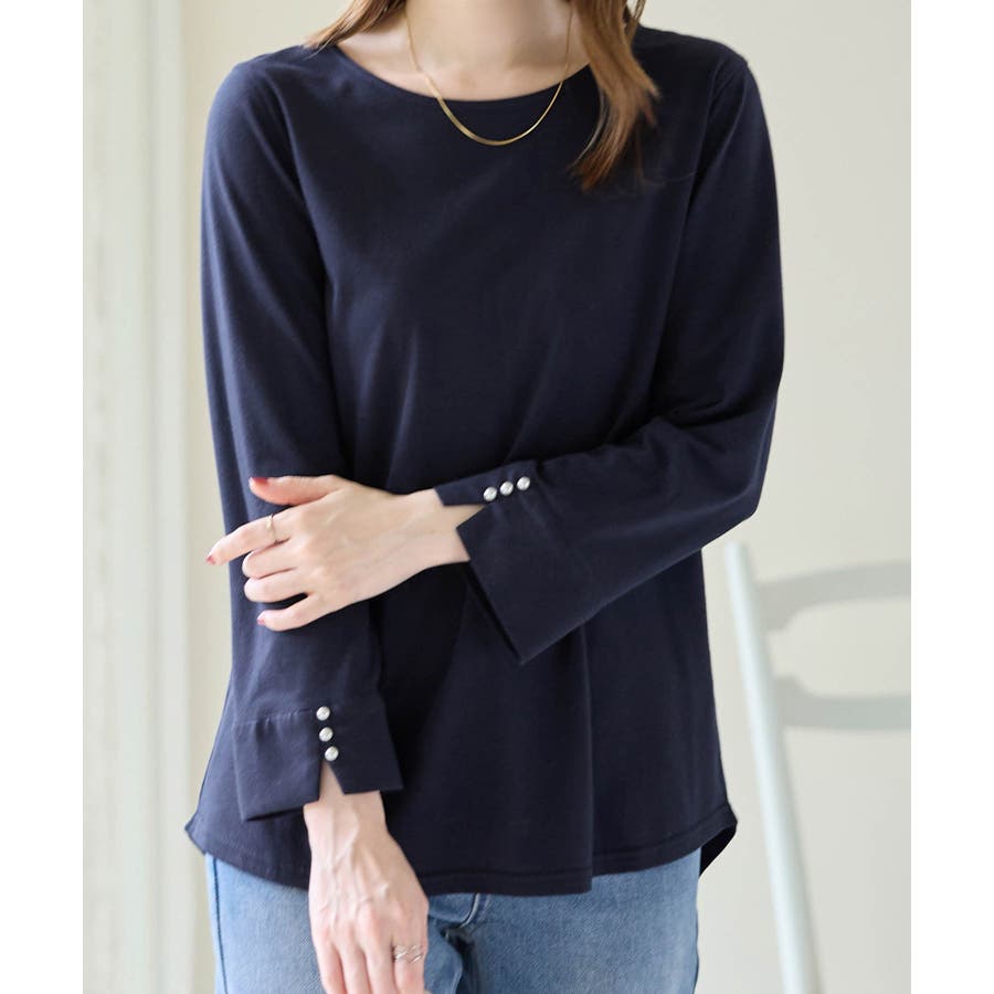 袖のパール調ボタンがワンポイントの可愛くて優秀なトップス。肌に優しい綿混素材で着心地楽ちん!