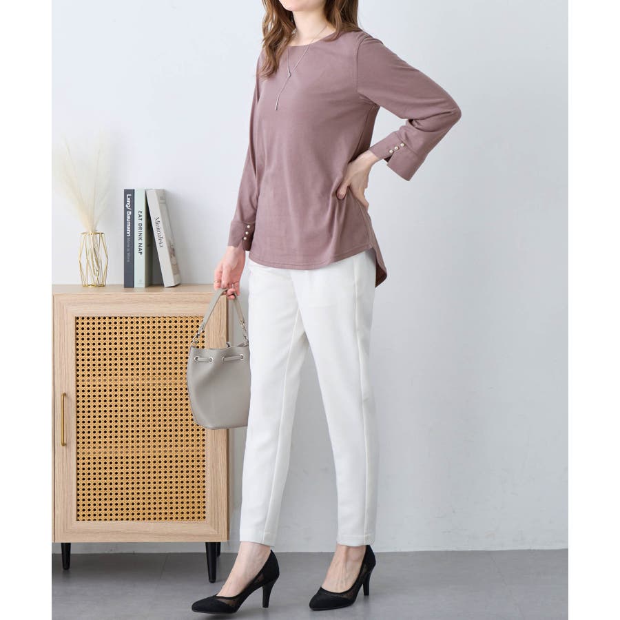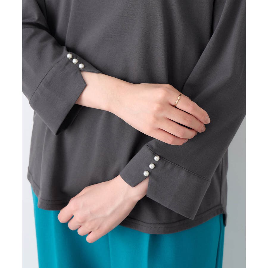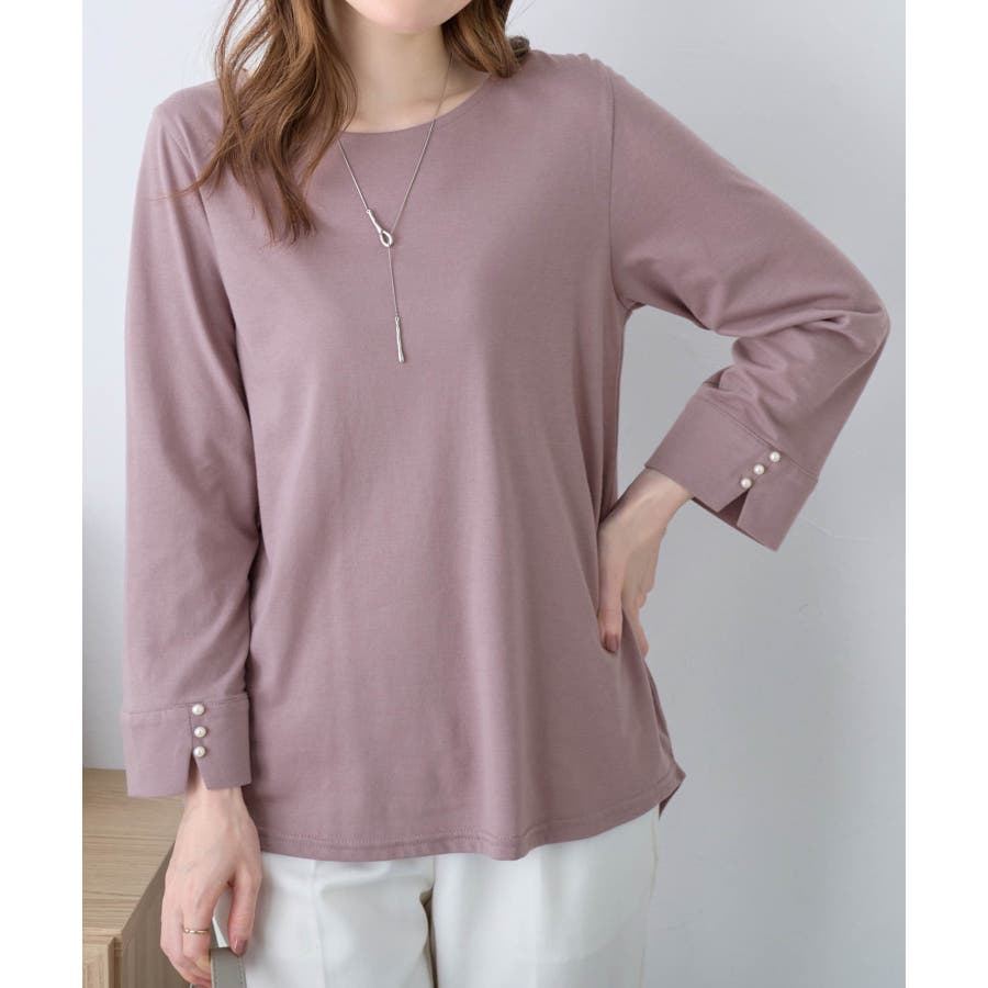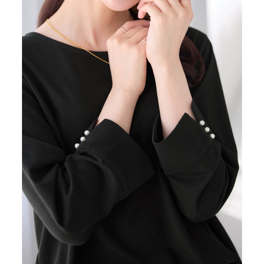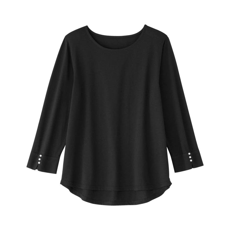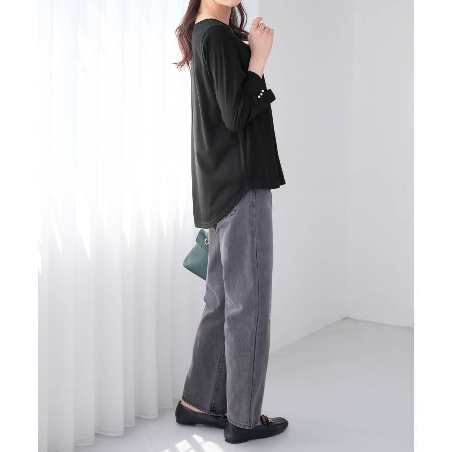 袖のパール調ボタンがワンポイントの可愛くて優秀なトップス。肌に優しい綿混素材で着心地楽ちん!