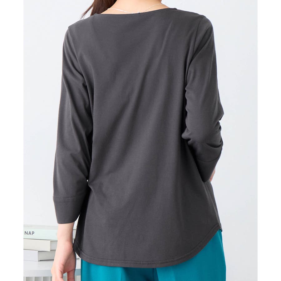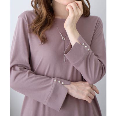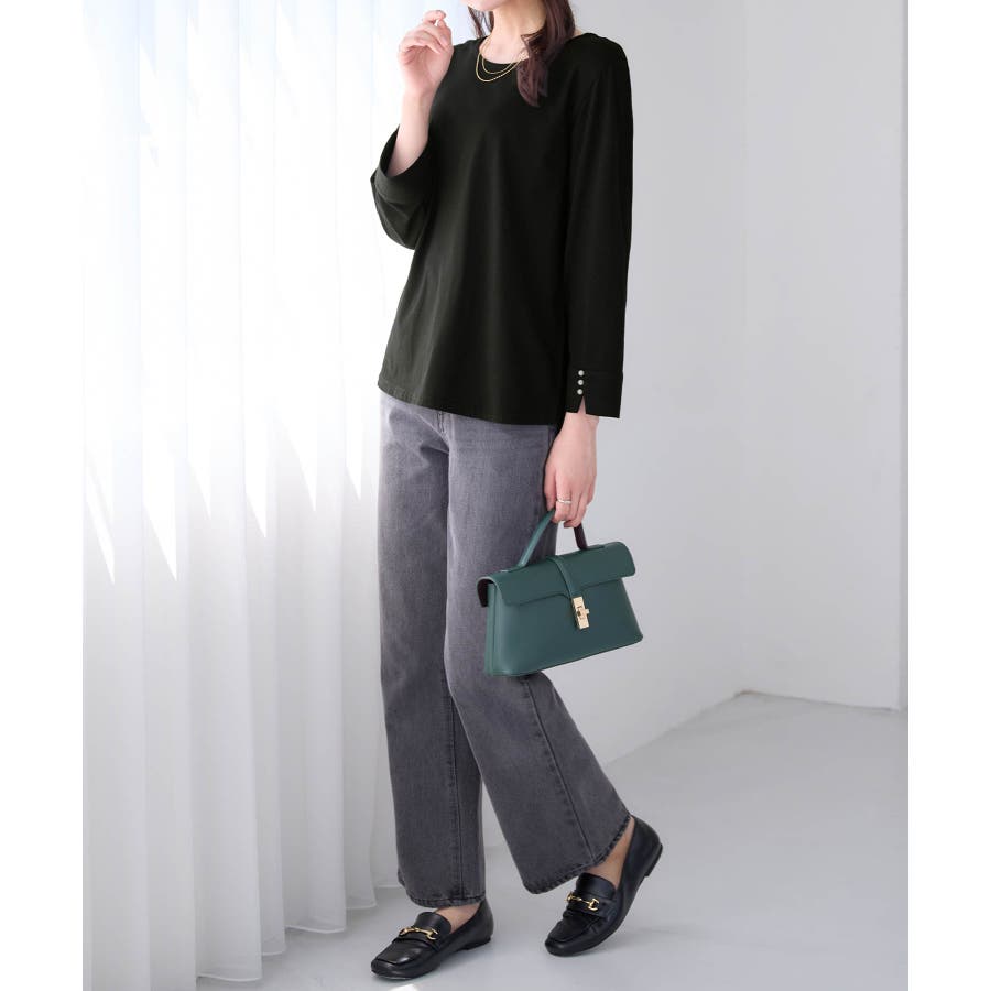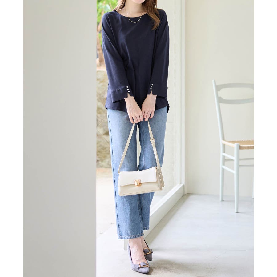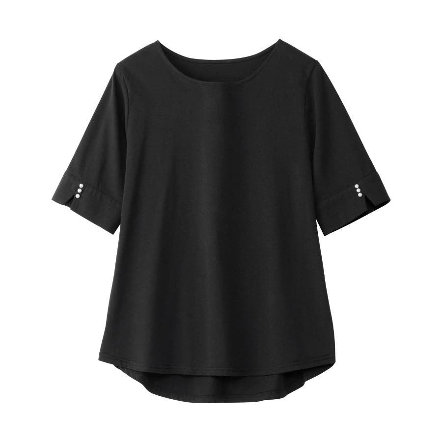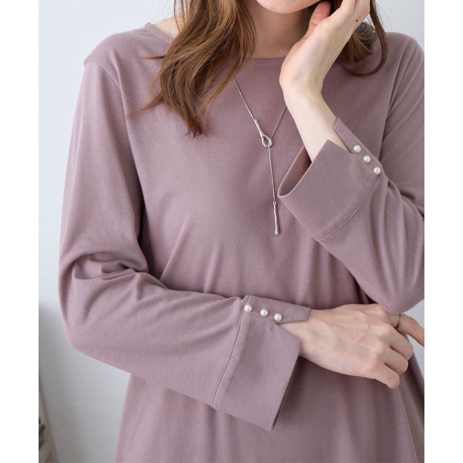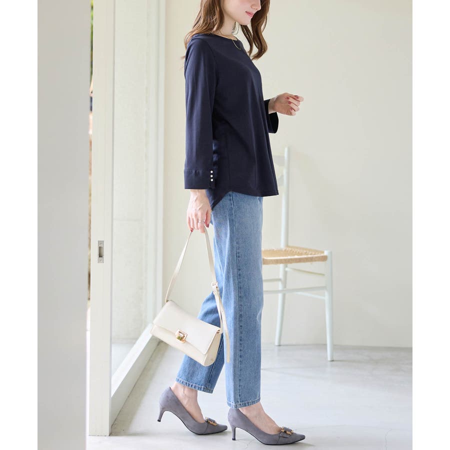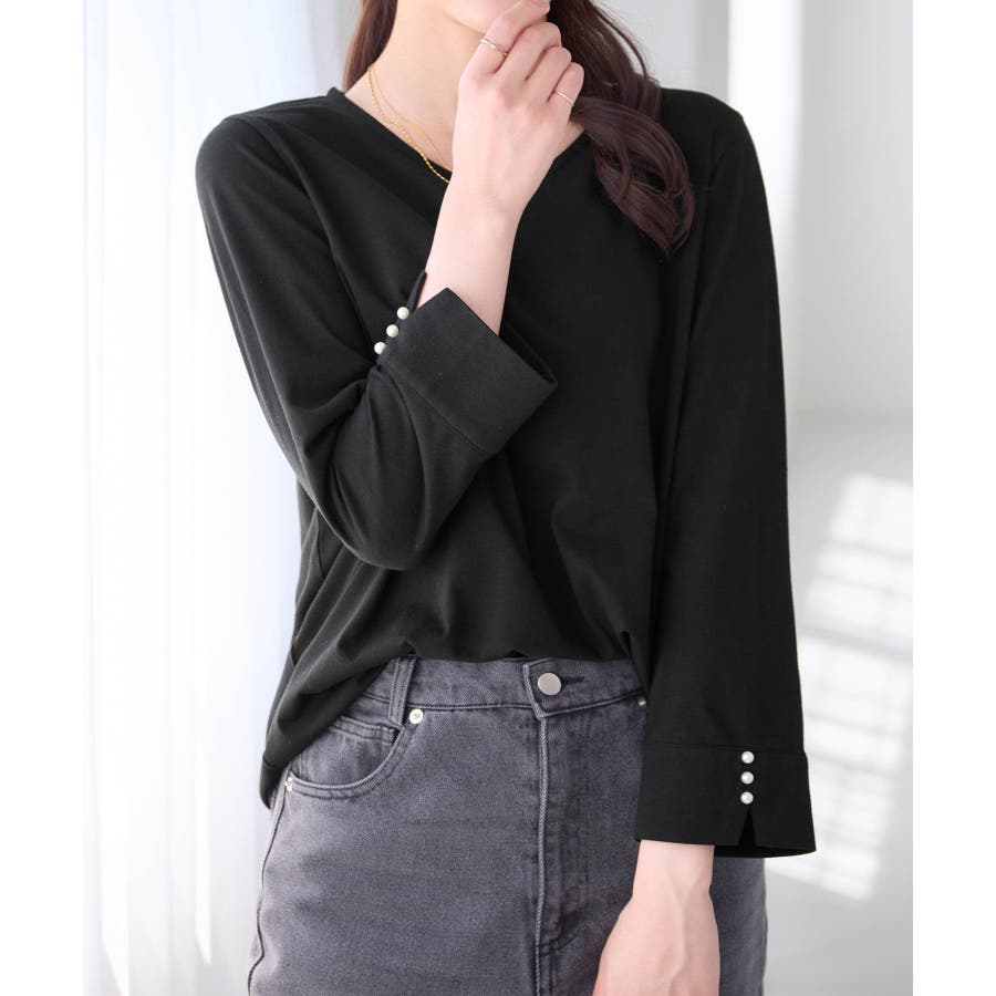 袖のパール調ボタンがワンポイントの可愛くて優秀なトップス。肌に優しい綿混素材で着心地楽ちん!