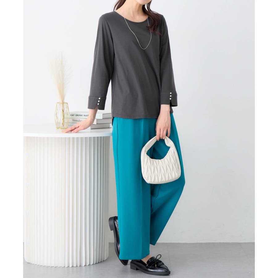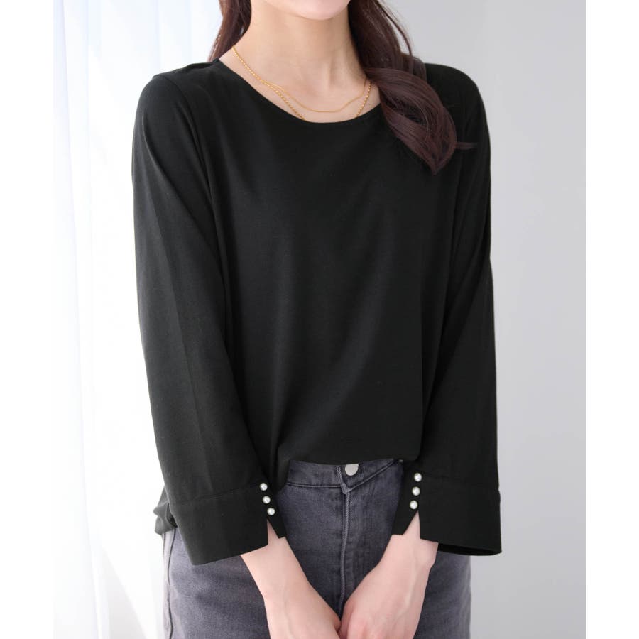 ・シンプルデザインのTシャツに施したパール調ビーズが上品なアクセントをプラス