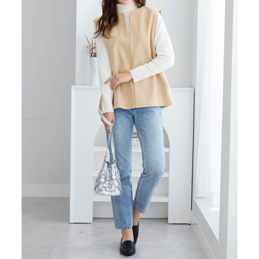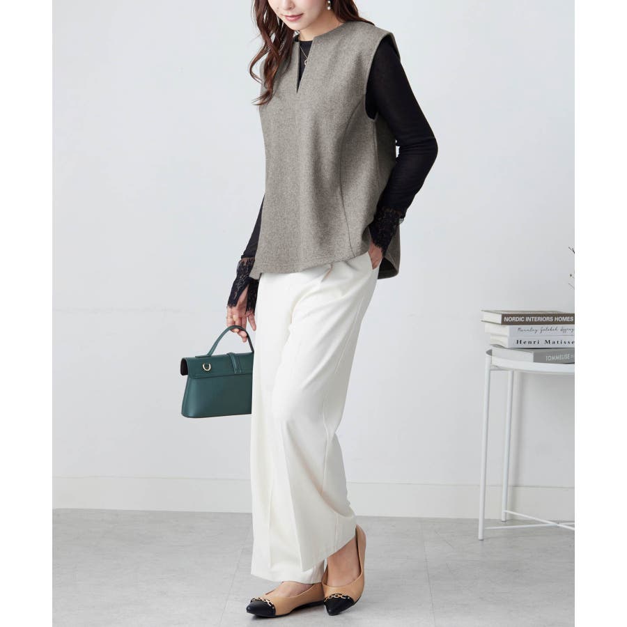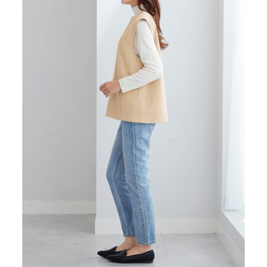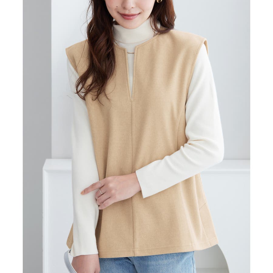 深めスリットとすっきりシルエットで、レイヤードスタイルが映える大人のベスト。