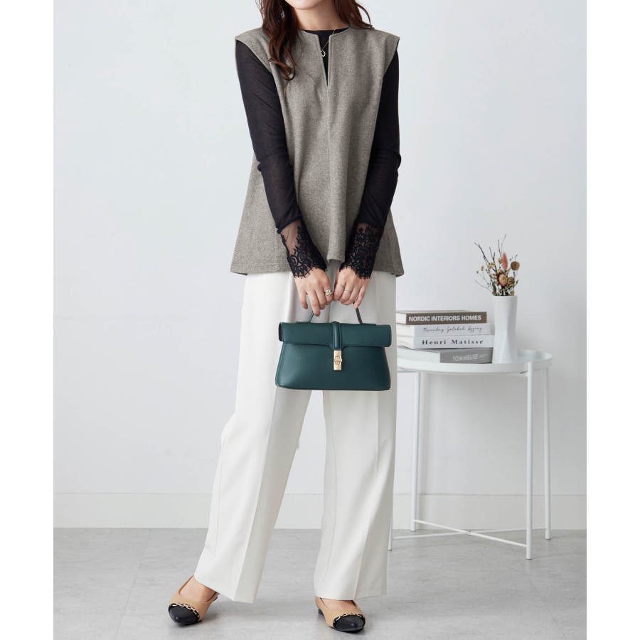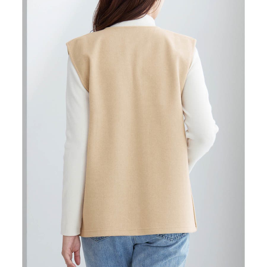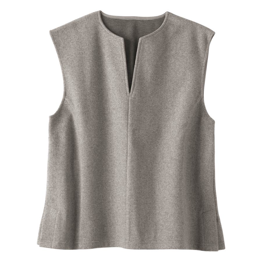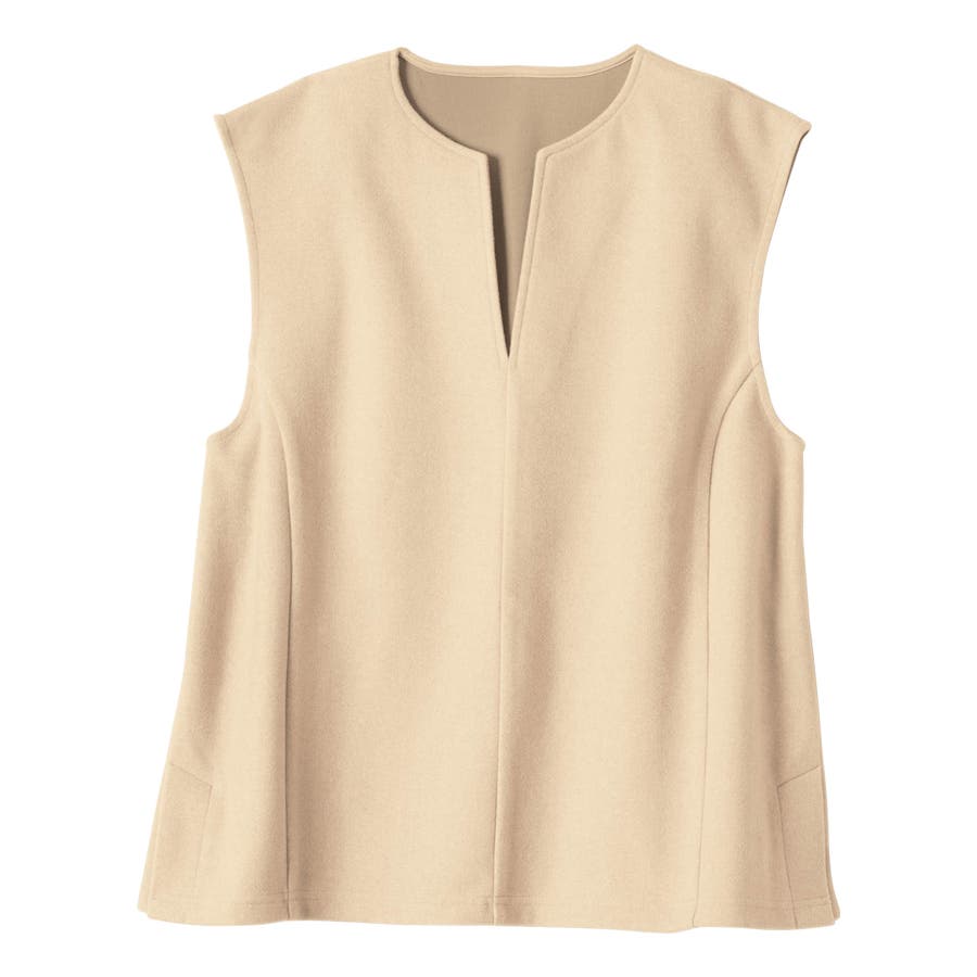 深めスリットとすっきりシルエットで、レイヤードスタイルが映える大人のベスト。