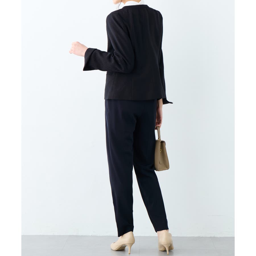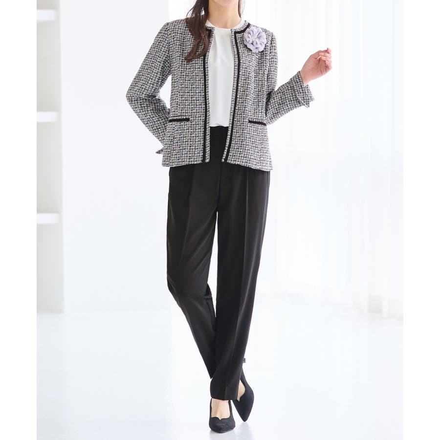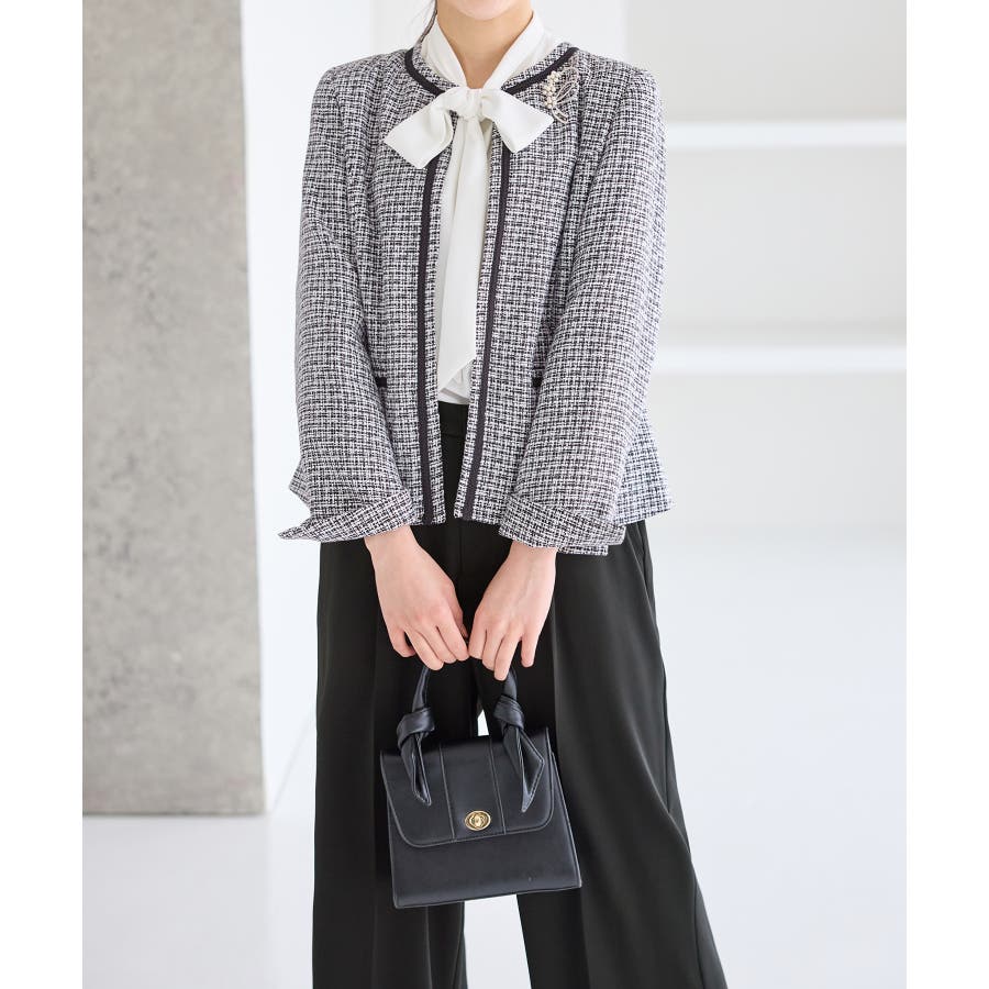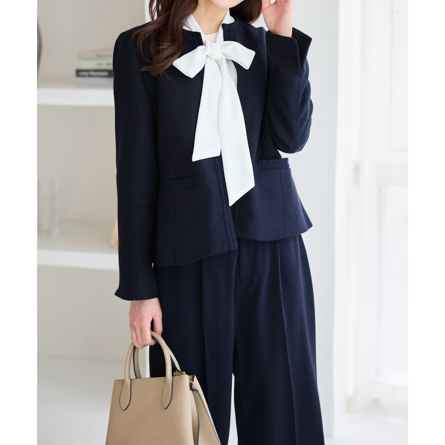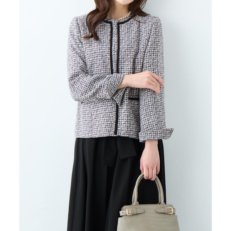 ・ツイード素材&シンプルなノーカラーデザインが大人上品なジャケット
