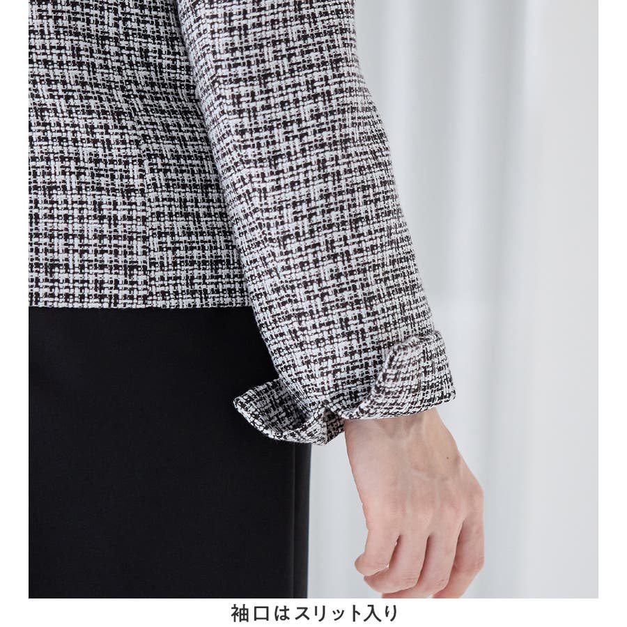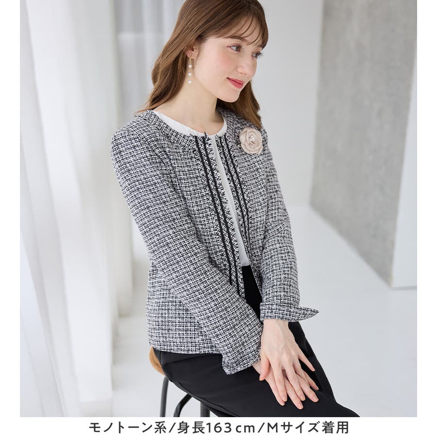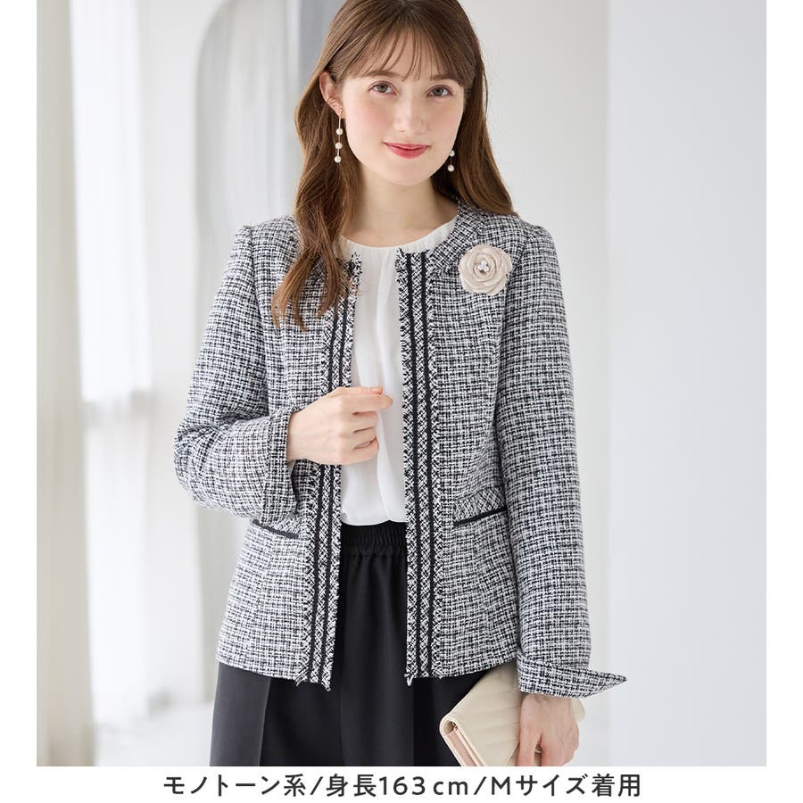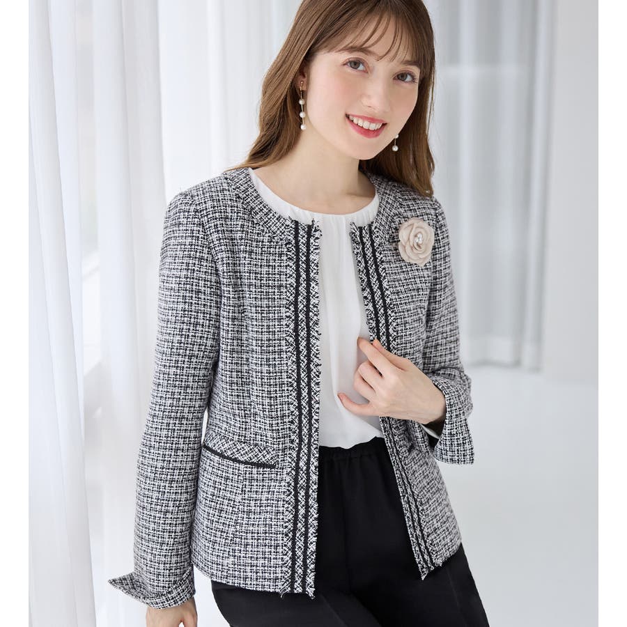 ・高級感のあるツイード素材×ノーカラーで、大人上品&シンプルな装いに。