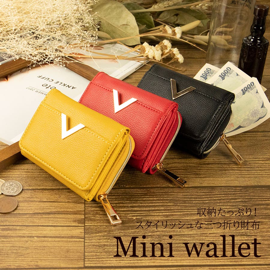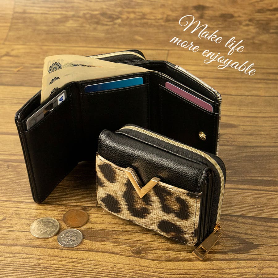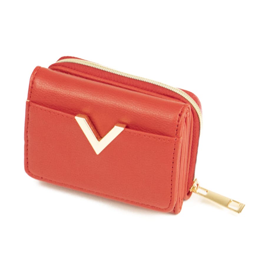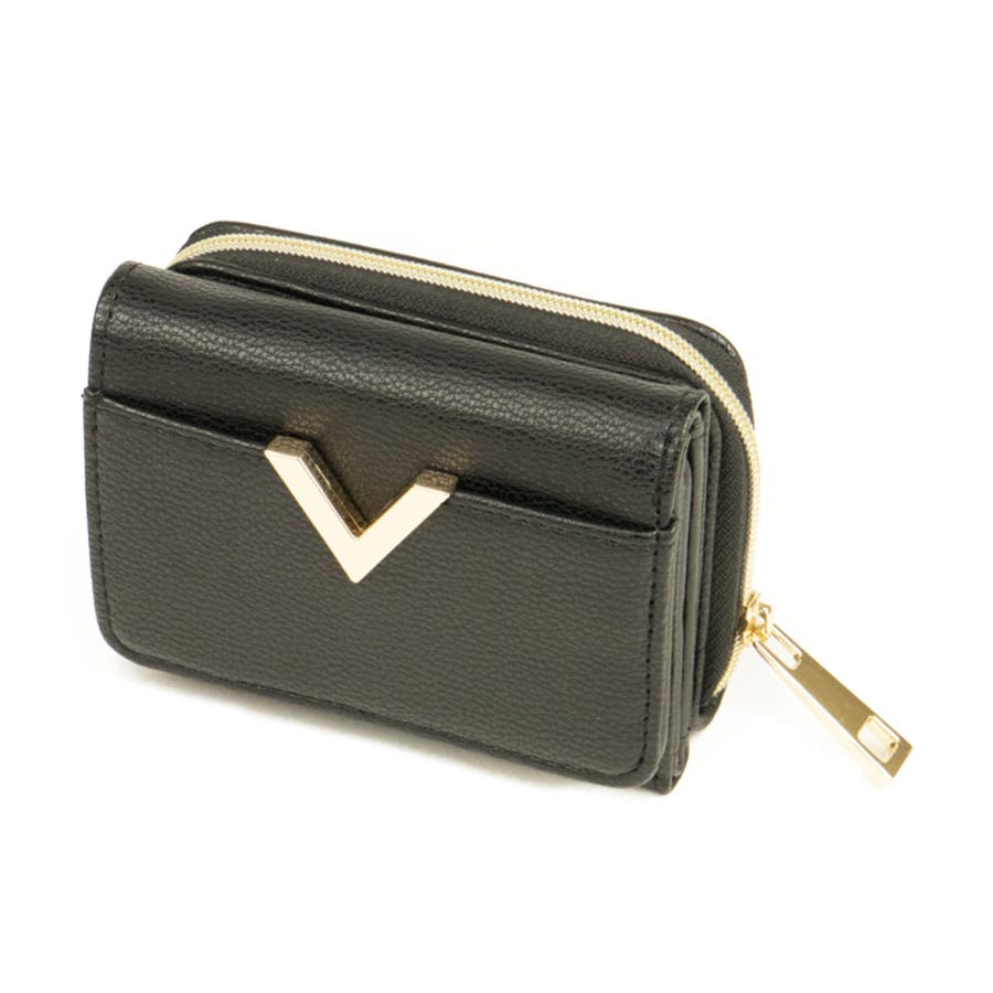 フロントのV字金具がデザインを引き締めるスタイリッシュなデザインの三つ折り財布。