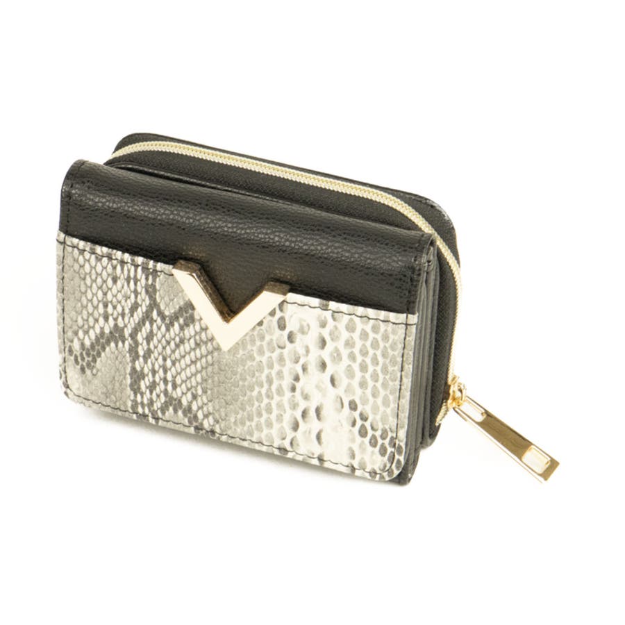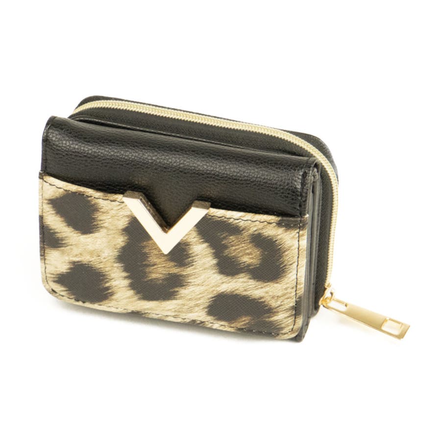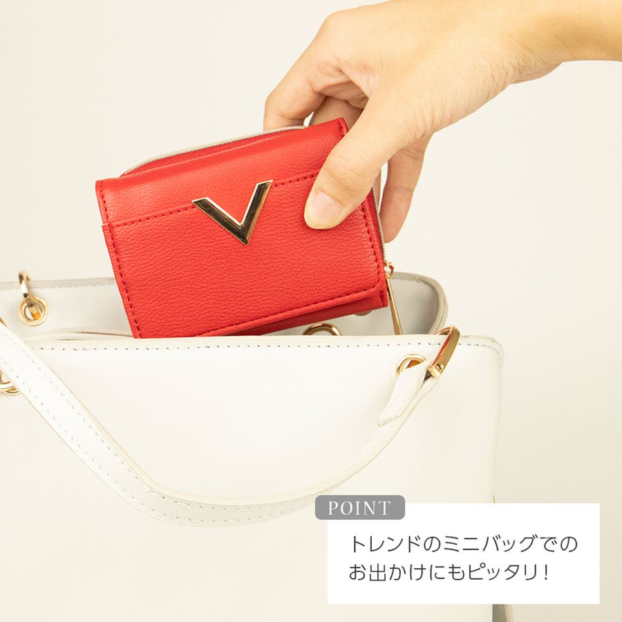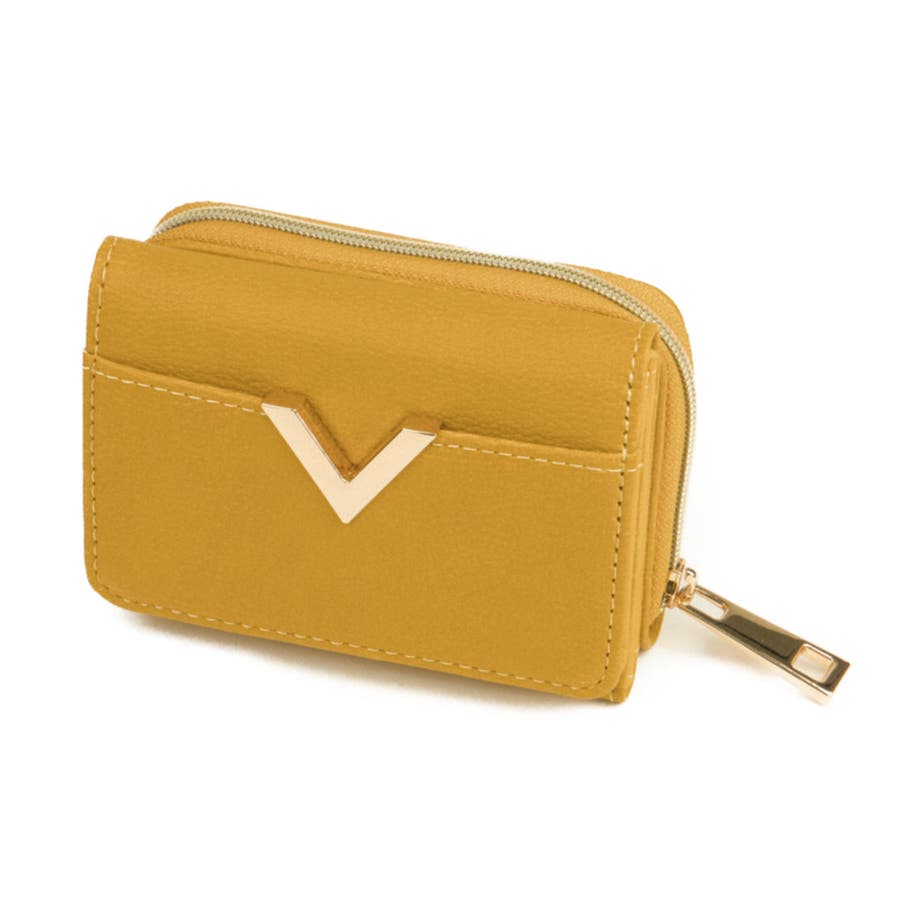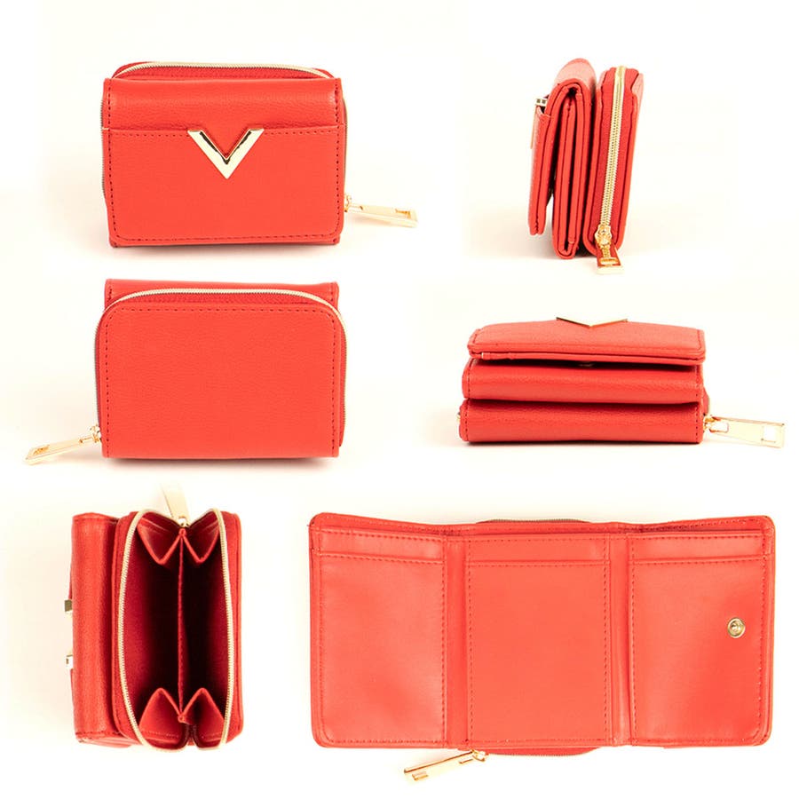 フロントのV字金具がデザインを引き締めるスタイリッシュなデザインの三つ折り財布。