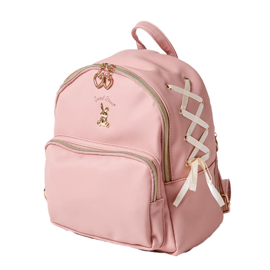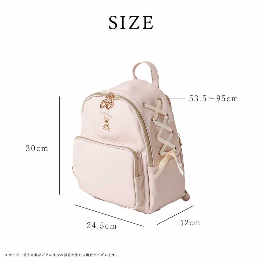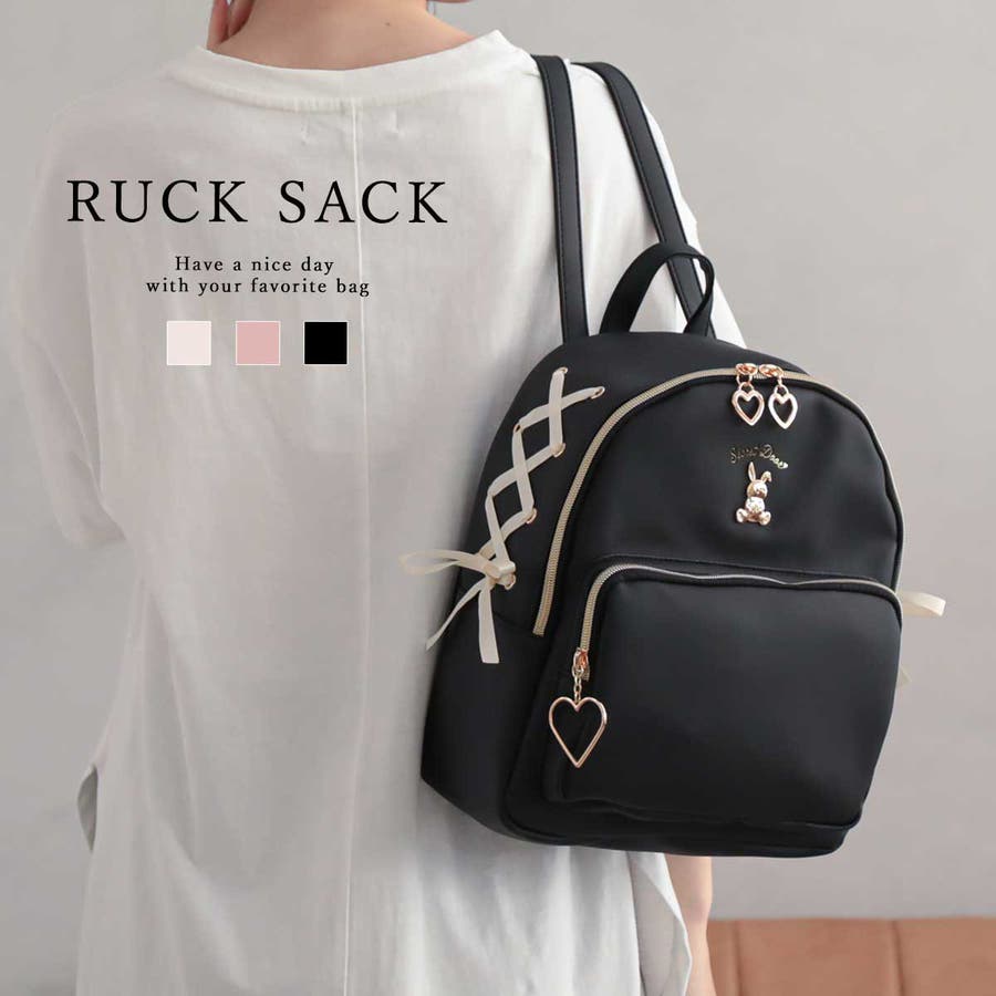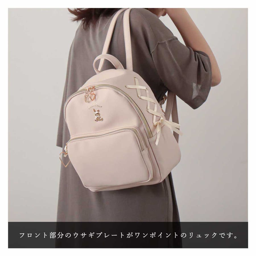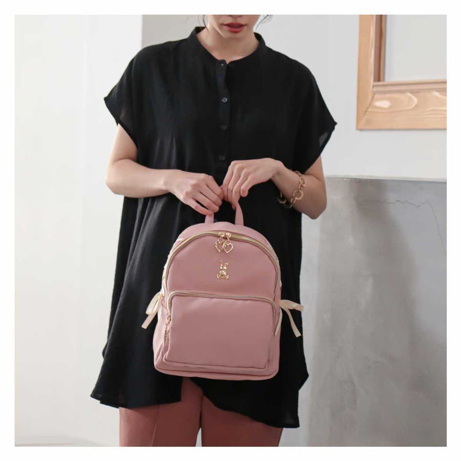 フロント部分のウサギプレートがワンポイントのリュックです。サイドに編み込まれたリボンがガーリーさを演出してくれます。ファスナーはさりげなく、女の子が大好きなハートチャームです。500mlのペットボトルが入る収納力も魅力です。背面から必要なものを取り出すことができるファスナー付きです。内側にはポケットが2つ付いているので、リップなどの小物を収納することができます。外側フロント部分にもファスナーポケットがあり、大切なものをすぐに取り出すことができます。かわいいファッションが好きな大人から、お子様まで幅広い年代の方々にお使い頂けます。