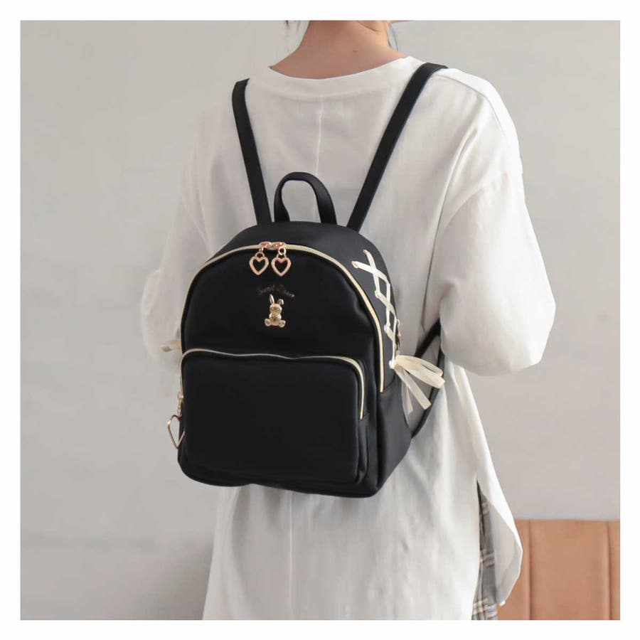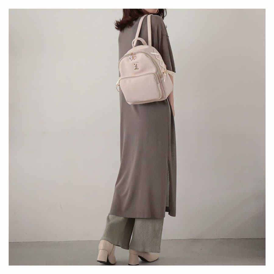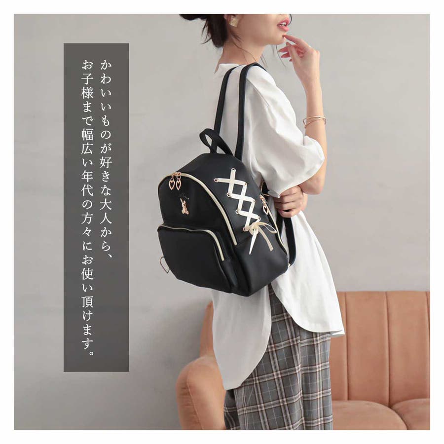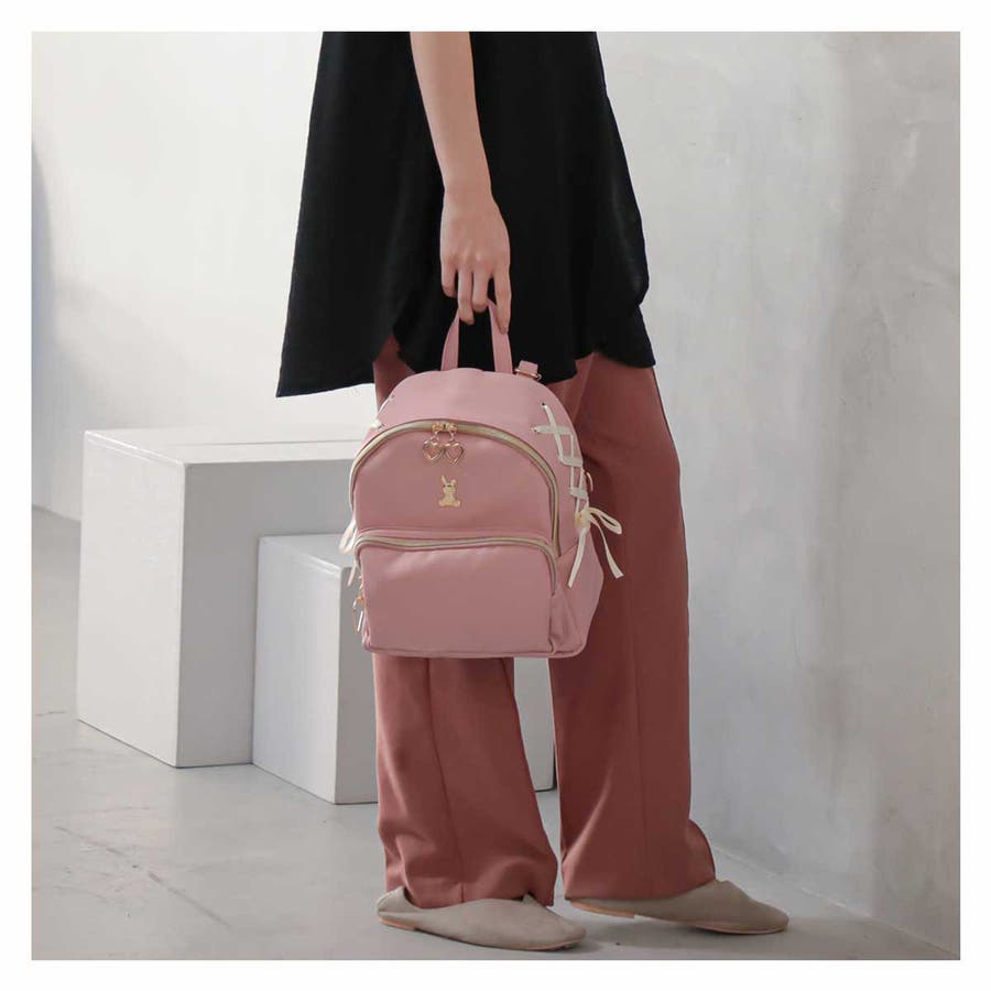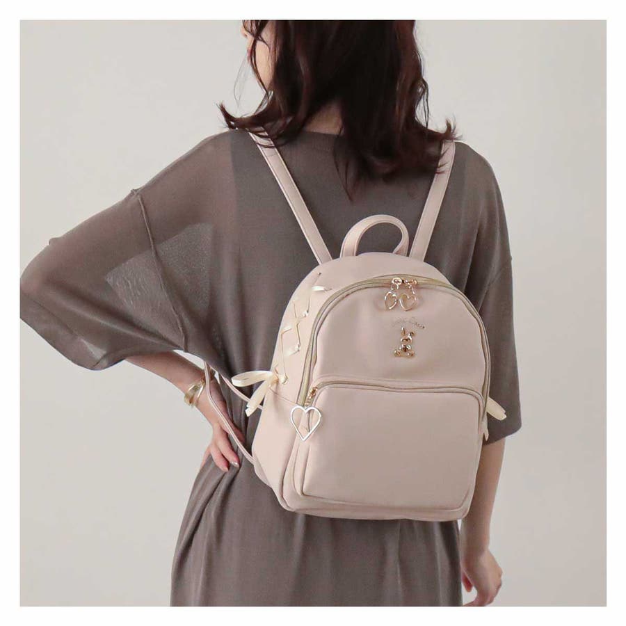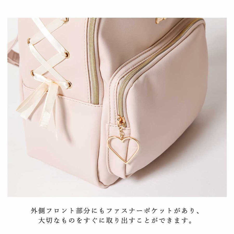 フロント部分のウサギプレートがワンポイントのリュックです。サイドに編み込まれたリボンがガーリーさを演出してくれます。ファスナーはさりげなく、女の子が大好きなハートチャームです。500mlのペットボトルが入る収納力も魅力です。背面から必要なものを取り出すことができるファスナー付きです。内側にはポケットが2つ付いているので、リップなどの小物を収納することができます。外側フロント部分にもファスナーポケットがあり、大切なものをすぐに取り出すことができます。かわいいファッションが好きな大人から、お子様まで幅広い年代の方々にお使い頂けます。