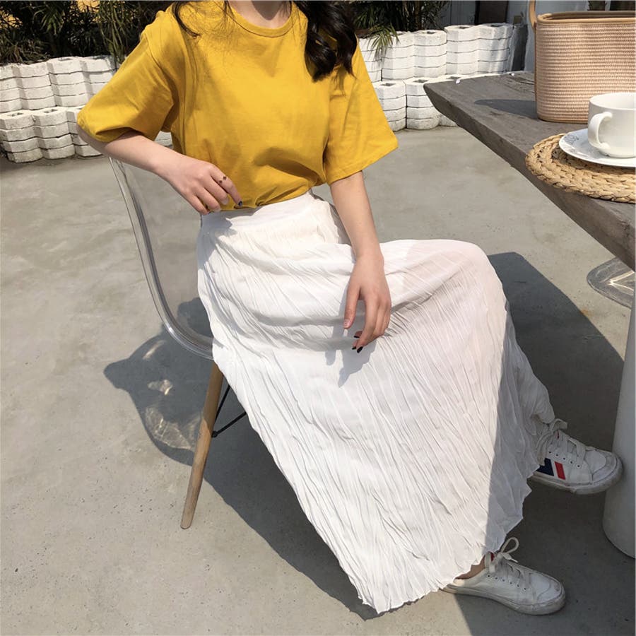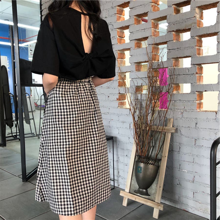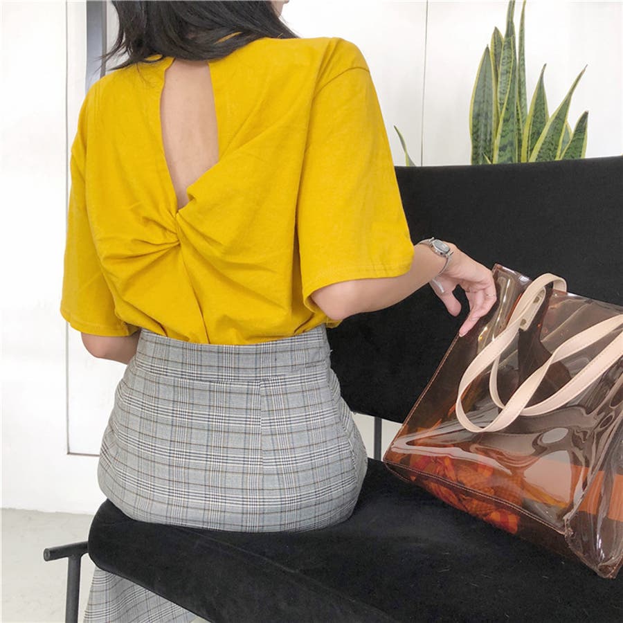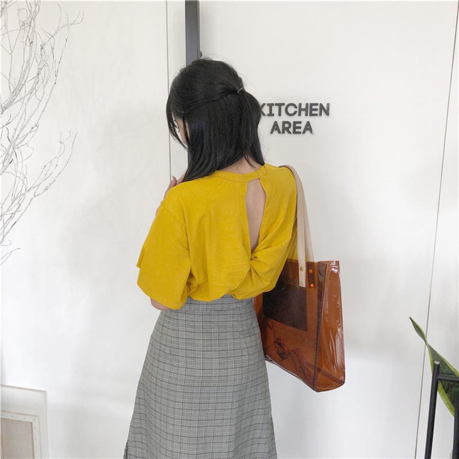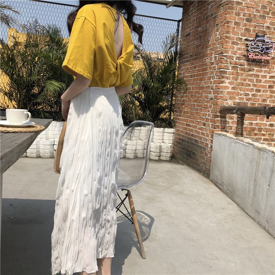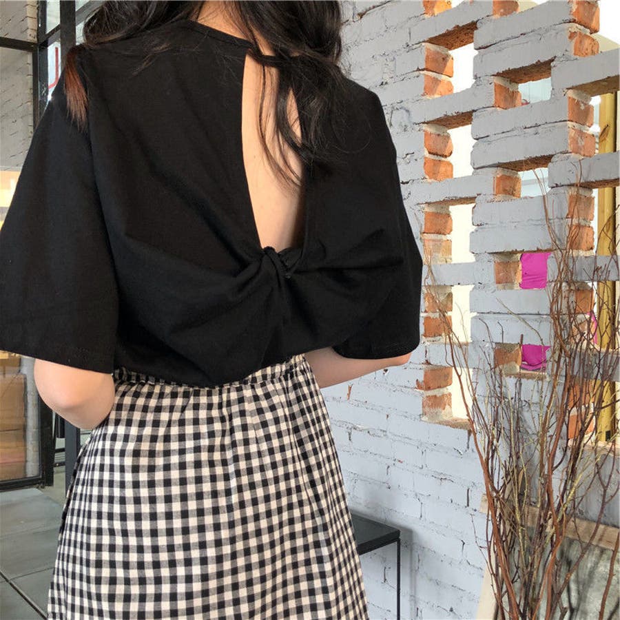 前から見るとシンプルなTシャツだから何にでも合わせやすい。生地もサラッとしててしわになりにくい。白はかなり透け感ありインナー必須!背中の空き具合は控えめなのでいやらしさはない。普通に可愛い。
