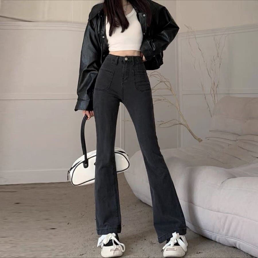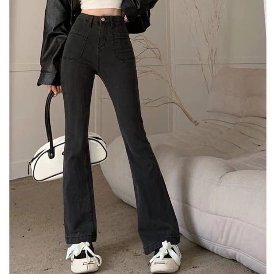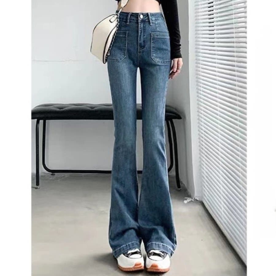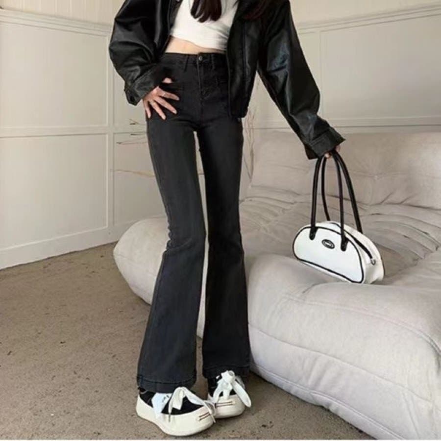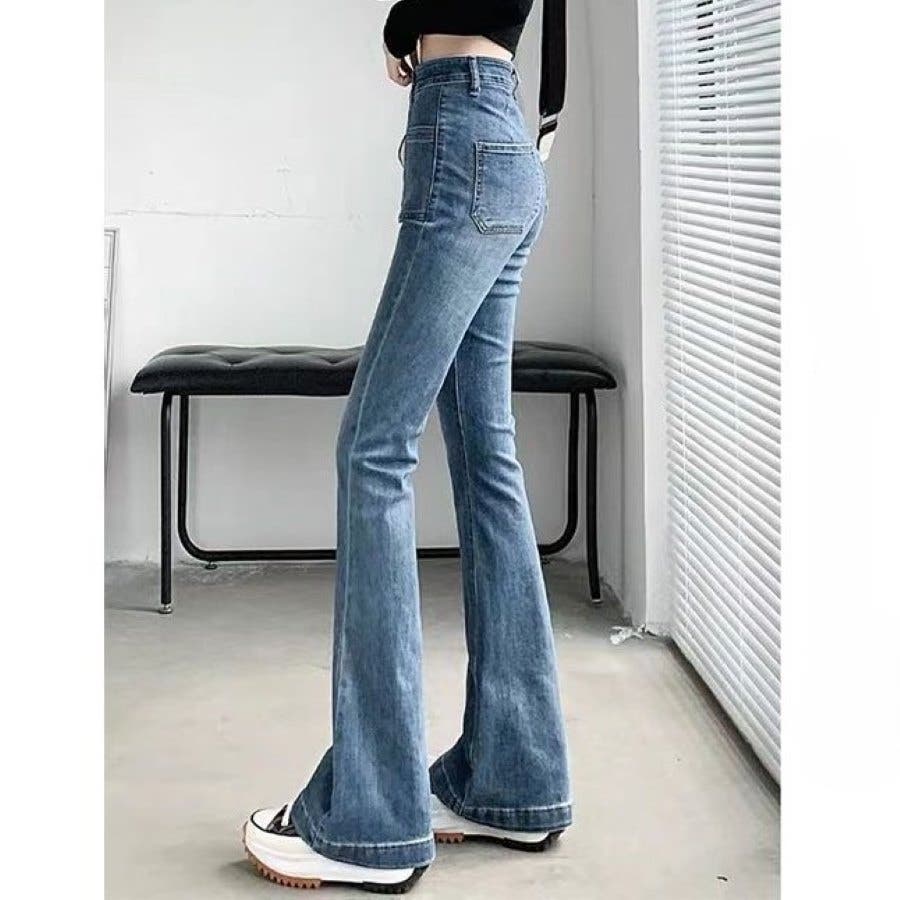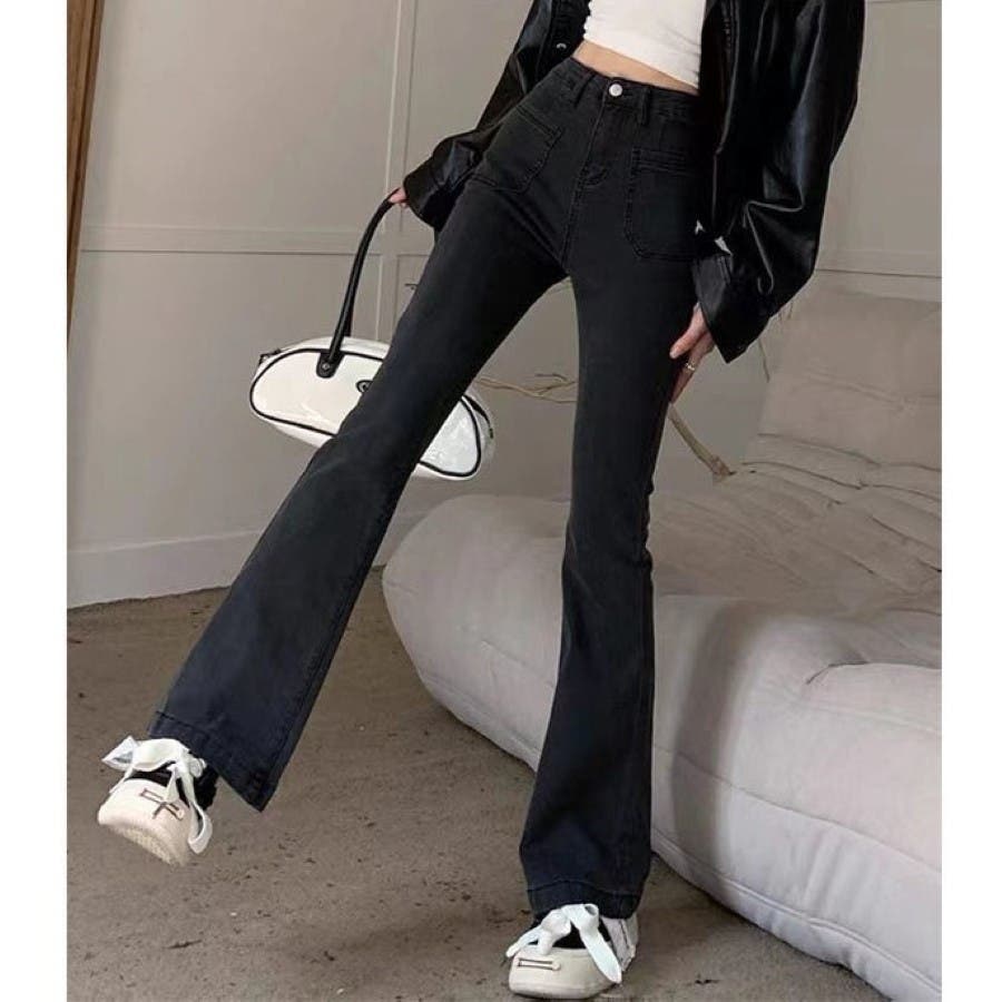 ベルト付きストレッチデニムフレアパンツ 春 夏