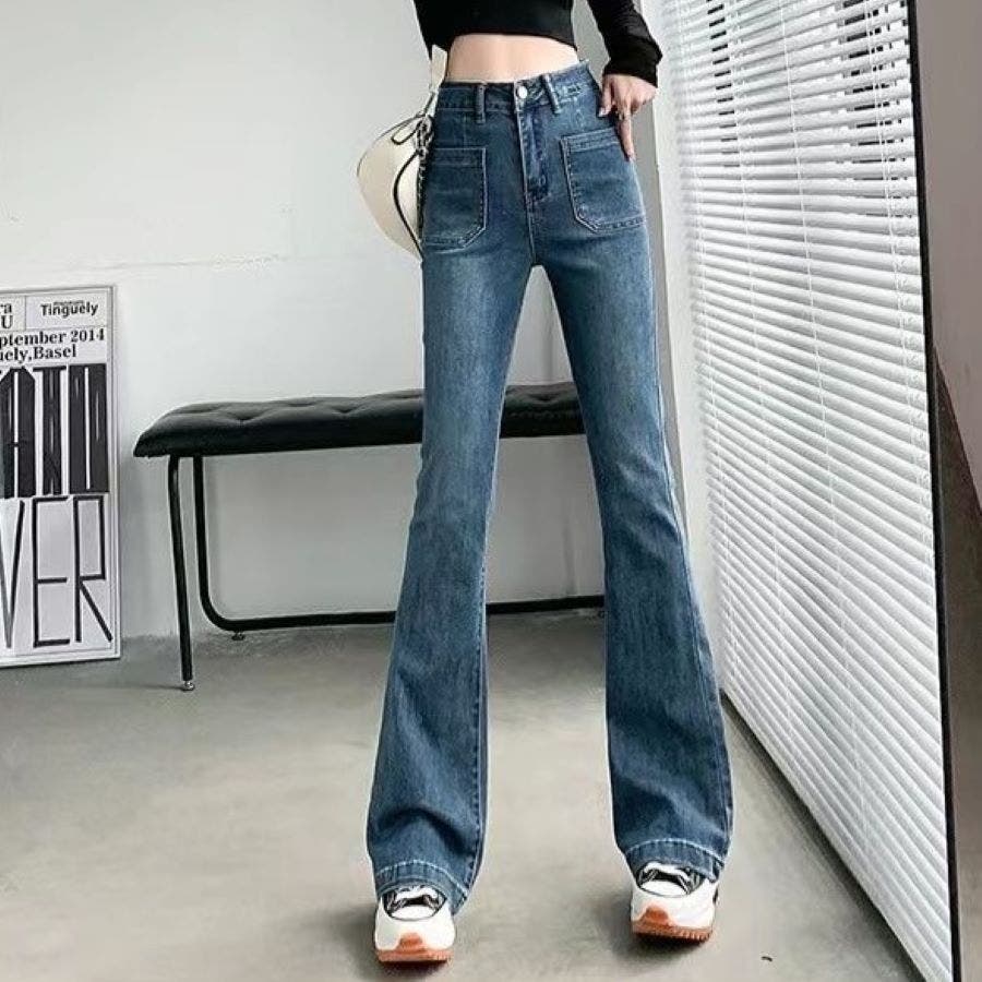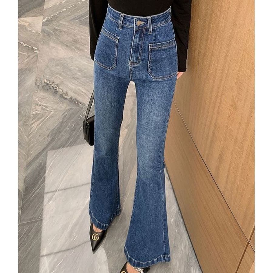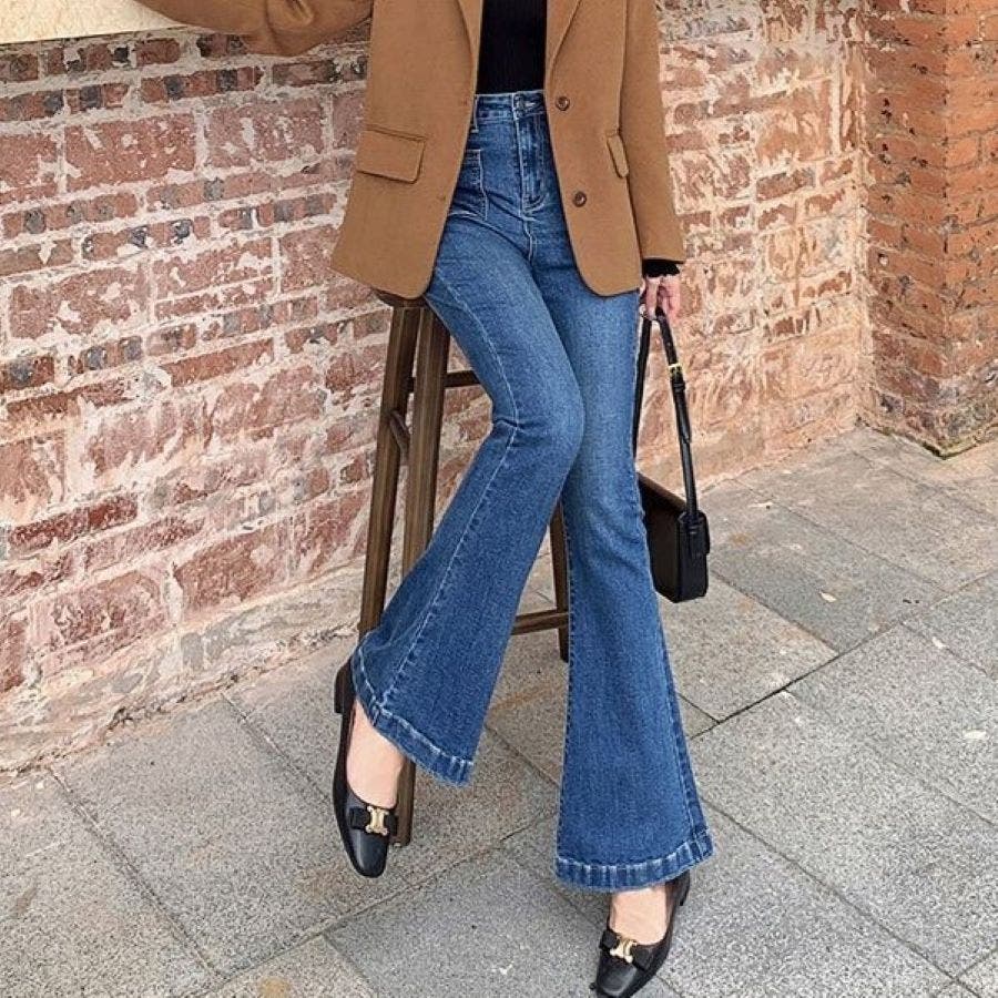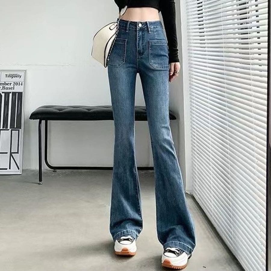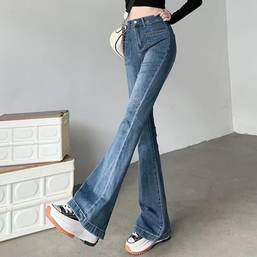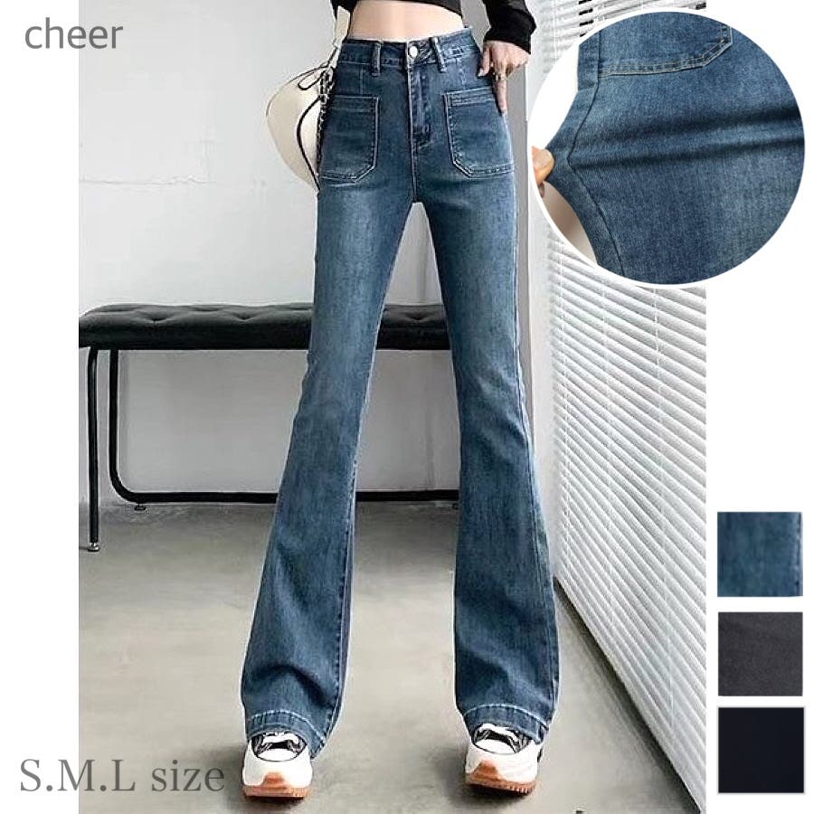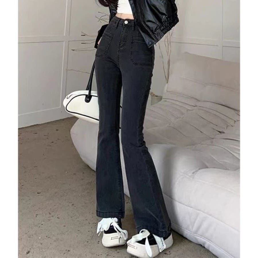 ベルト付きストレッチデニムフレアパンツ 春 夏