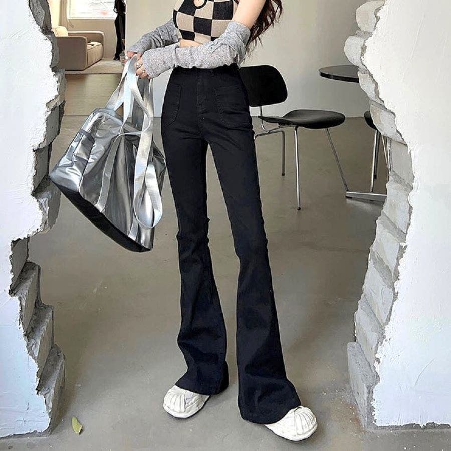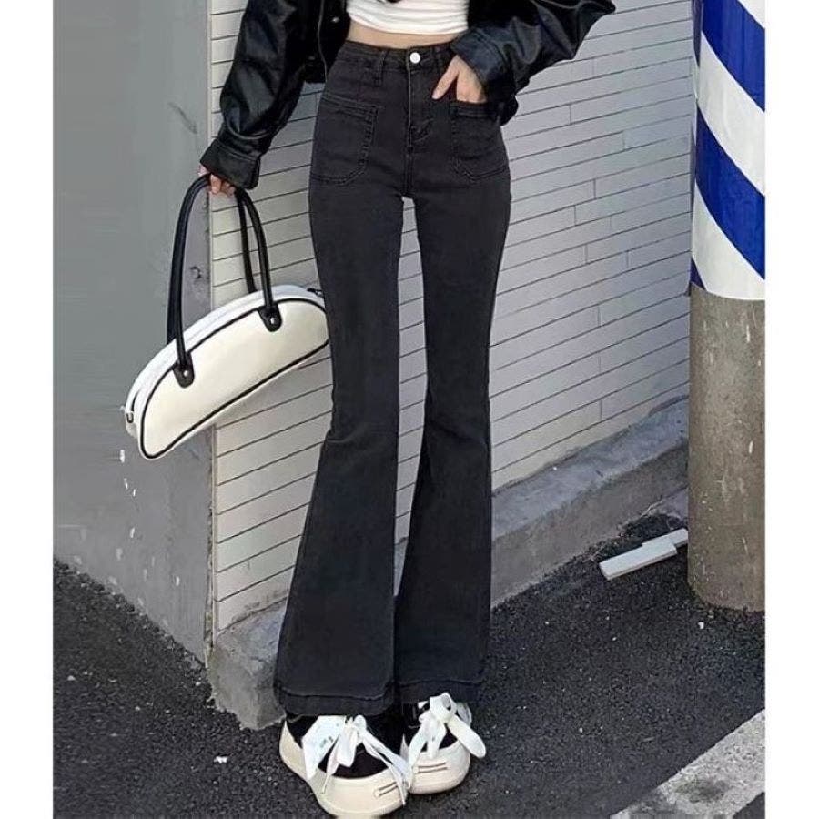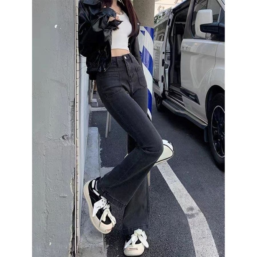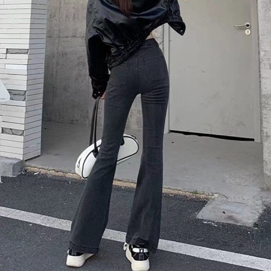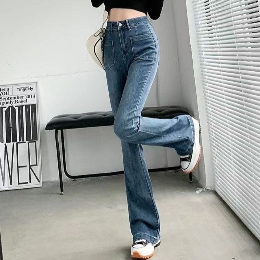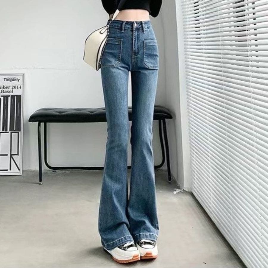 ベルト付きストレッチデニムフレアパンツ 春 夏