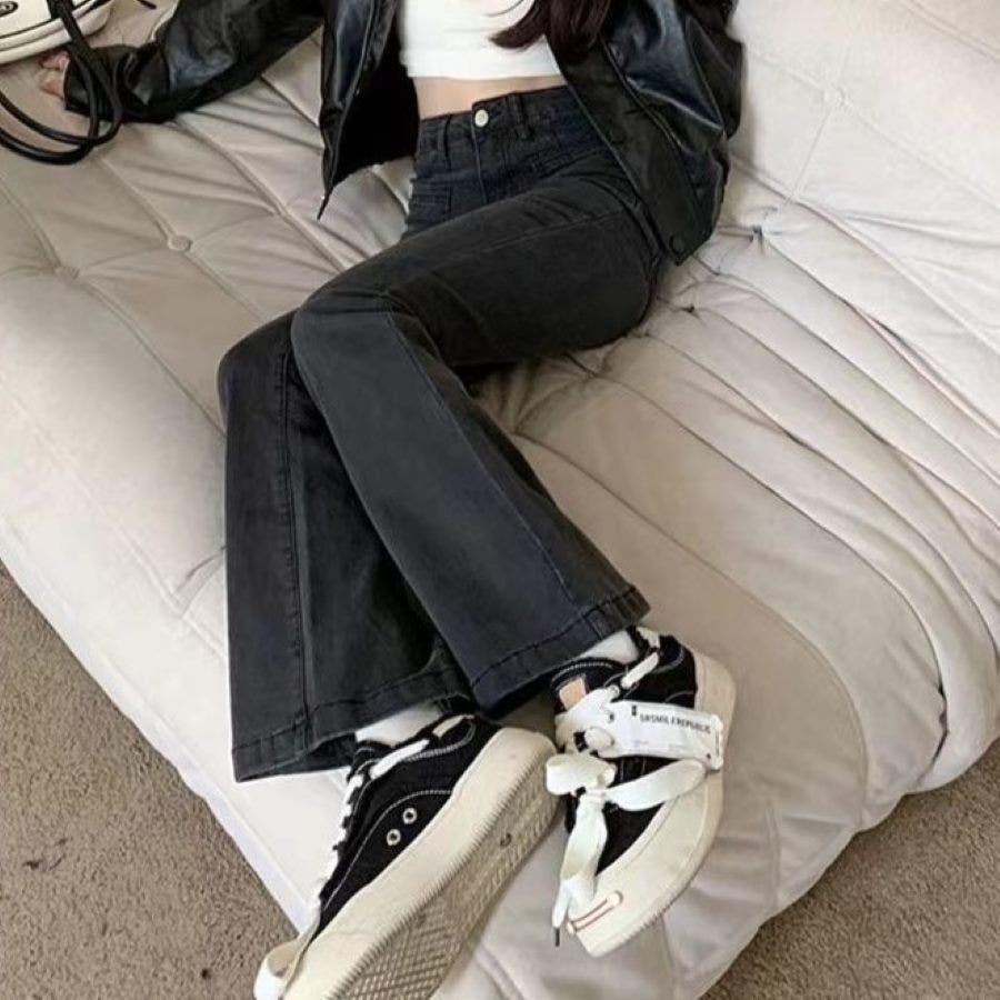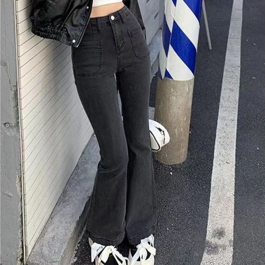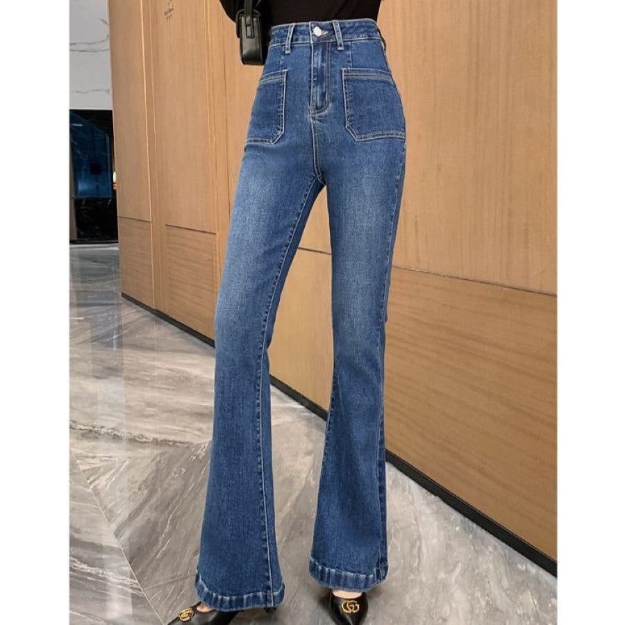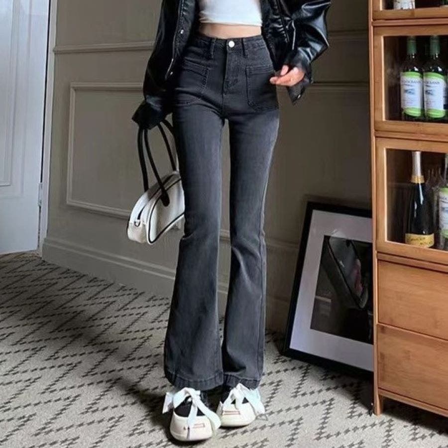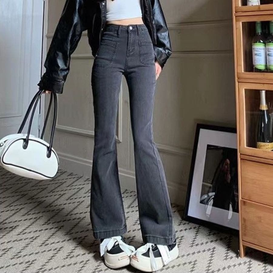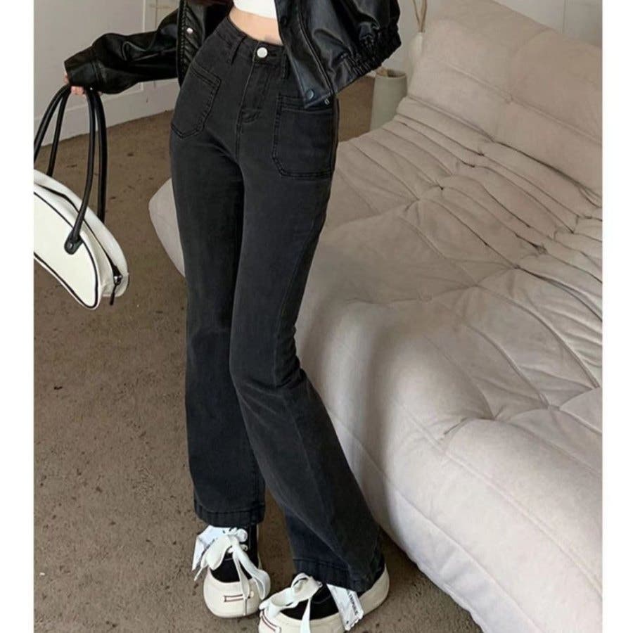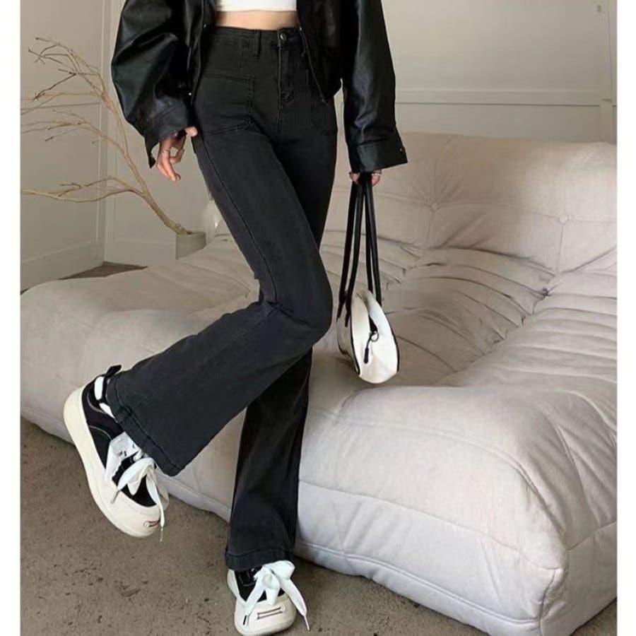 ベルト付きストレッチデニムフレアパンツ 春 夏