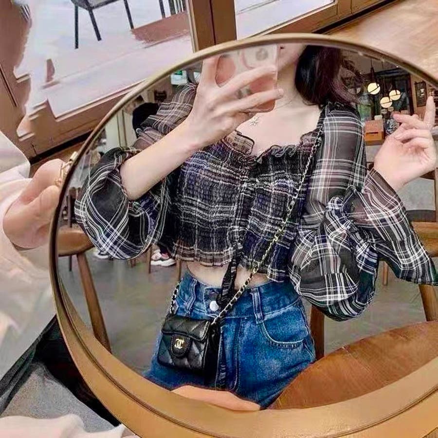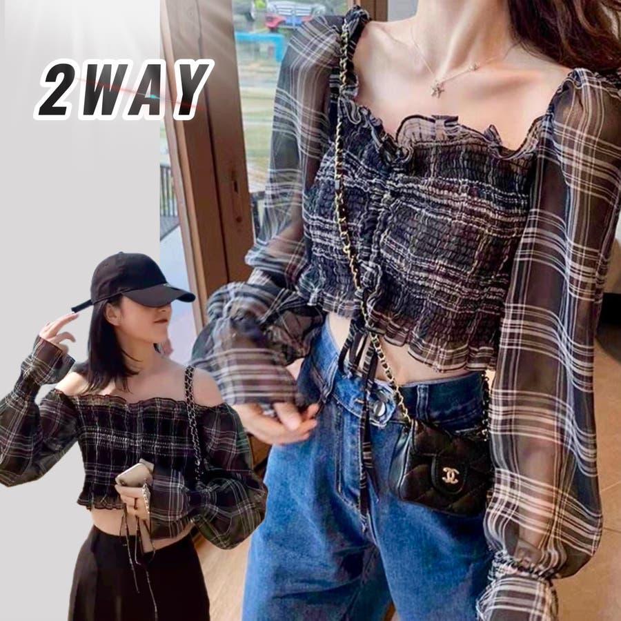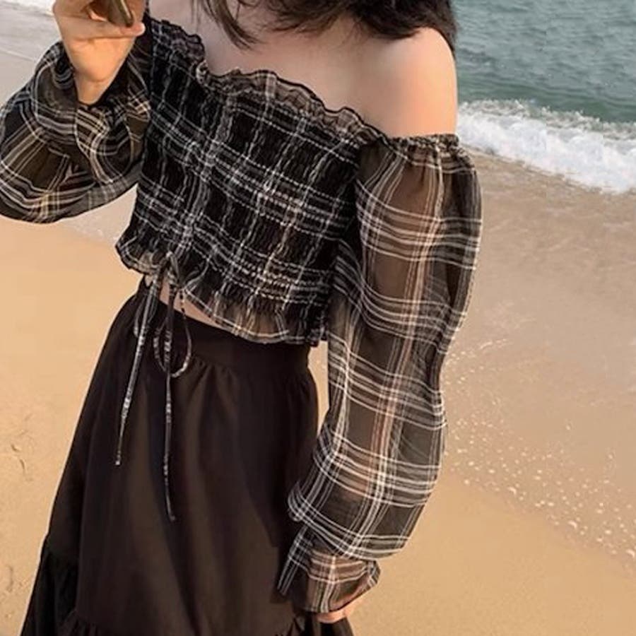 軽やかな透け感のあるシアー素材に、ブラックベースの上品なチェック柄をオン。