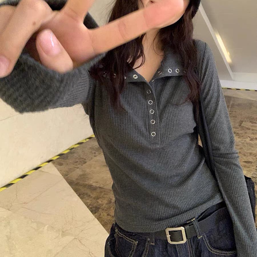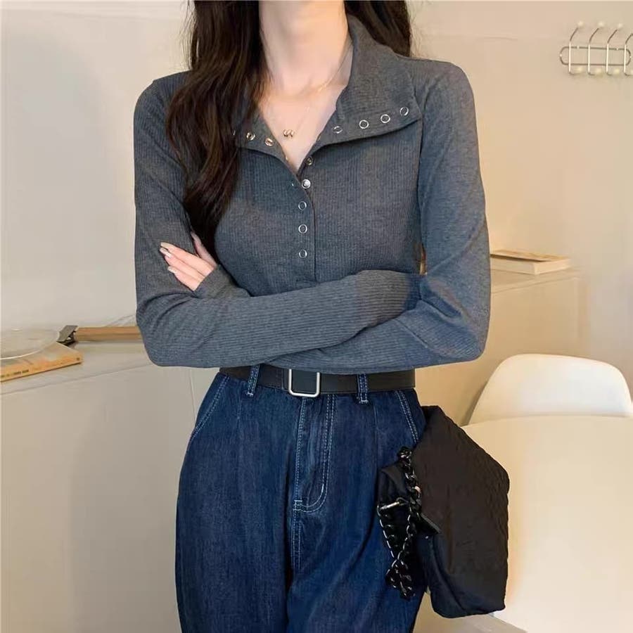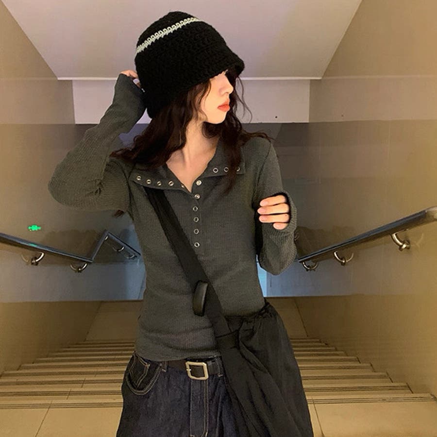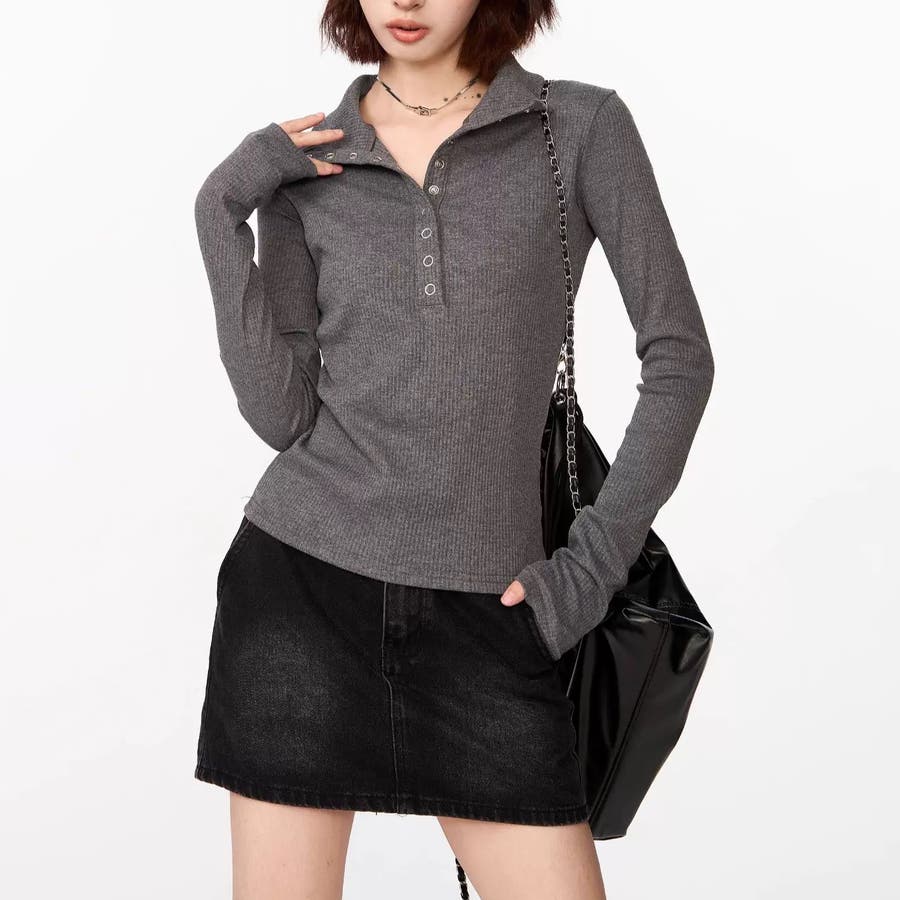 フロントのスナップボタンがアクセントになり、ハーフジップ風デザインで抜け感を演出。