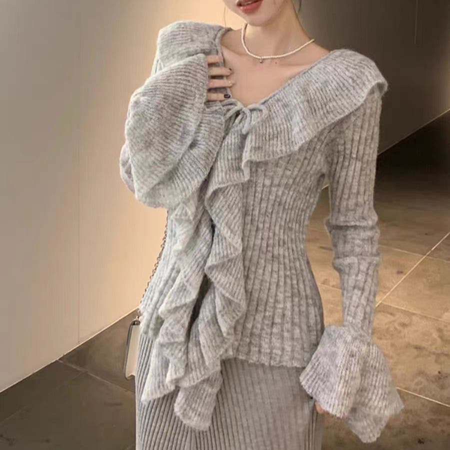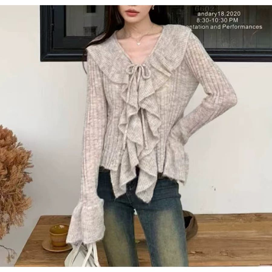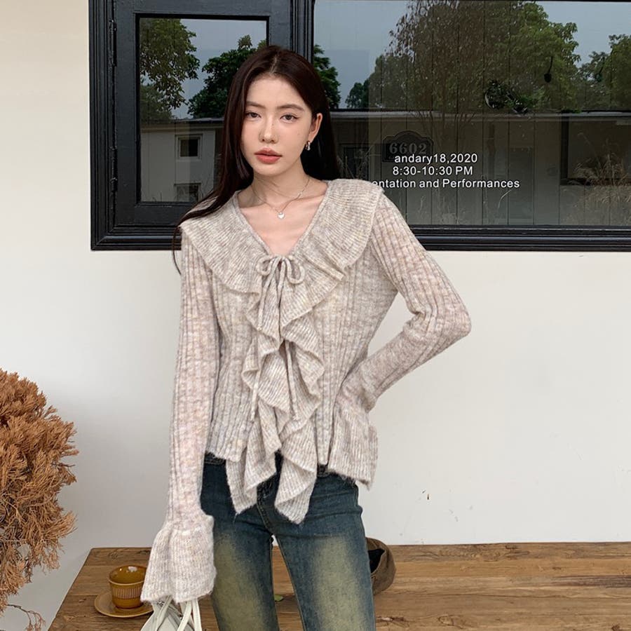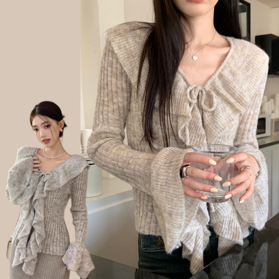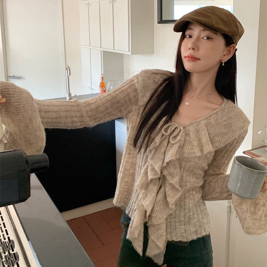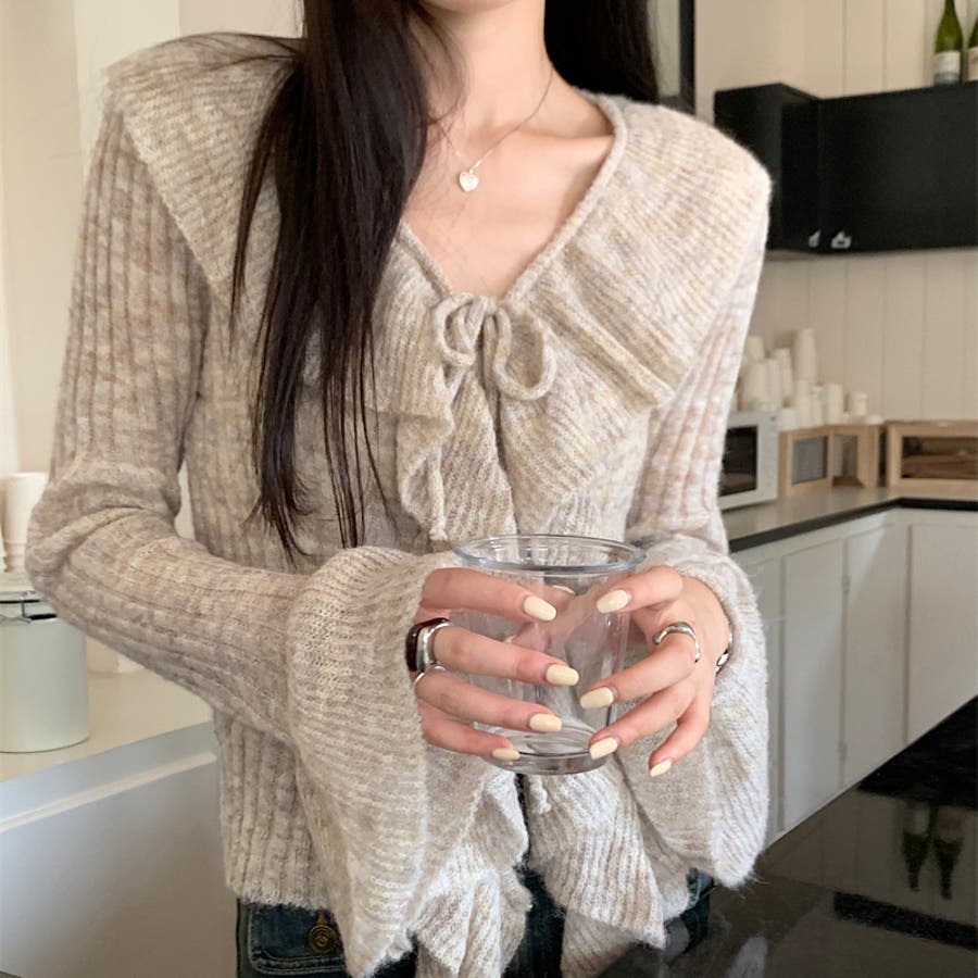 胸元のフリルとリボンがポイントのフェミニンなニットプルオーバー♡