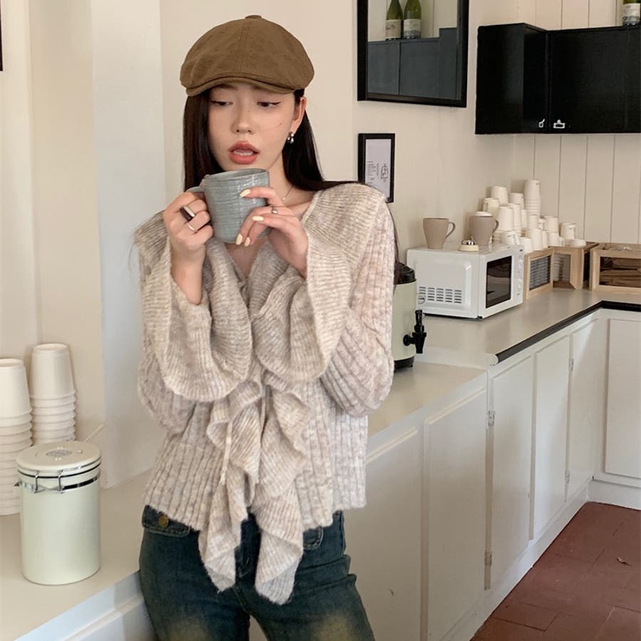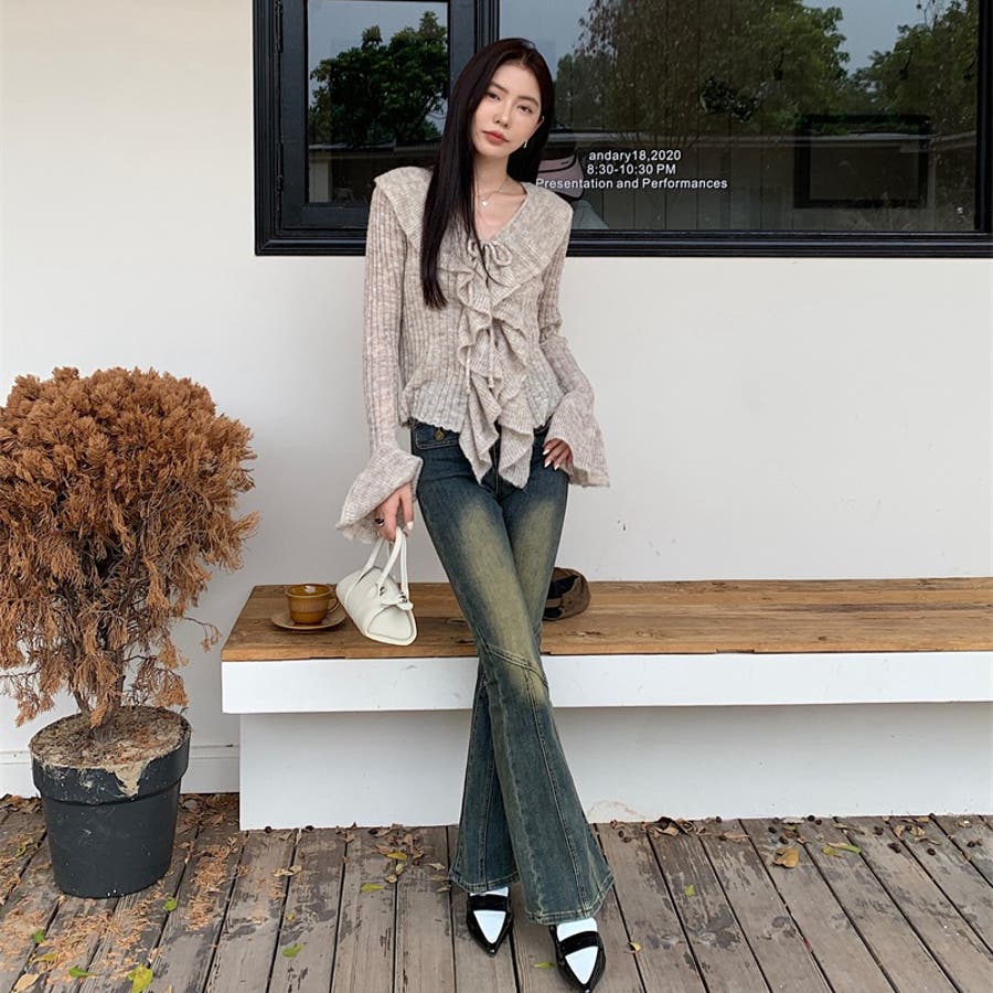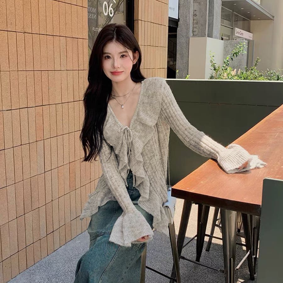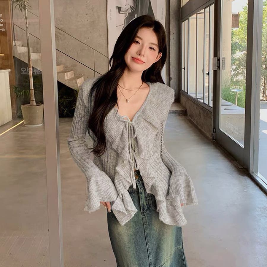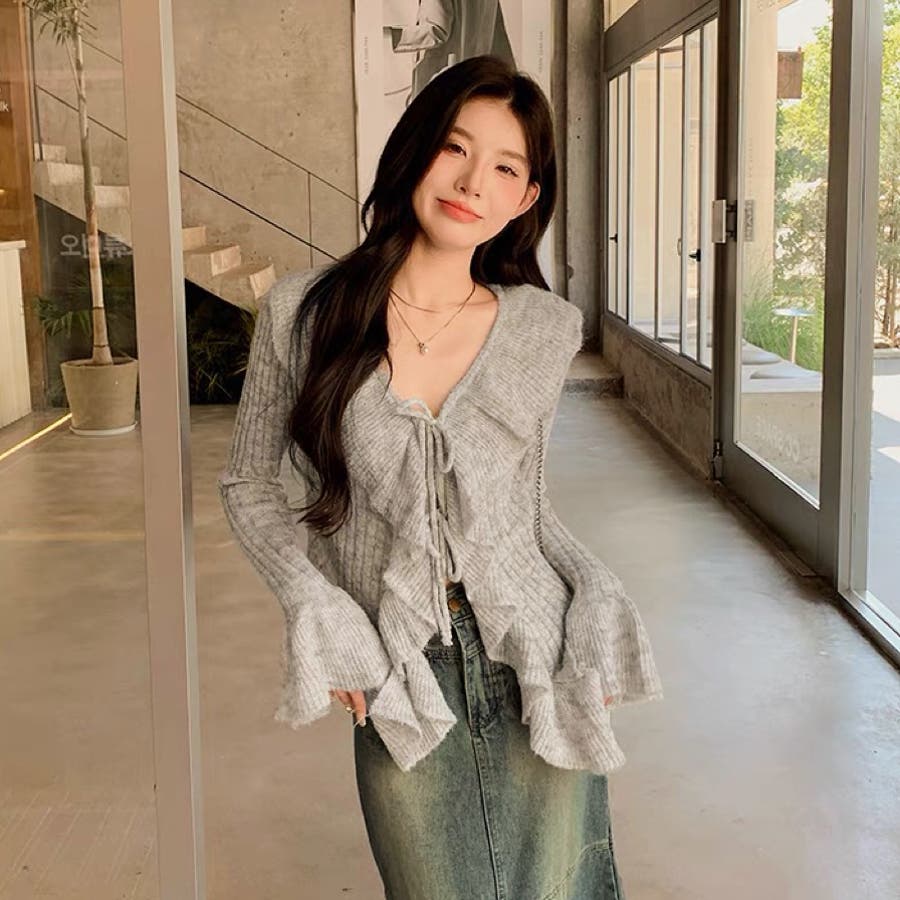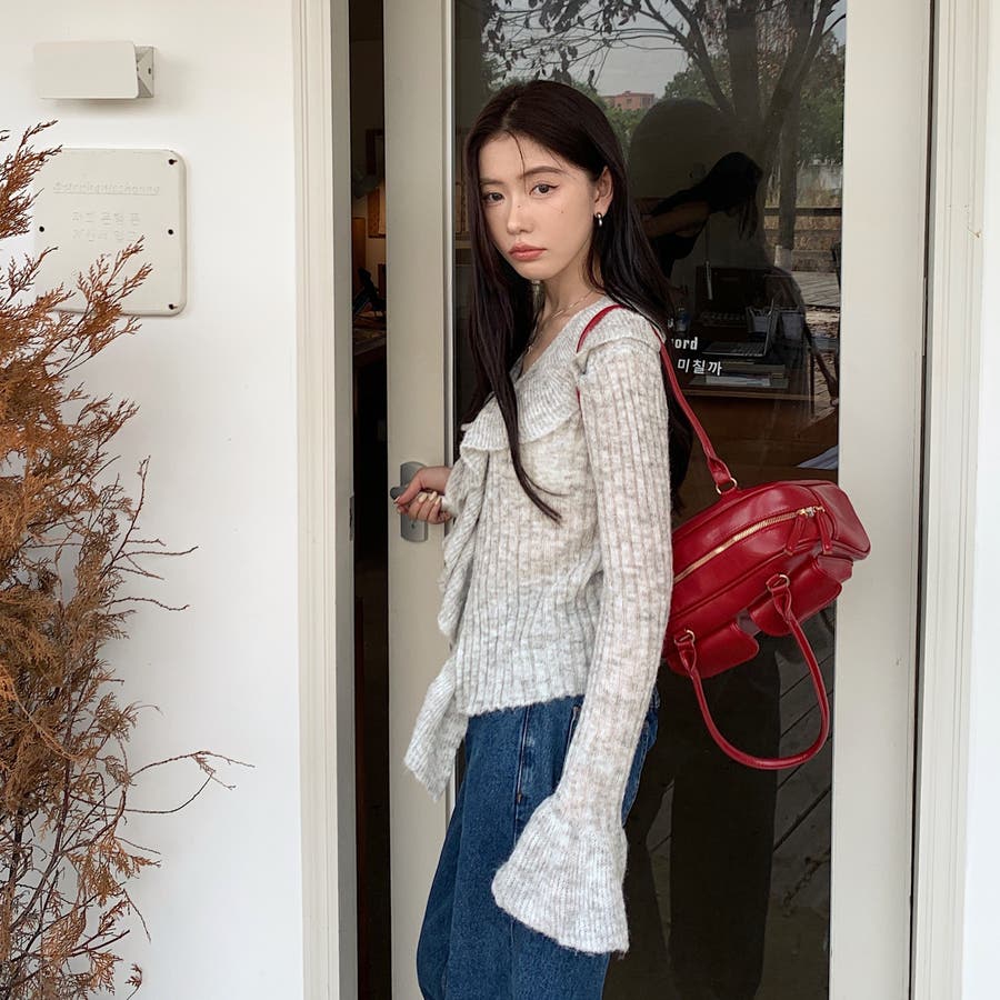 胸元のフリルとリボンがポイントのフェミニンなニットプルオーバー♡
