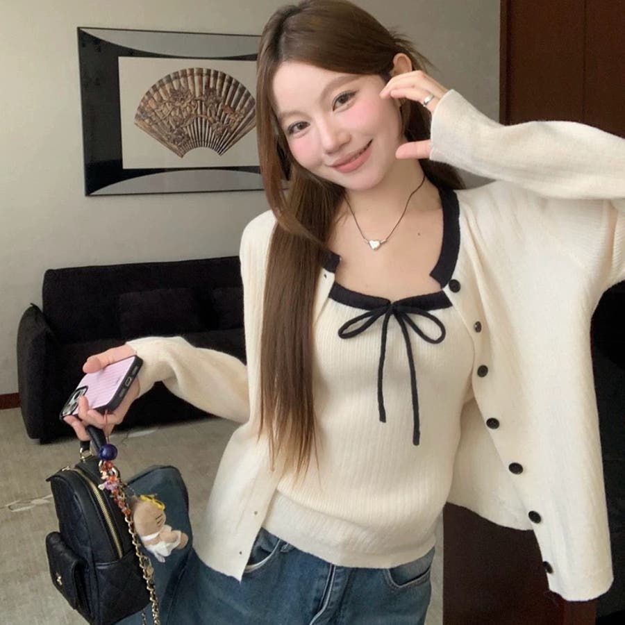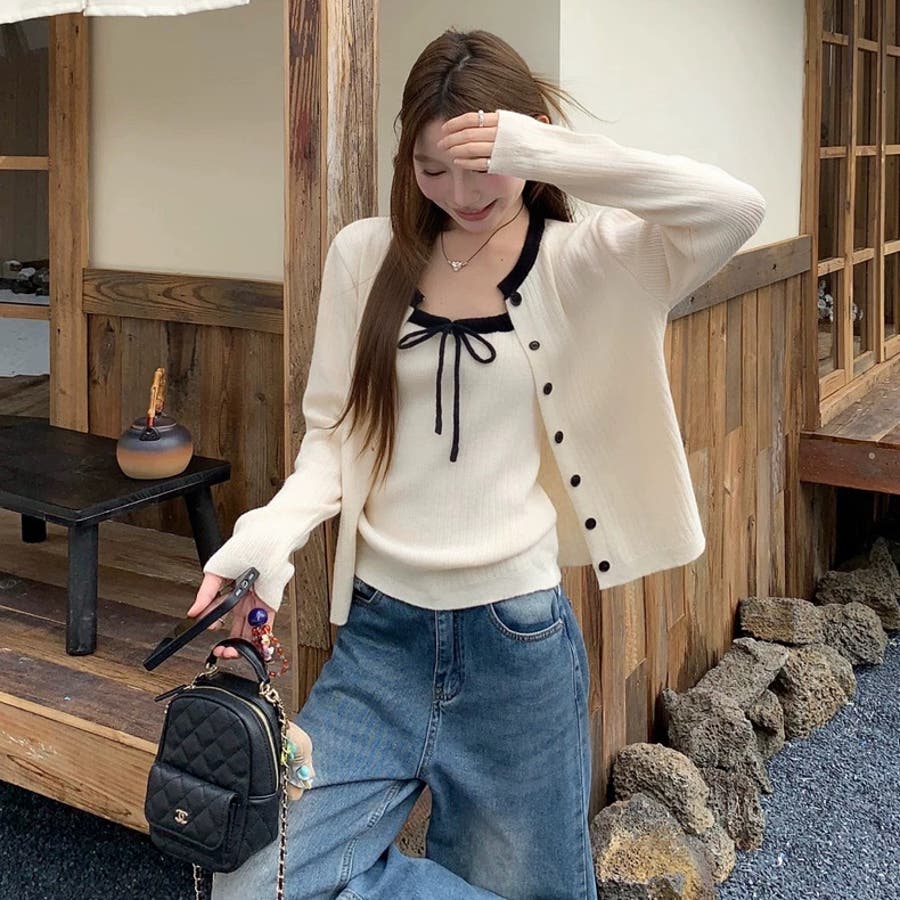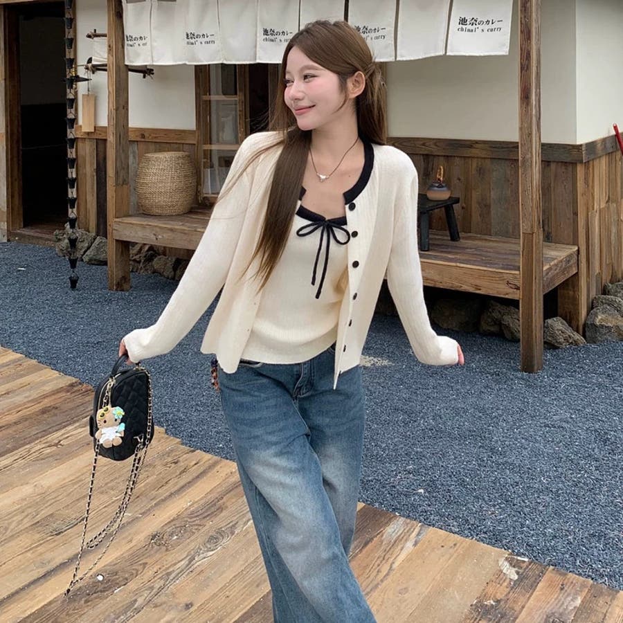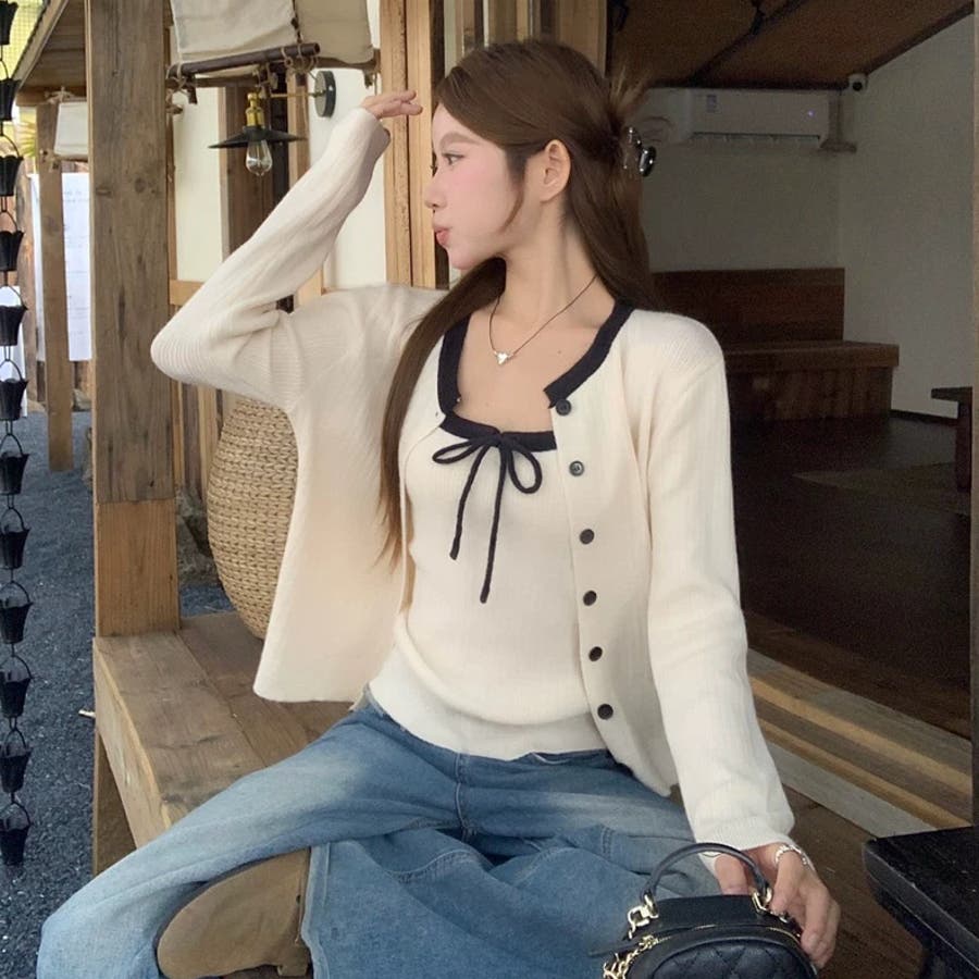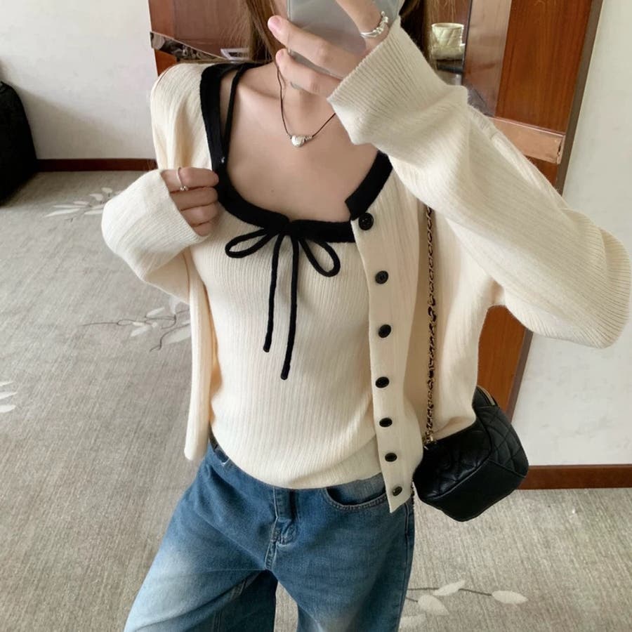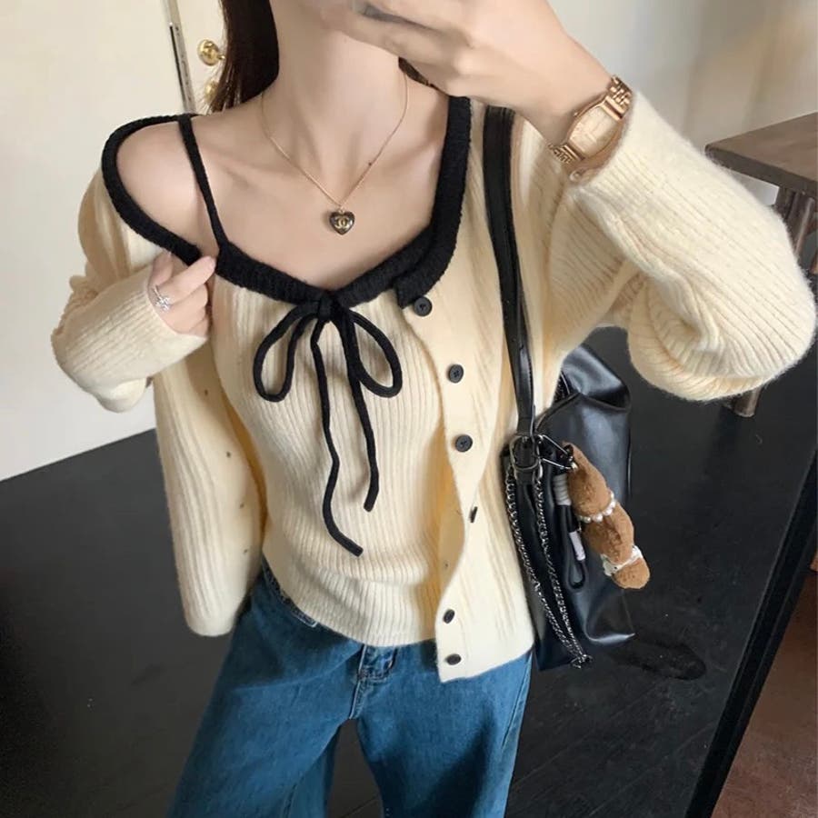 今季大人気の配色リボンニットキャミとカーディガンのセットアイテムが登場!