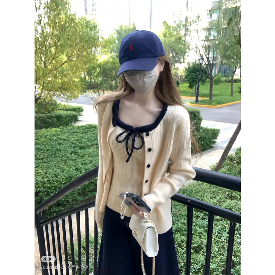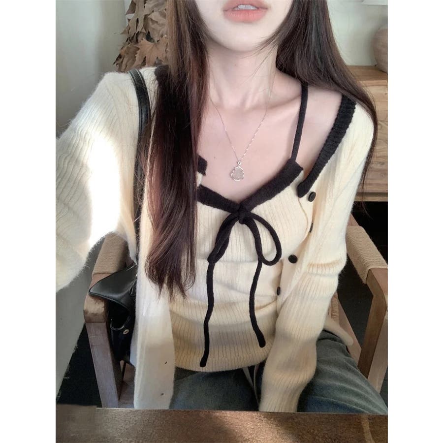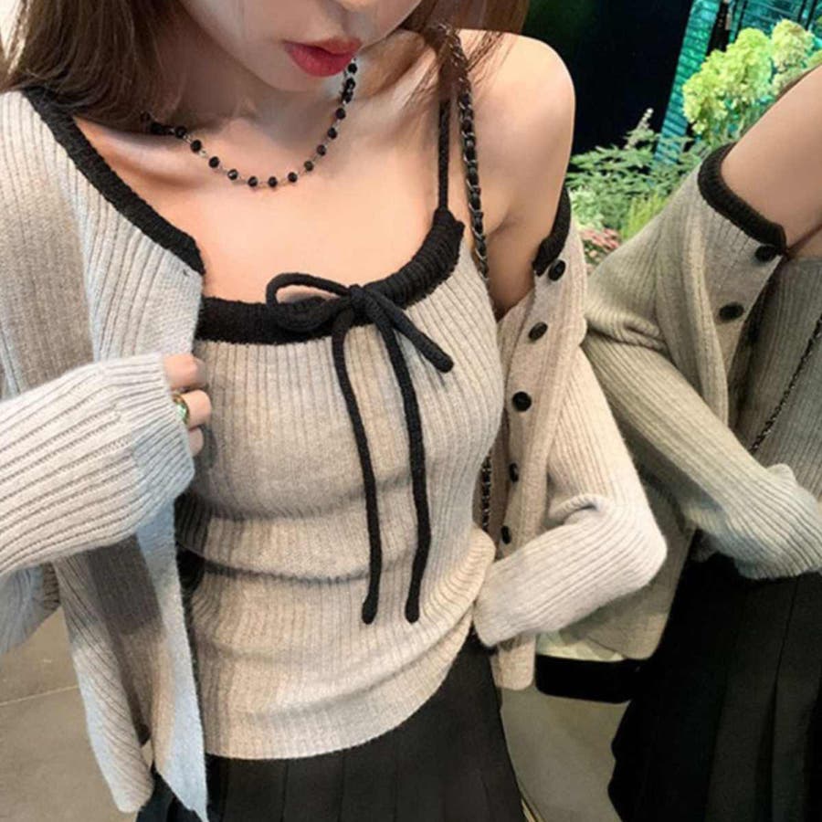 配色リボンニットキャミ+カーディガン2点セット
