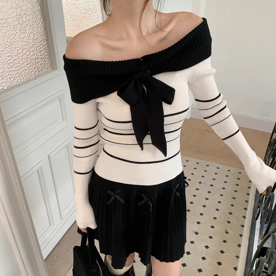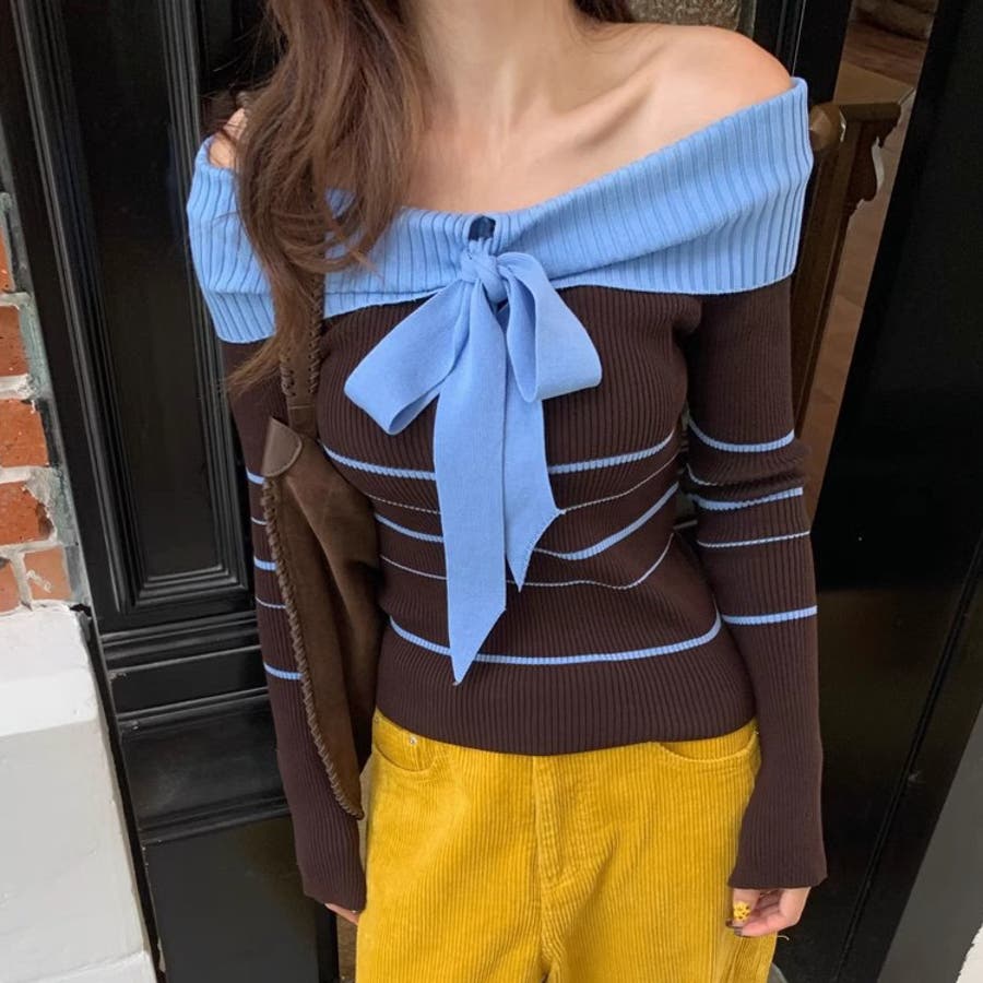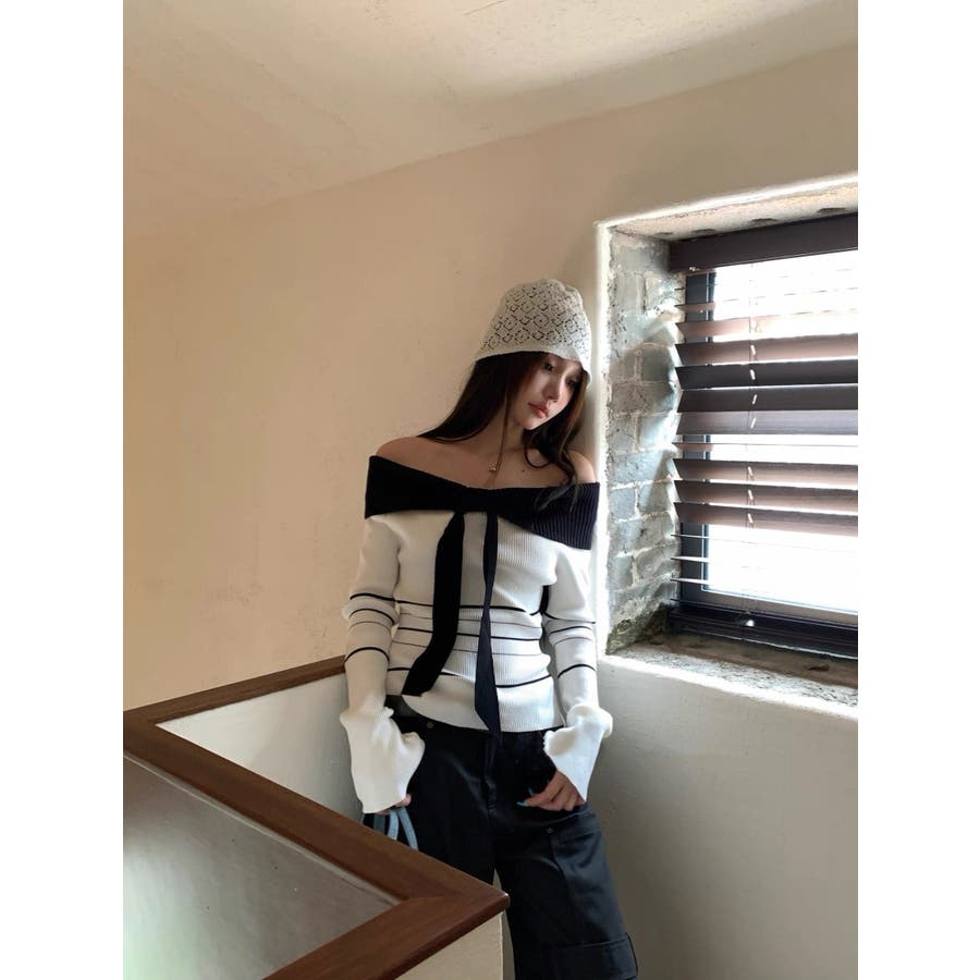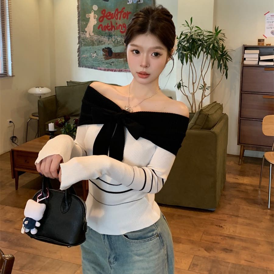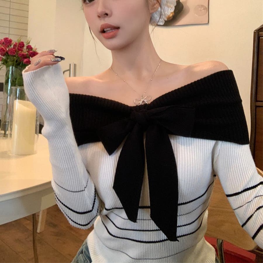 オフショルダー 配色リボンボーダーラインニットトップス