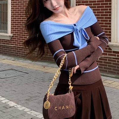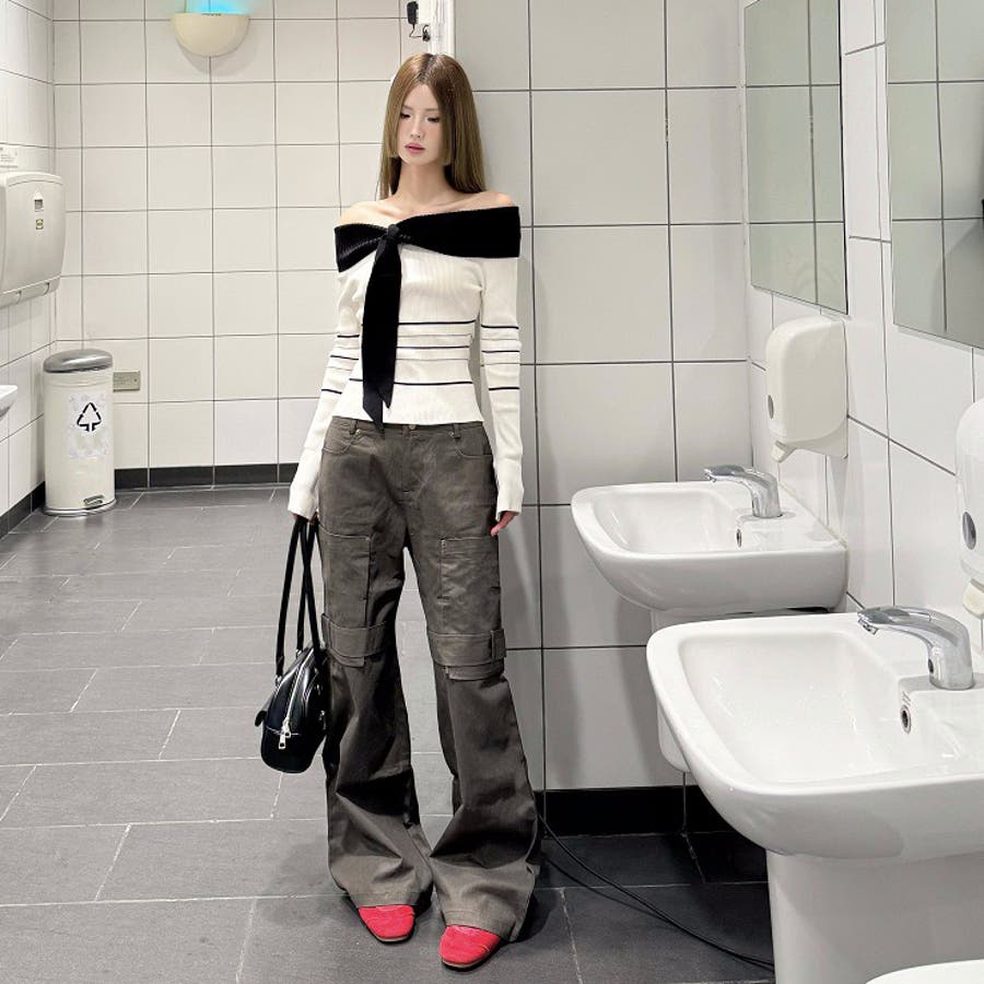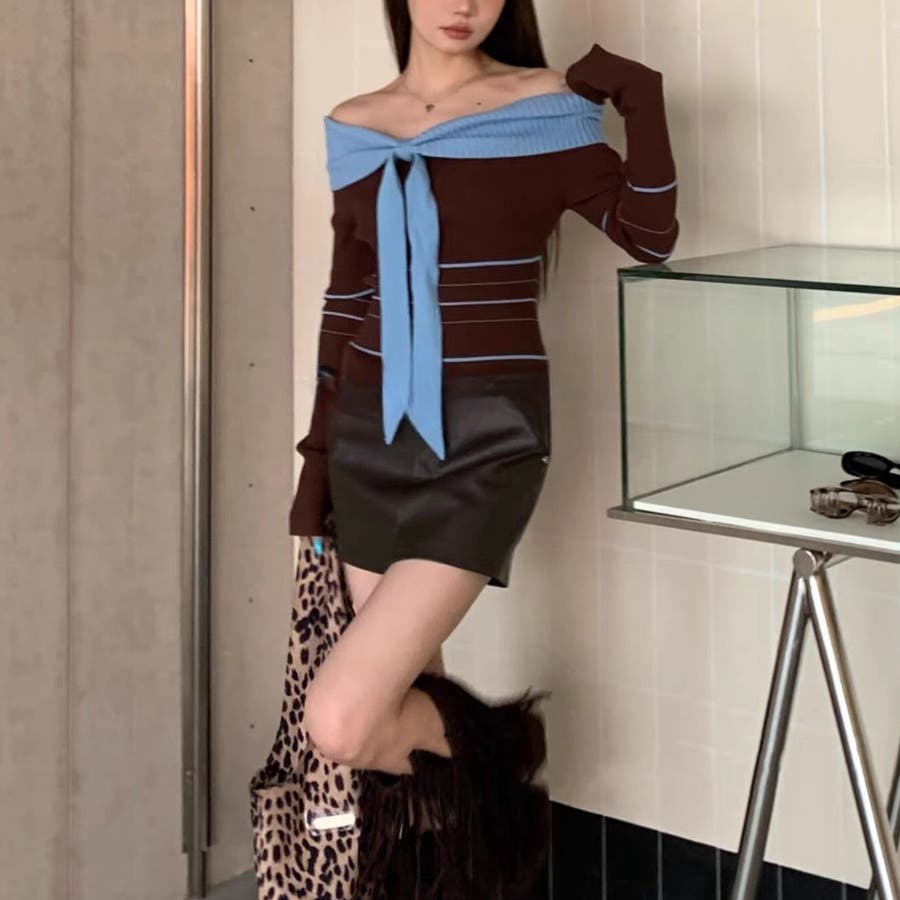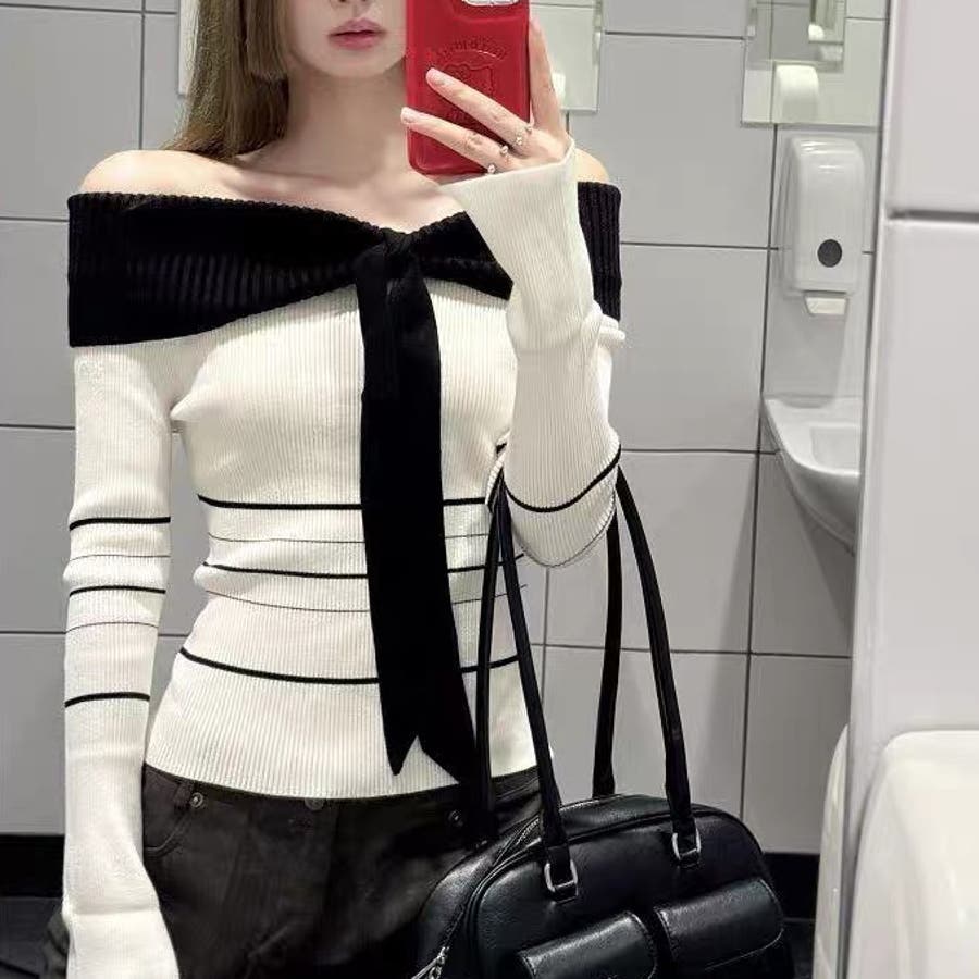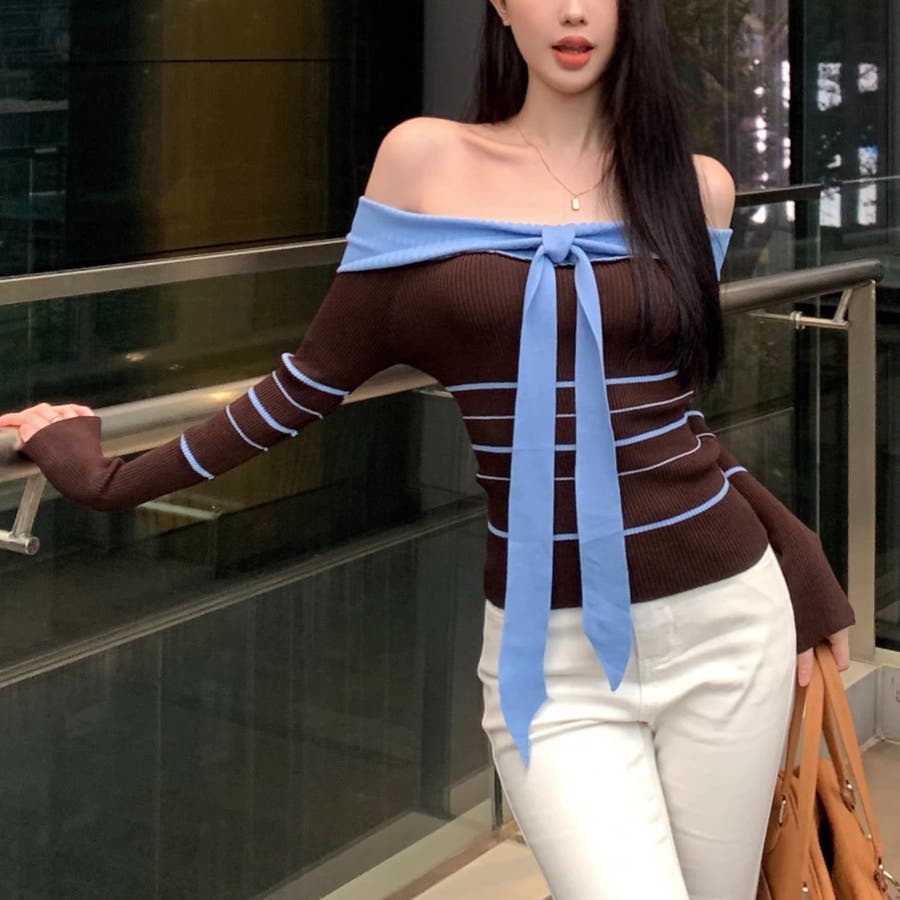 オフショルダー 配色リボンボーダーラインニットトップス