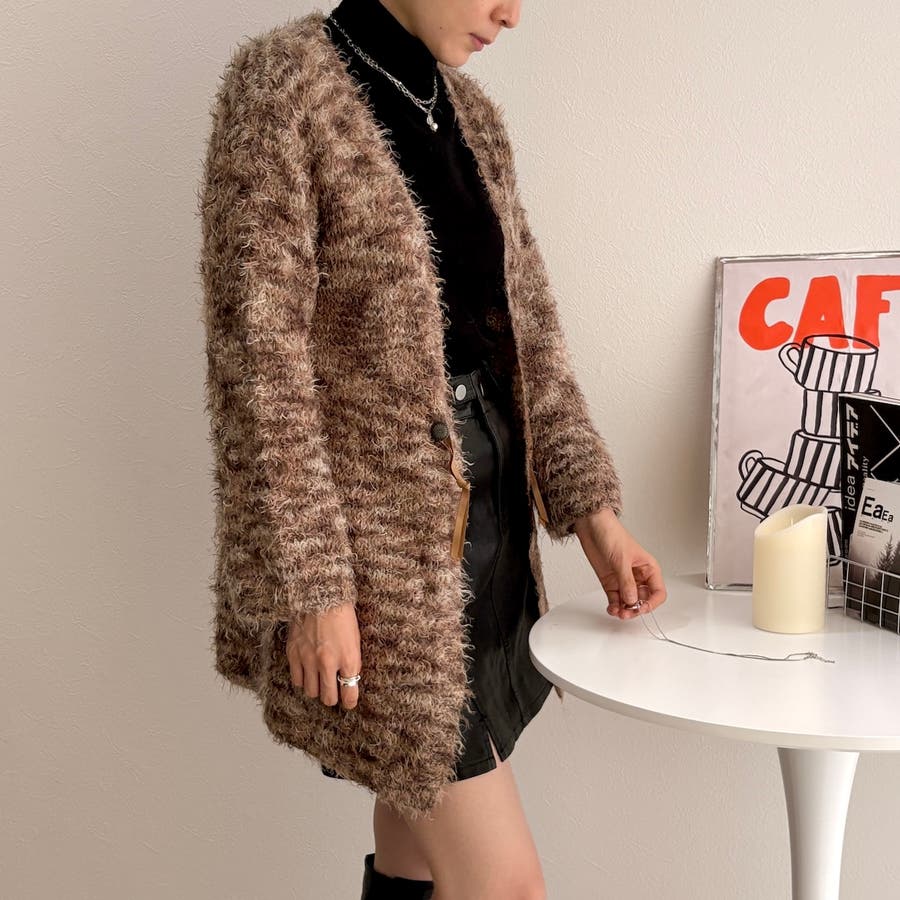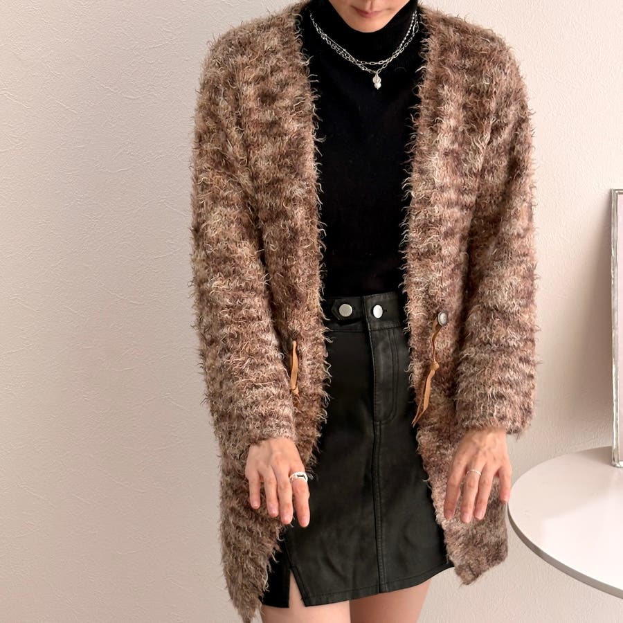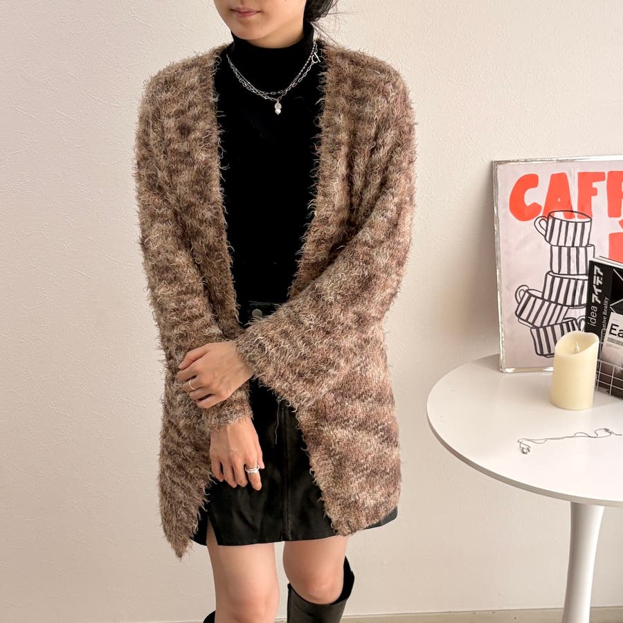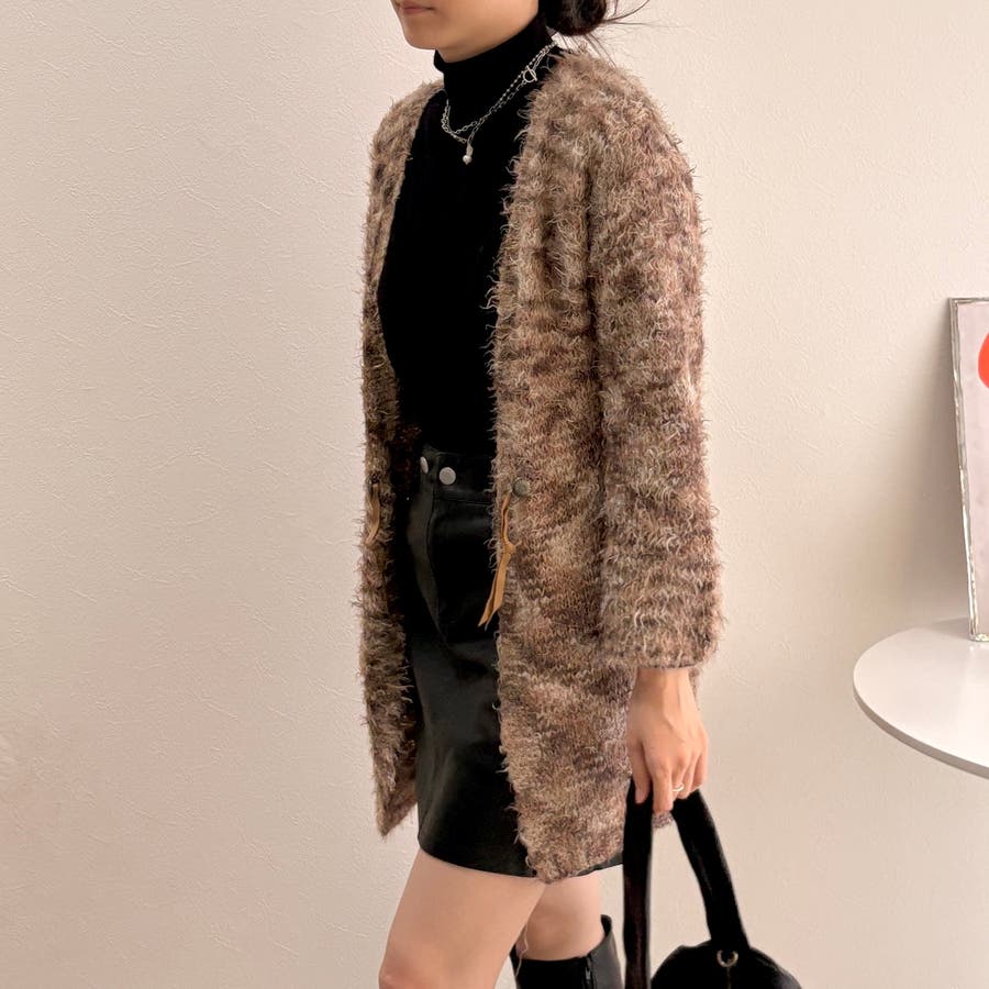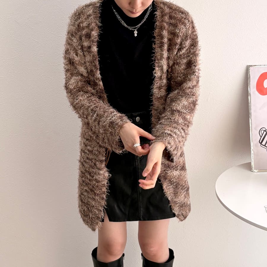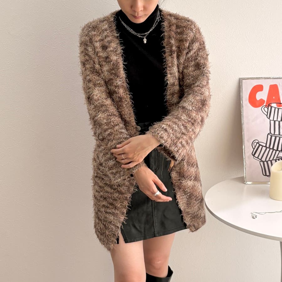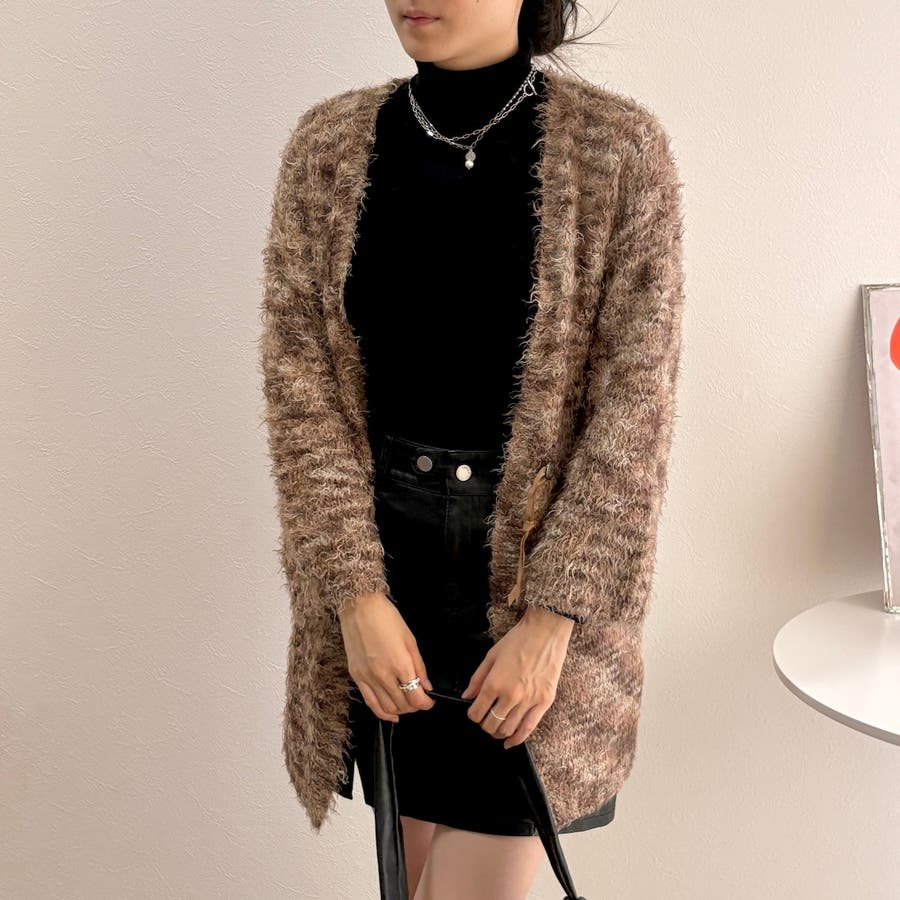ふんわりとしたシャギー素材でやさしい雰囲気に仕上げたロングカーディガン。