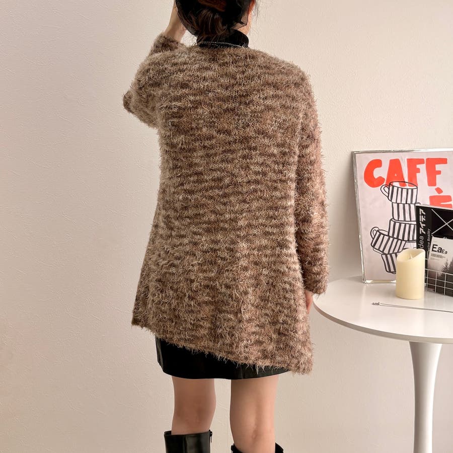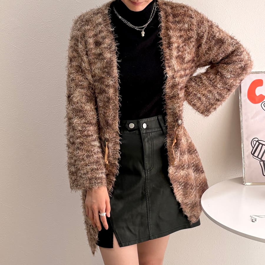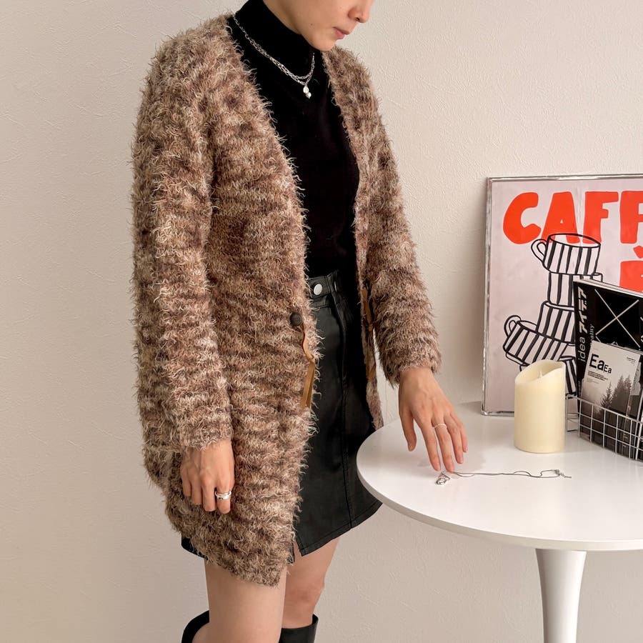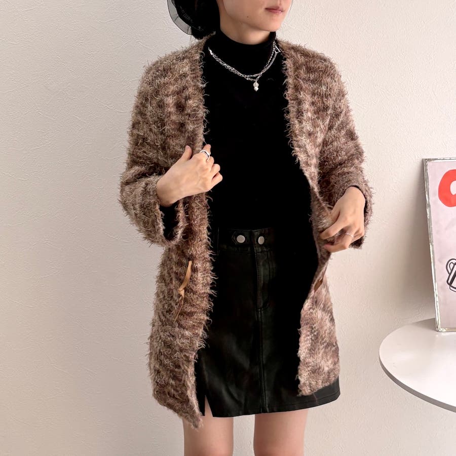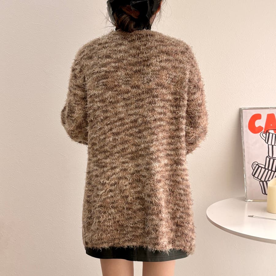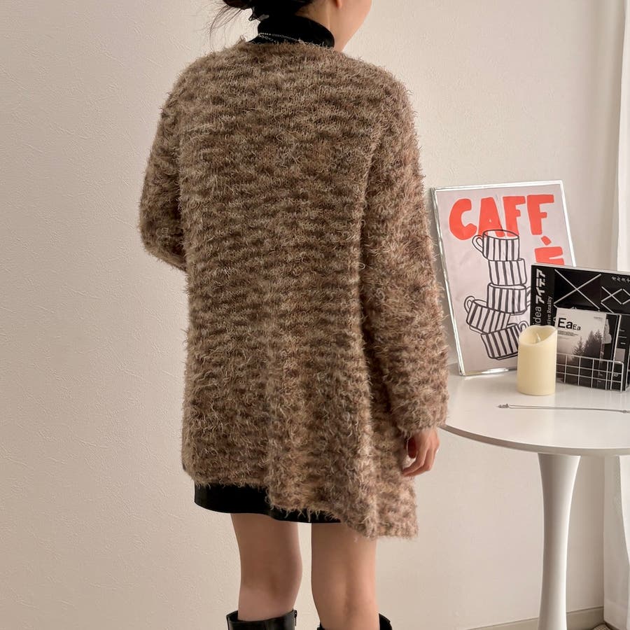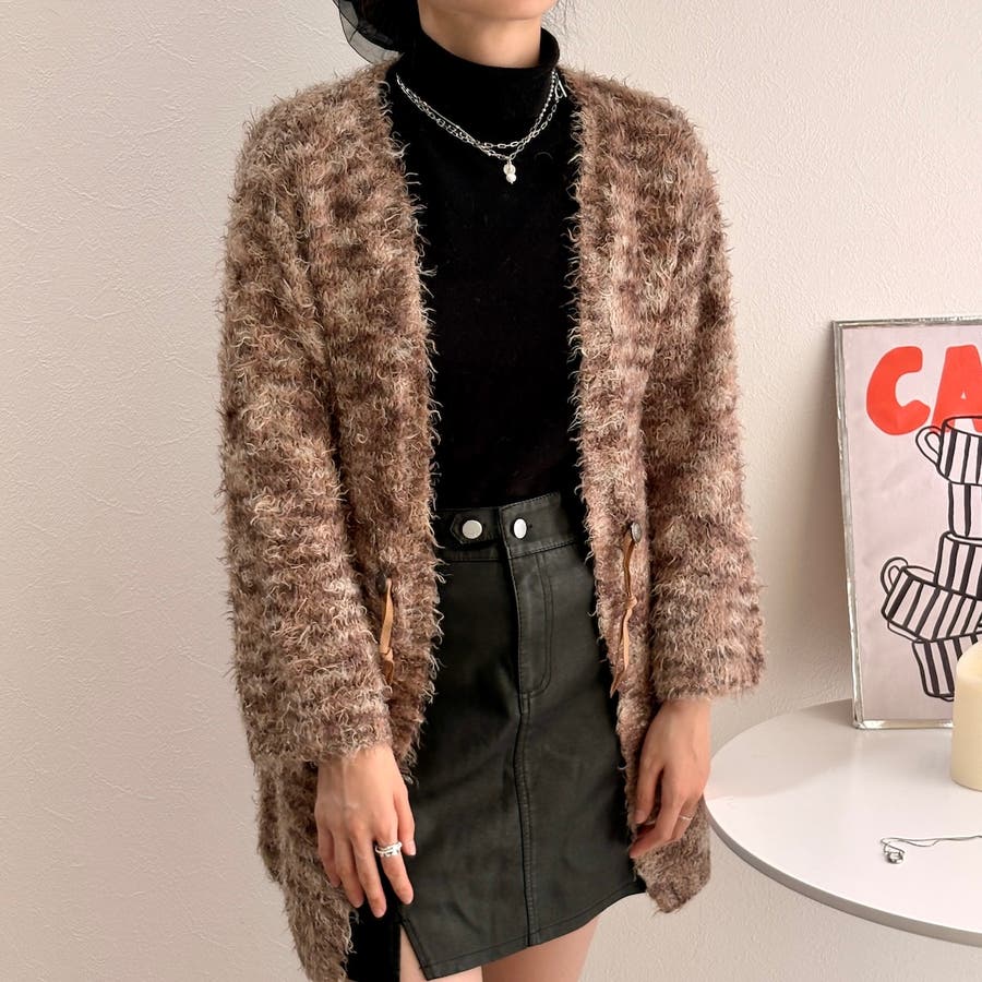 ふんわりとしたシャギー素材でやさしい雰囲気に仕上げたロングカーディガン。