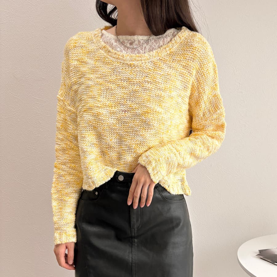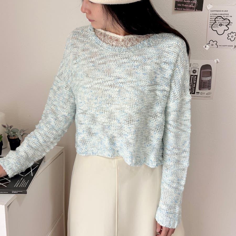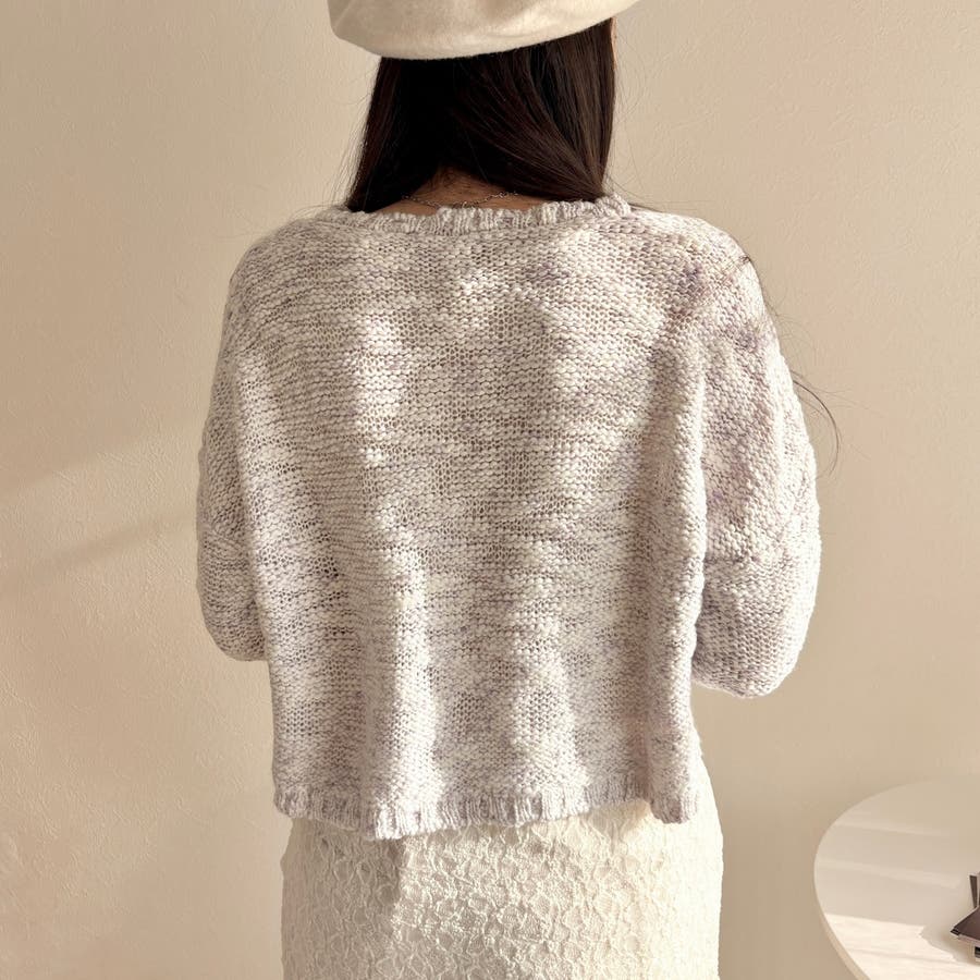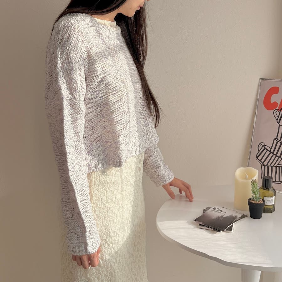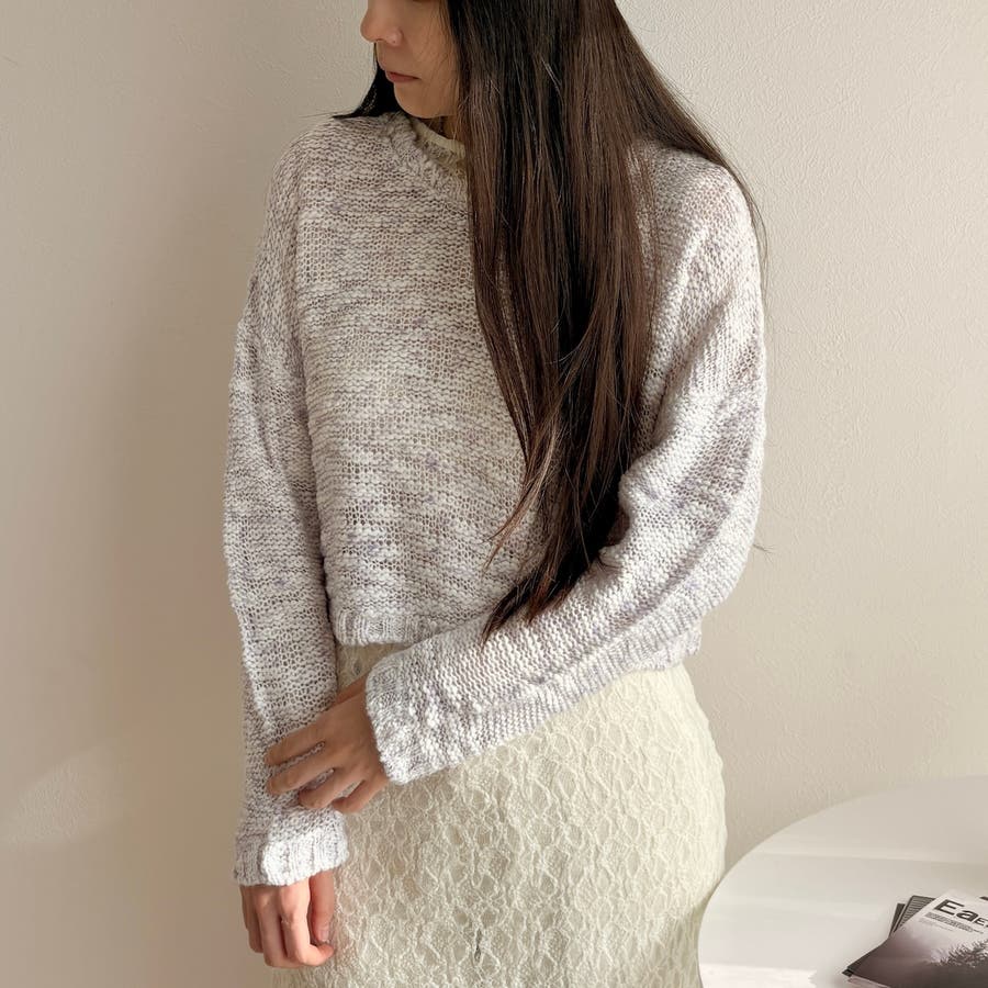 淡い色合いのミックスヤーンがふんわり可愛いショート丈ニット。