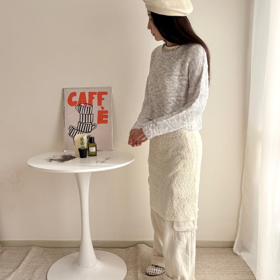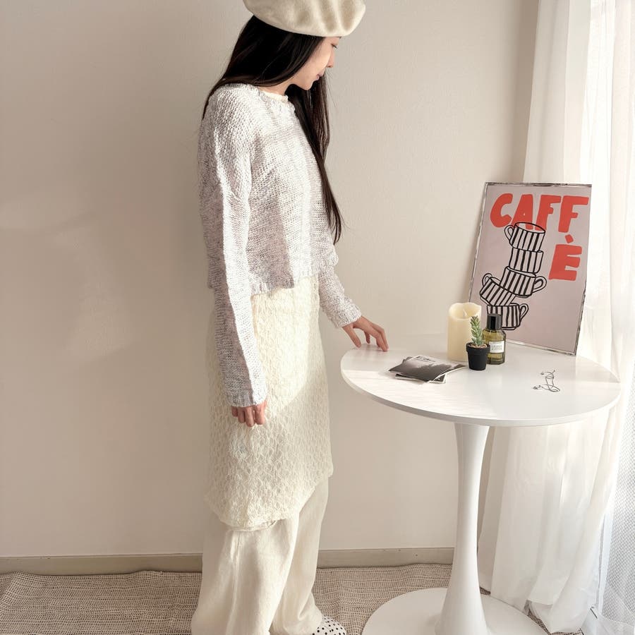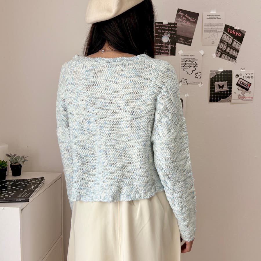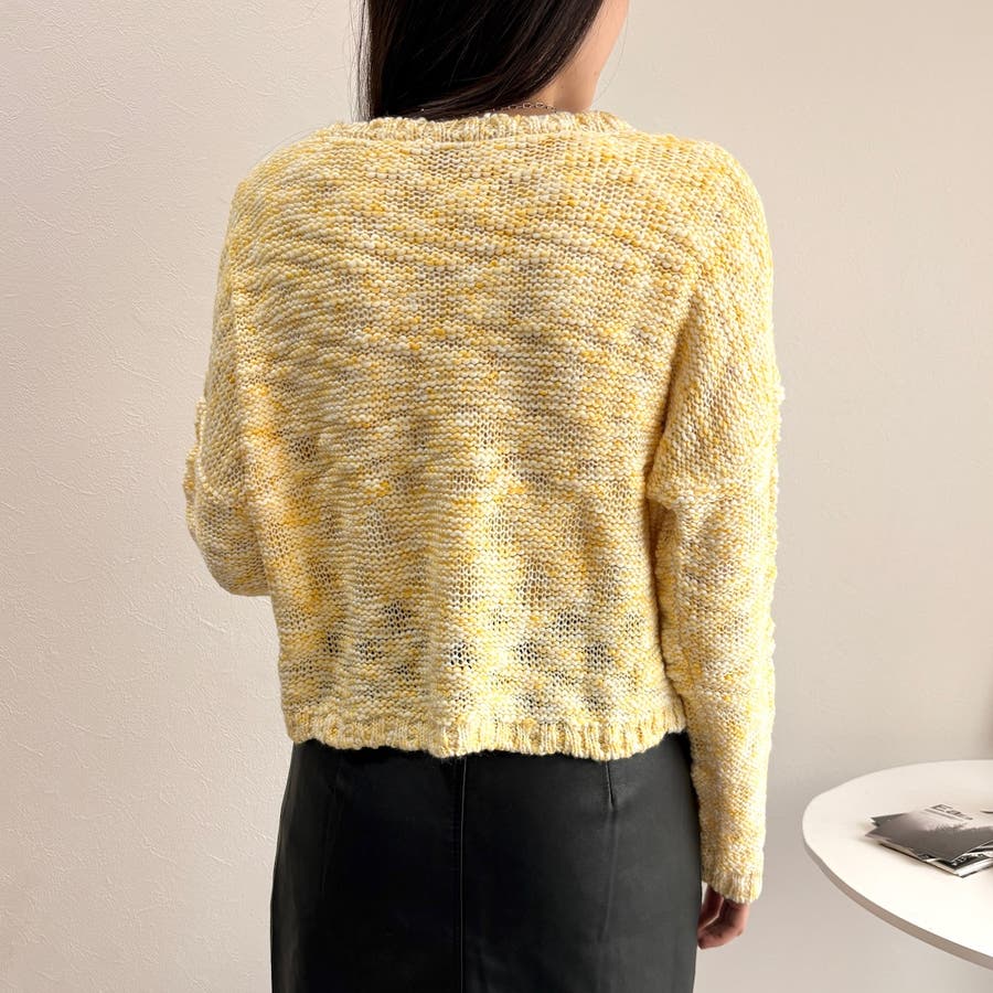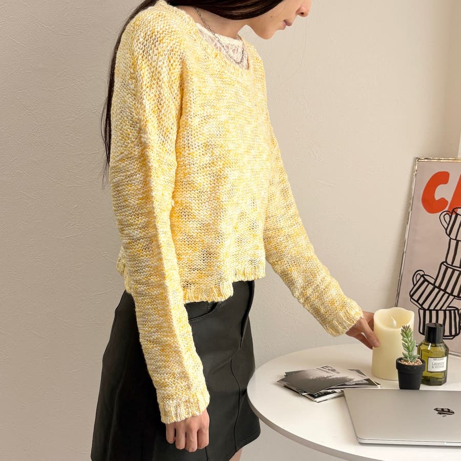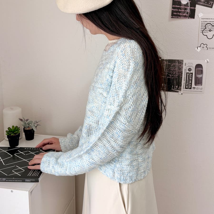 淡い色合いのミックスヤーンがふんわり可愛いショート丈ニット。