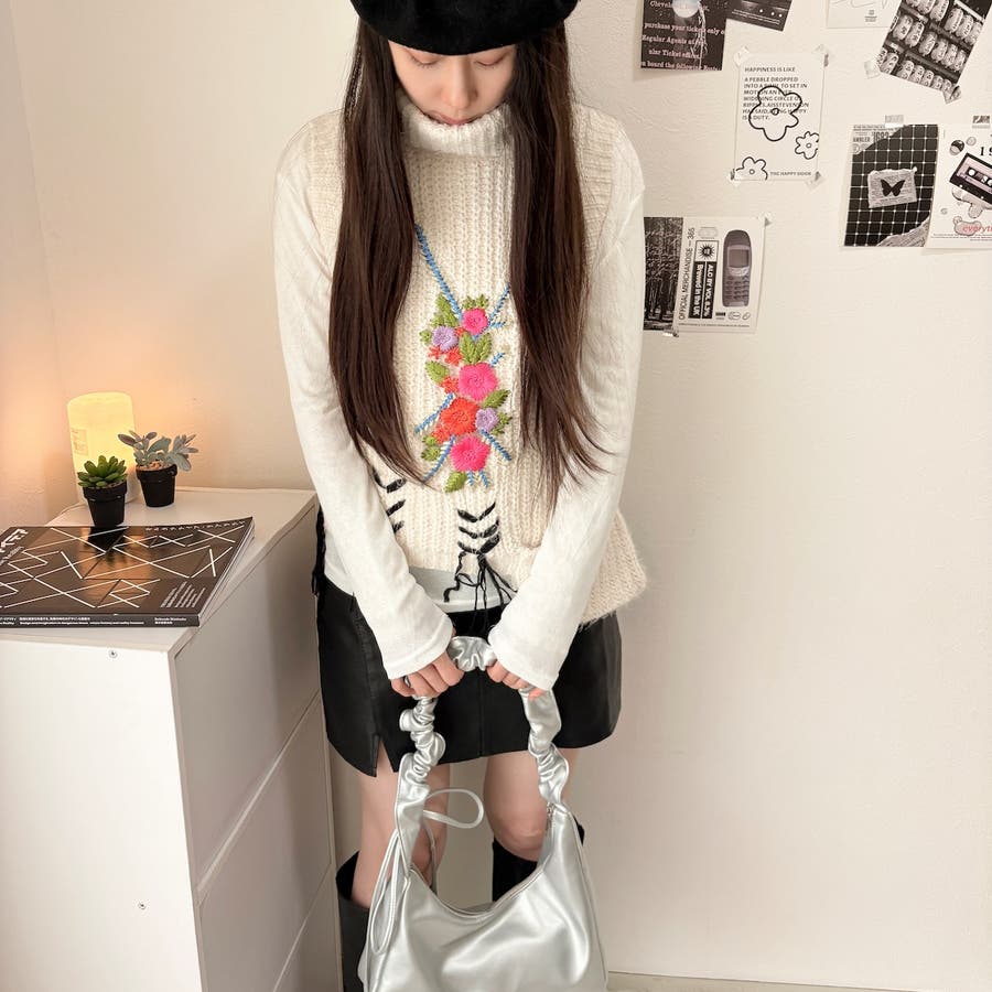 刺繍とレースアップフリンジがアクセントになったハイネックニットベスト。