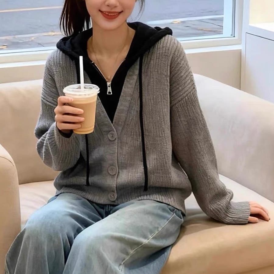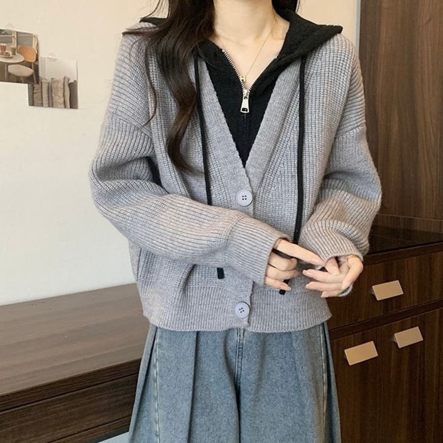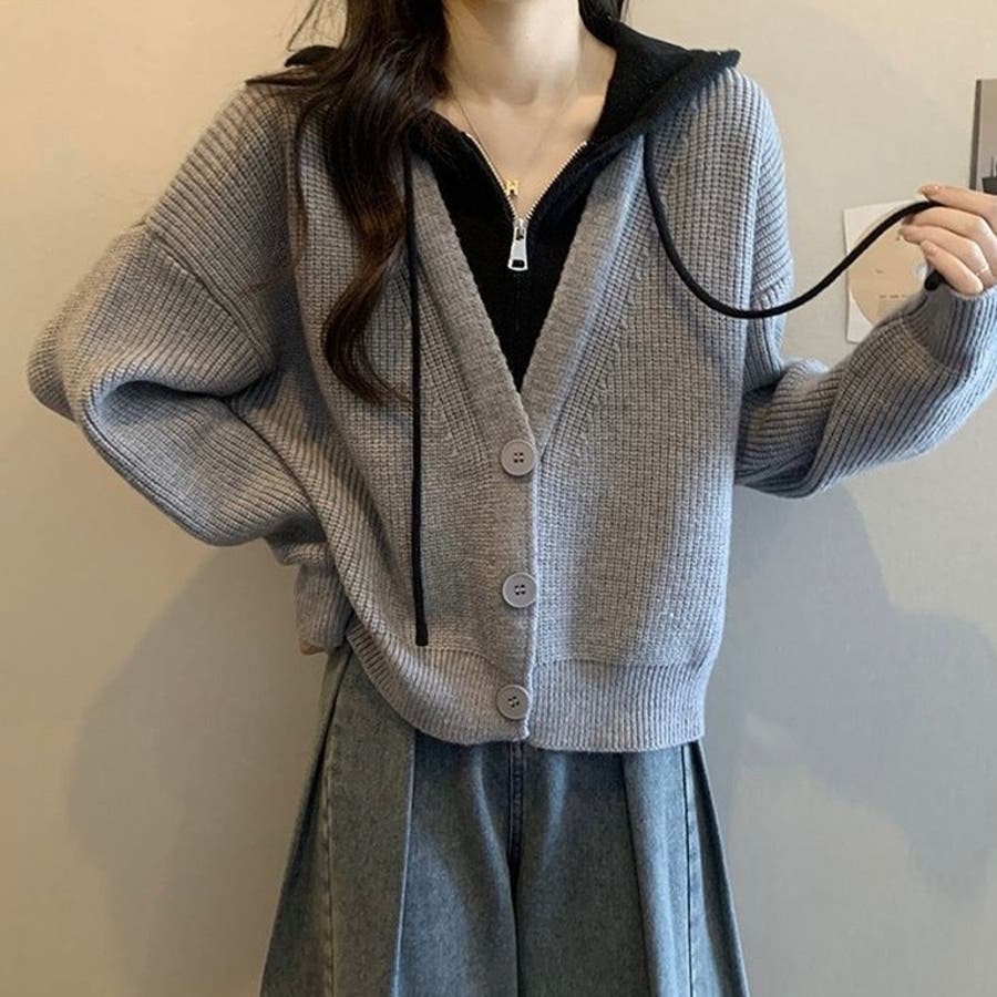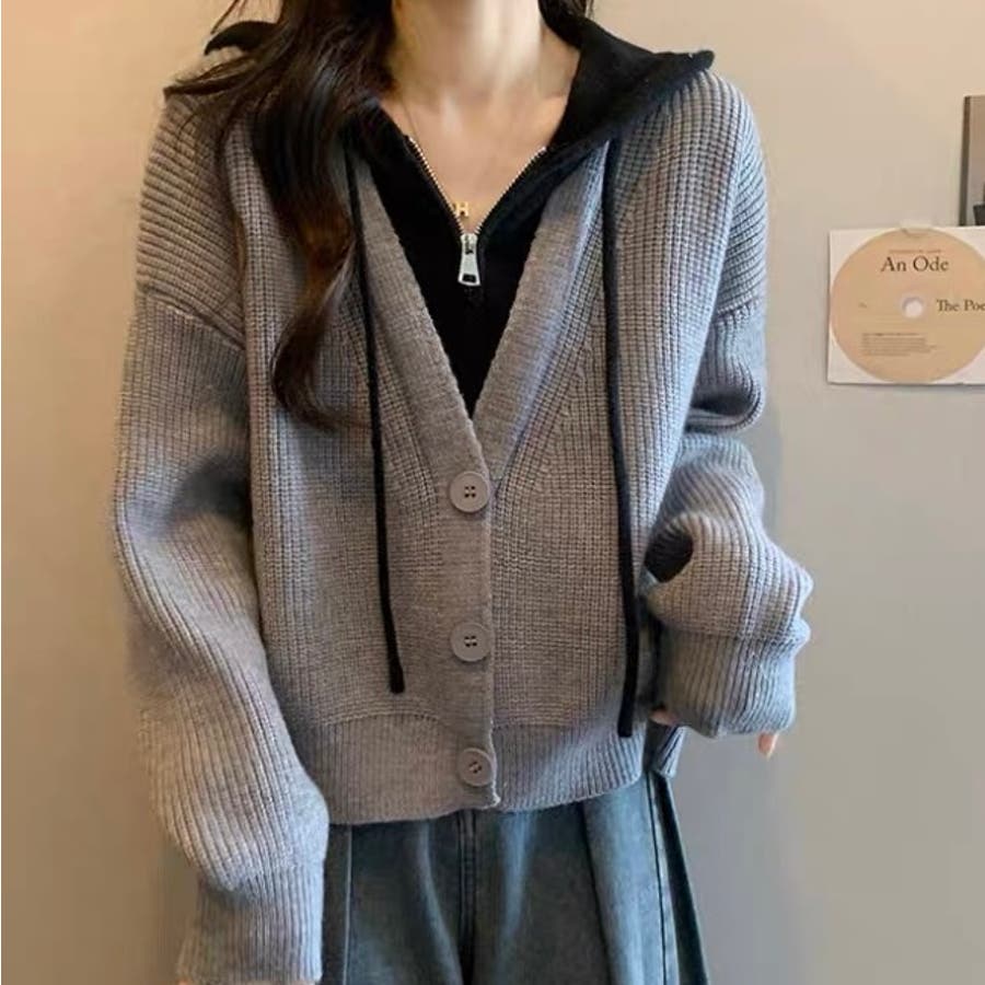 フード付きレイヤード風ニットカーディガン/カジュアル羽織り