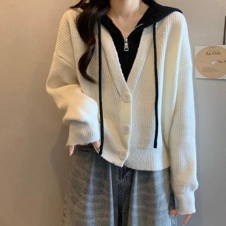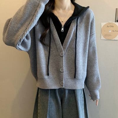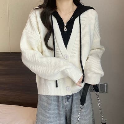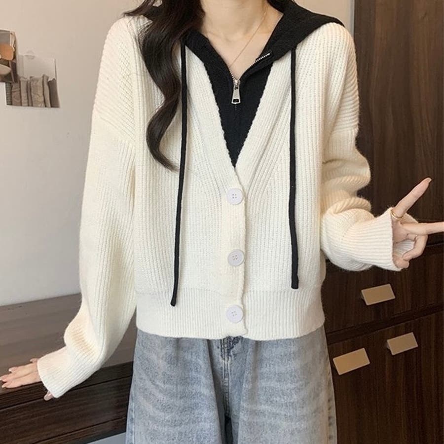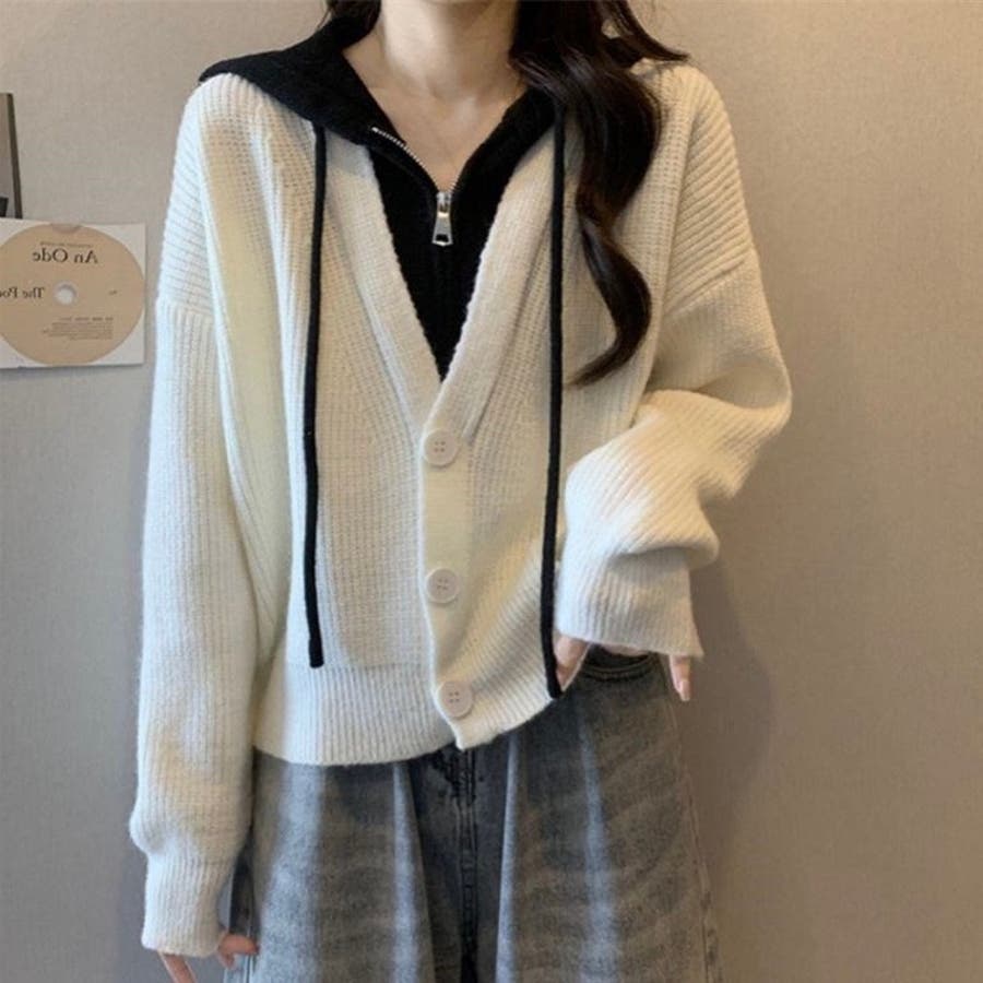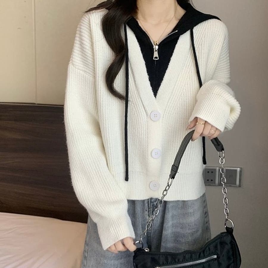 フード付きレイヤード風ニットカーディガン/カジュアル羽織り