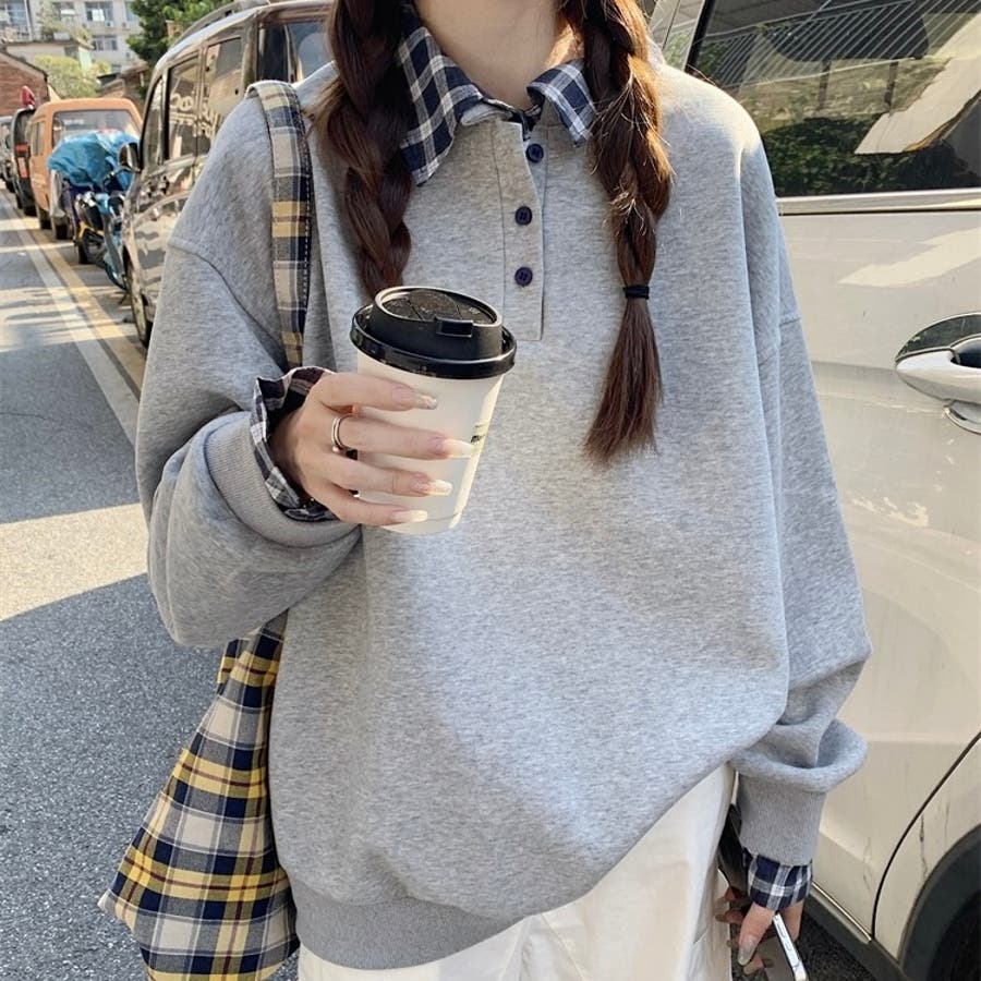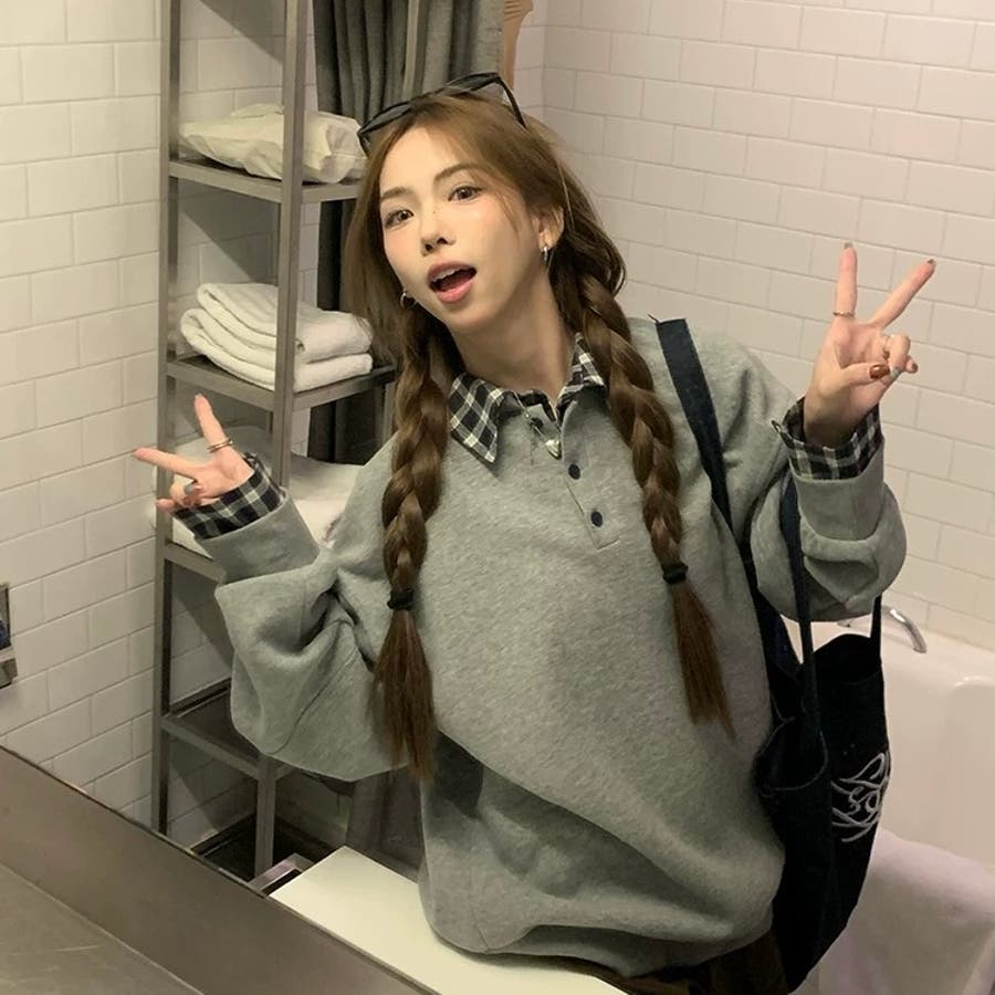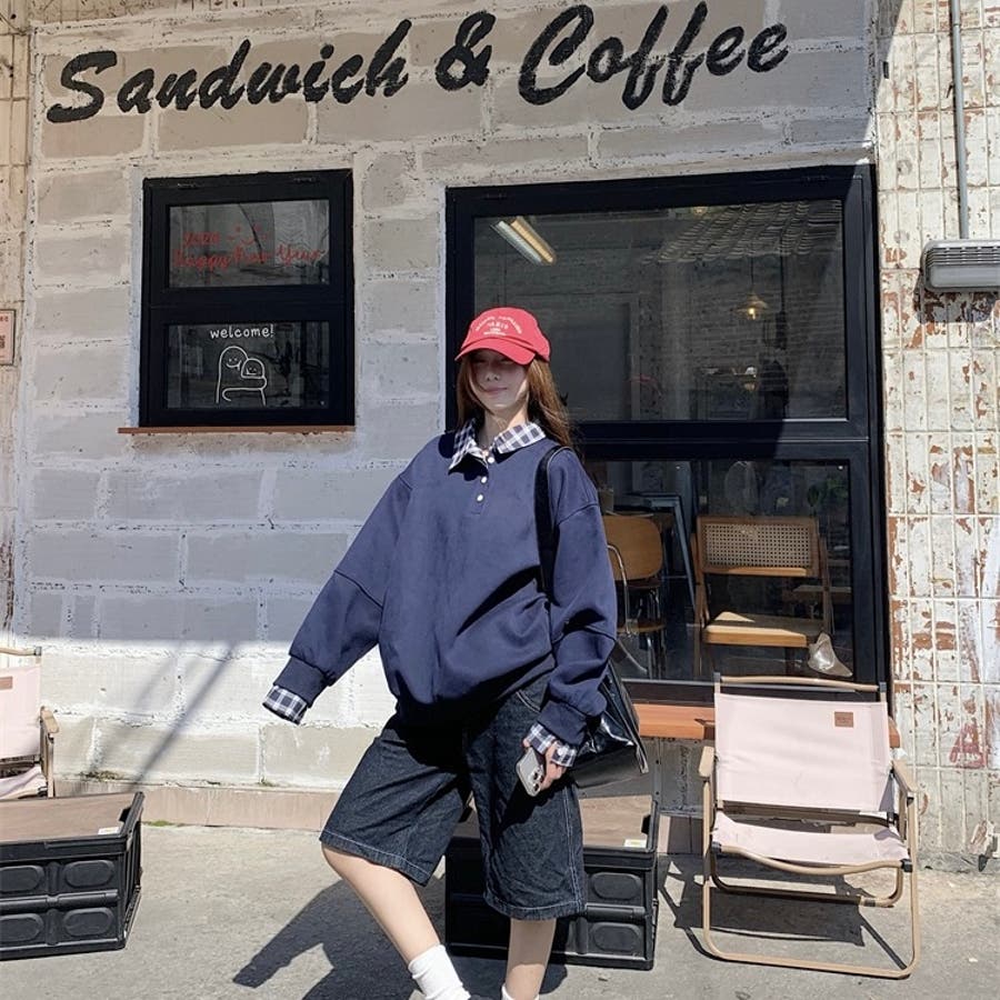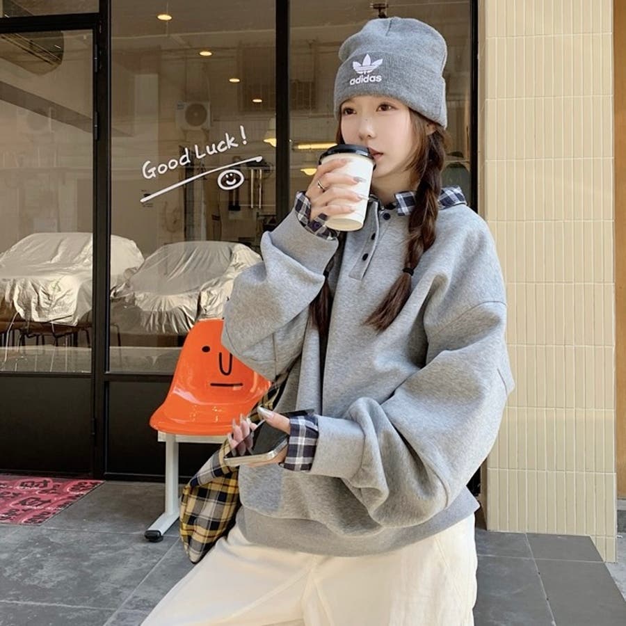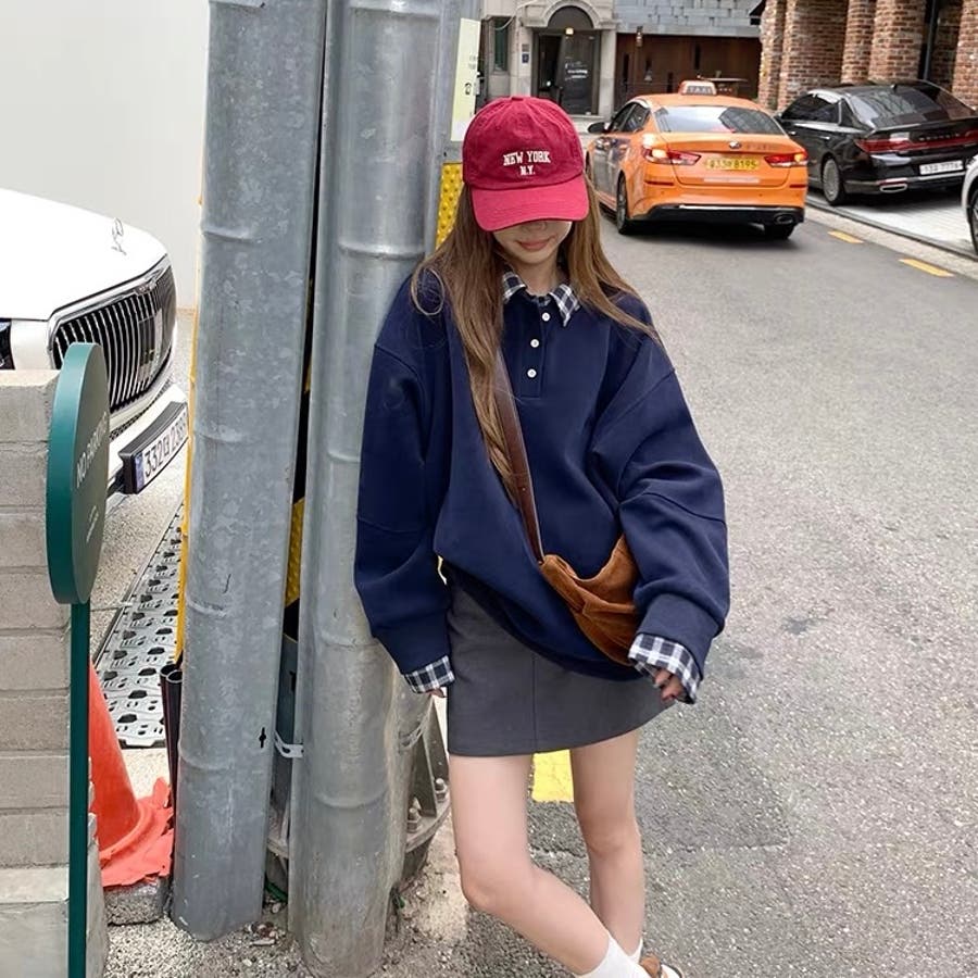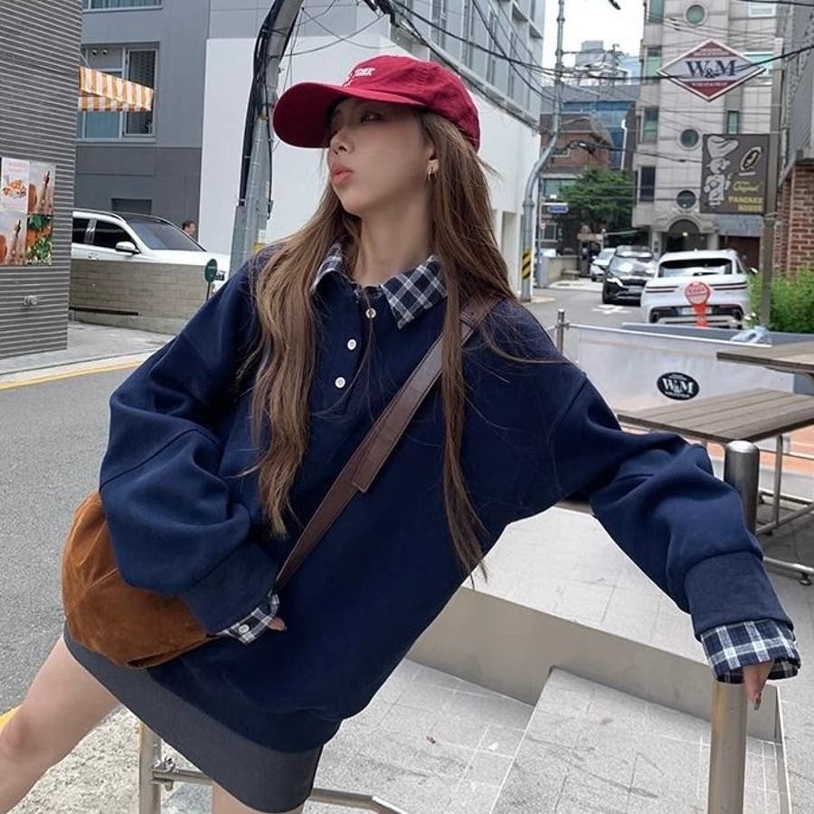チェック切替 オーバーサイズ裏起毛フェイクレイヤードプルオーバー/トレーナー