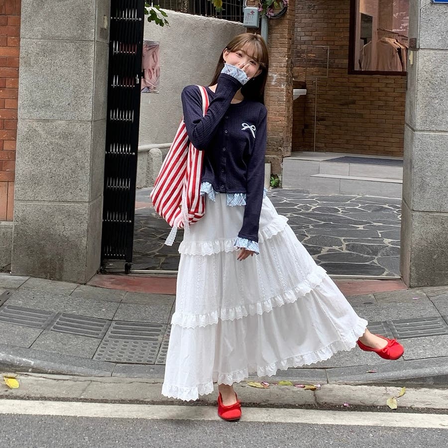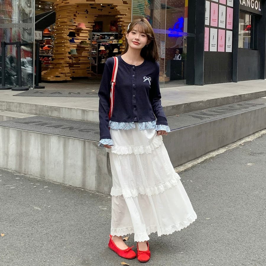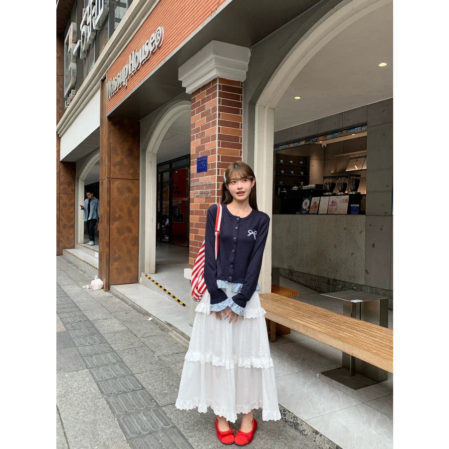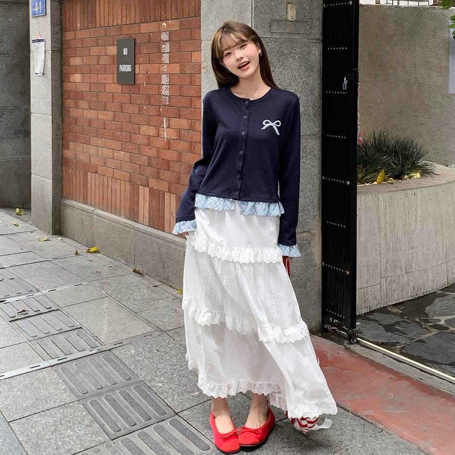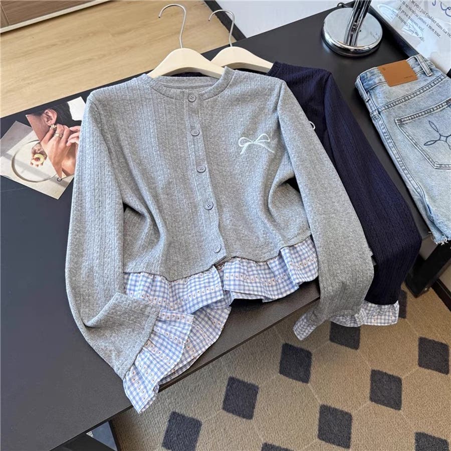 さりげない リボン刺繍 がポイントの、レイヤード風ニットカーディガン が新登場♡