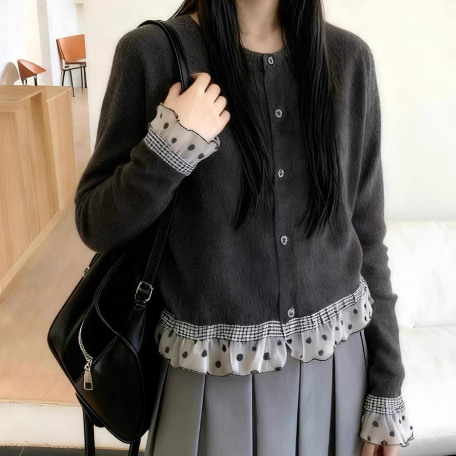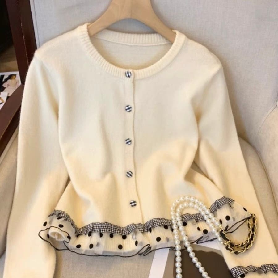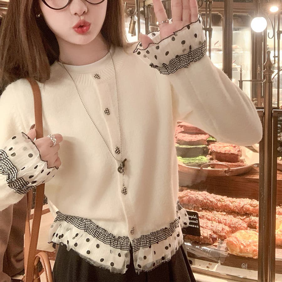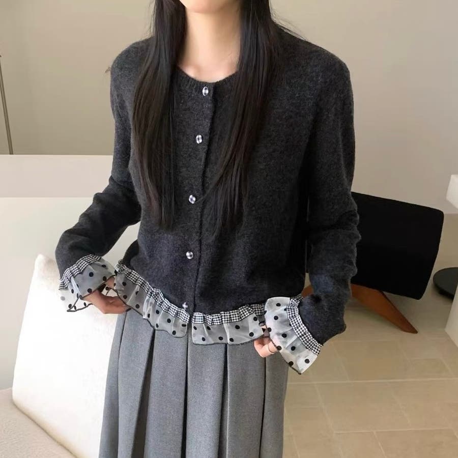 ふんわり柔らかなニットに、ドット柄シアーフリルを施したガーリー感満載のカーディガン♡