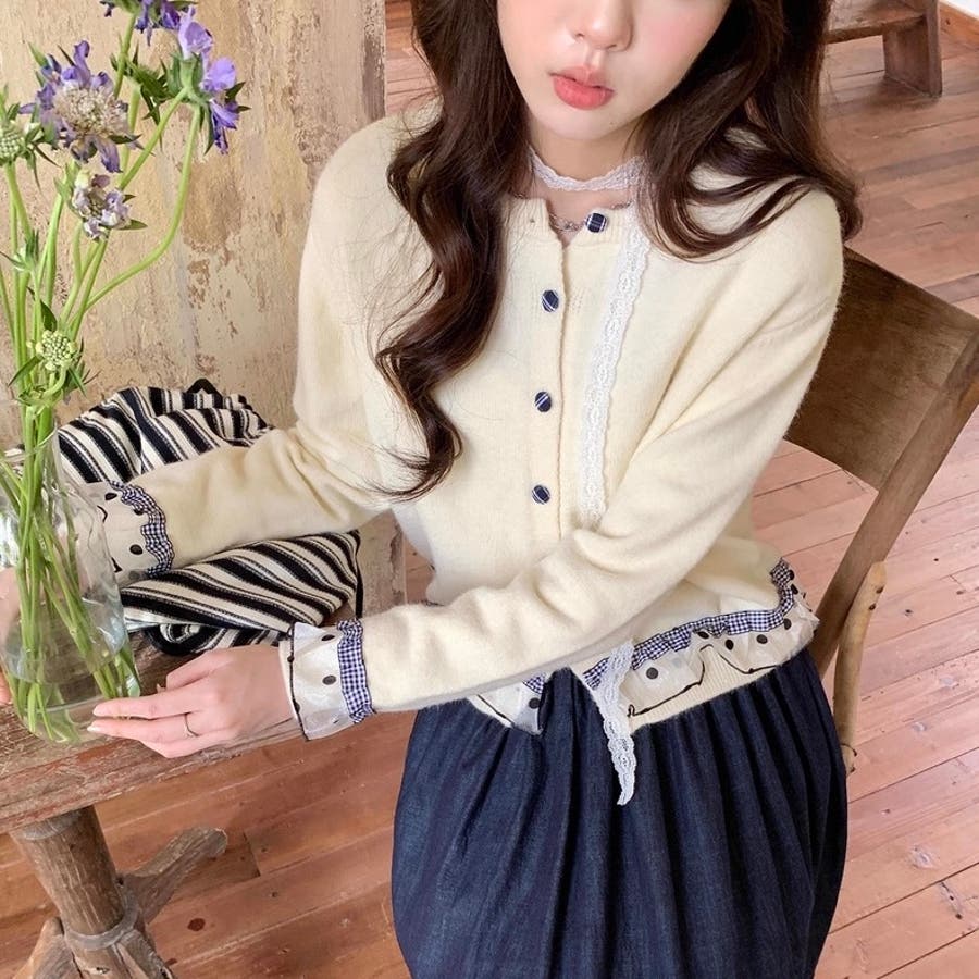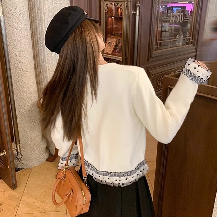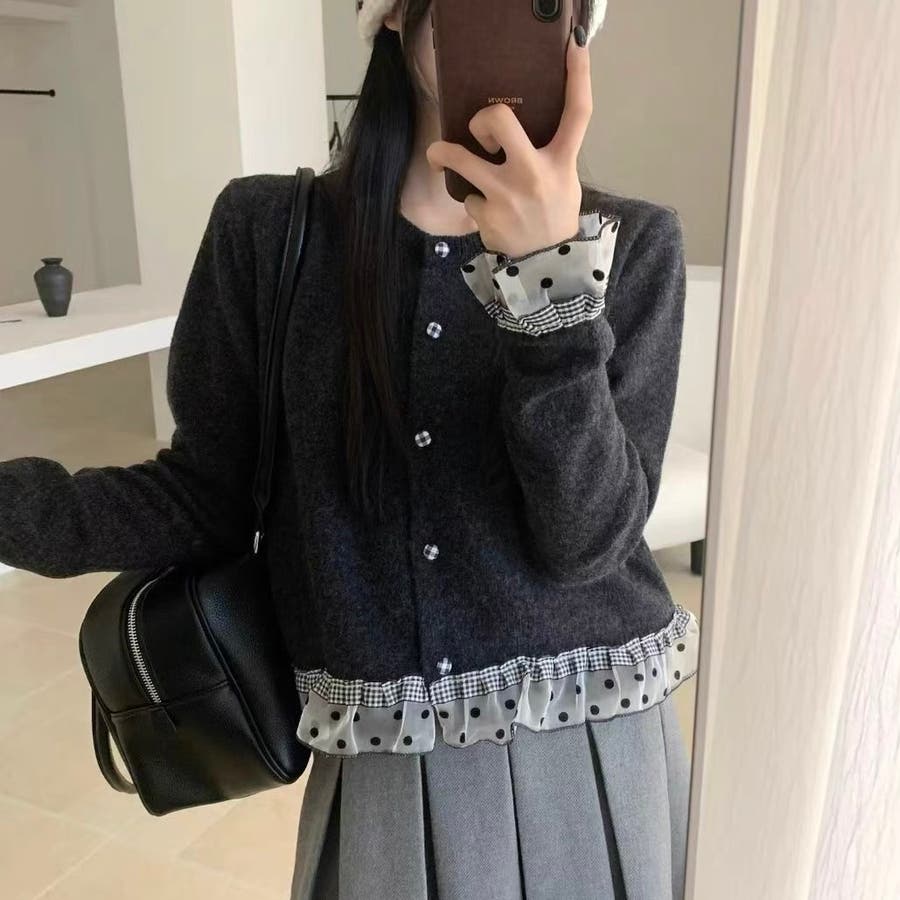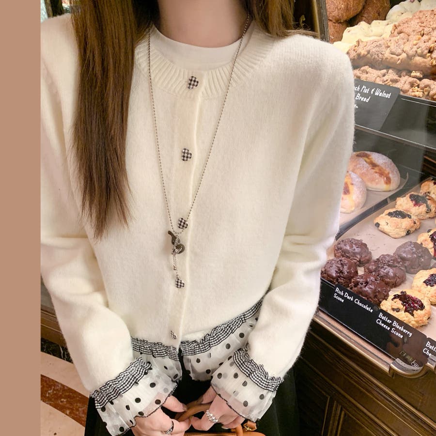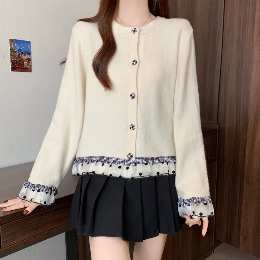 ふんわり柔らかなニットに、ドット柄シアーフリルを施したガーリー感満載のカーディガン♡