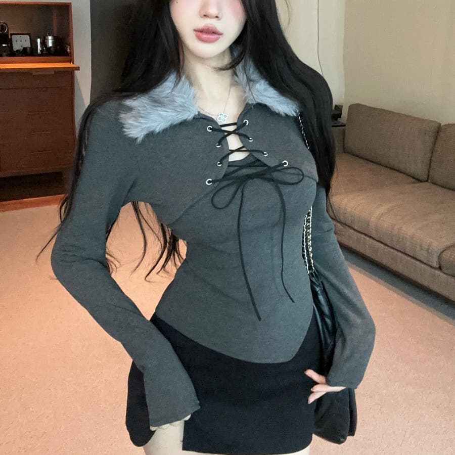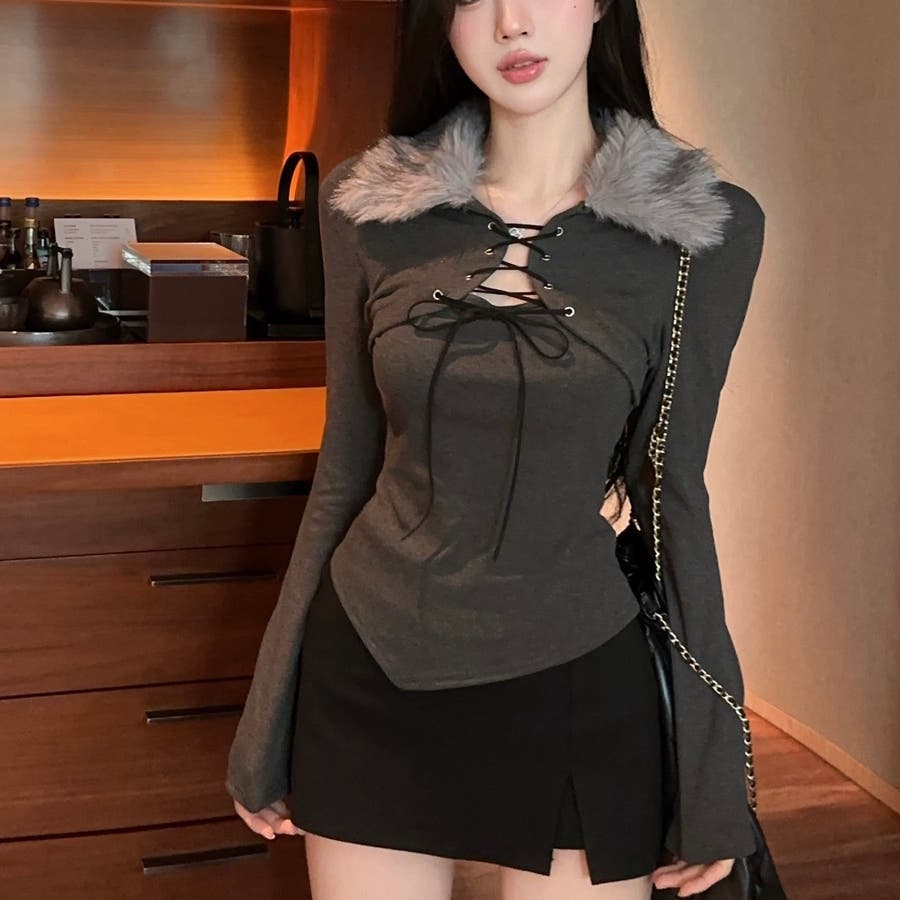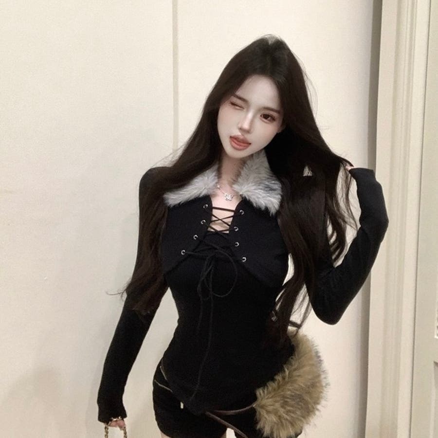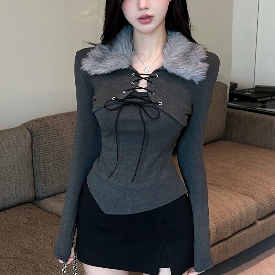 ファー衿レースアップトップス