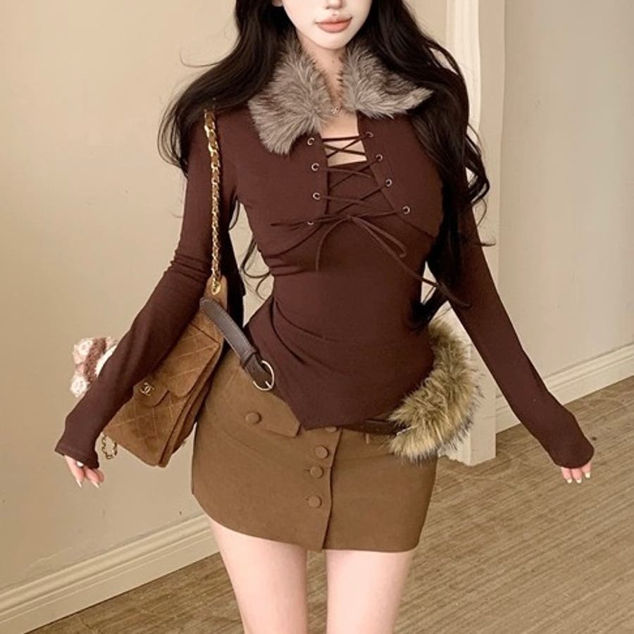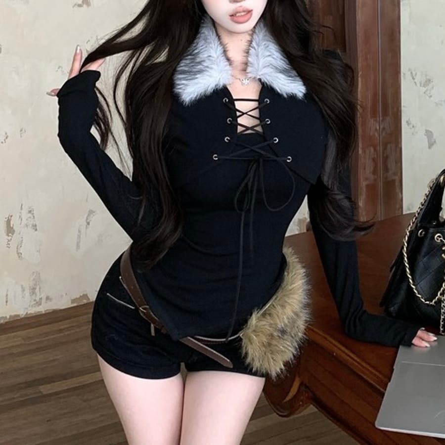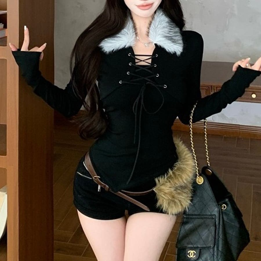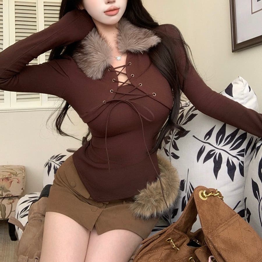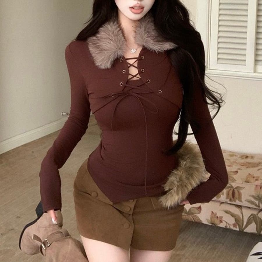 ファー衿レースアップトップス