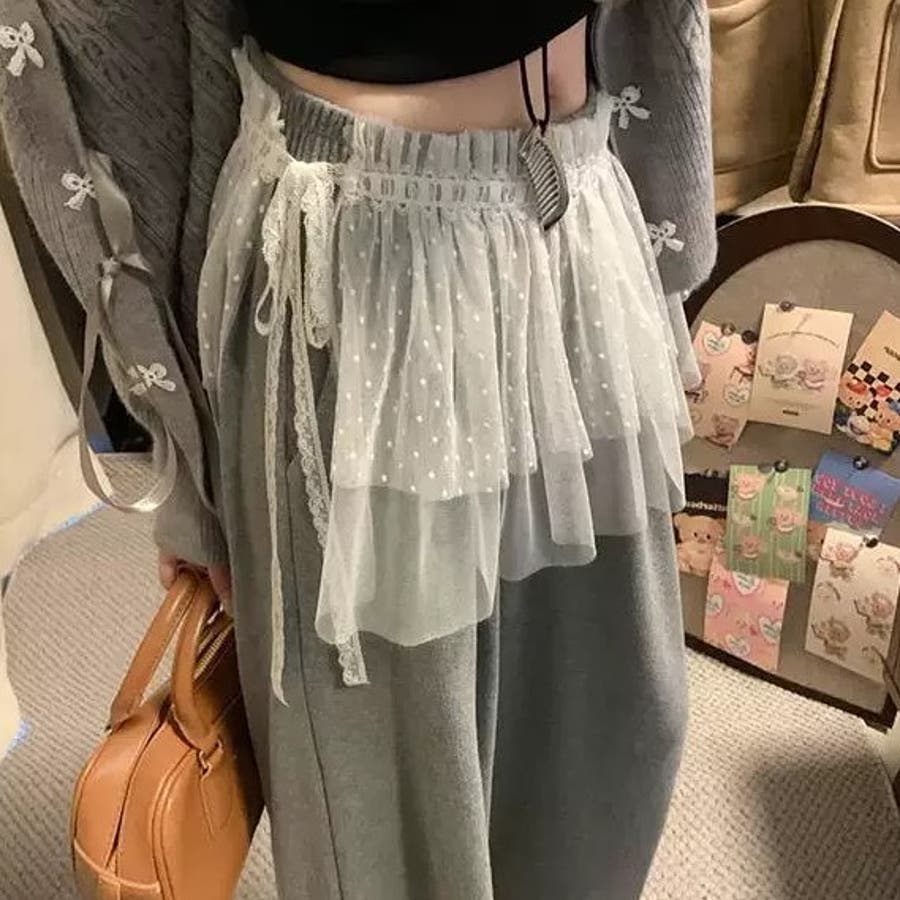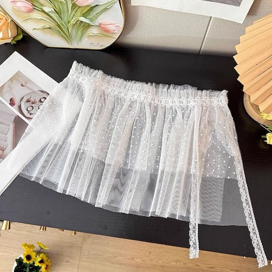 ドット柄と無地のチュールが二重になって長めなレースリボンがノスタルジックにアクセントになったトレンドのラップスカートです。
