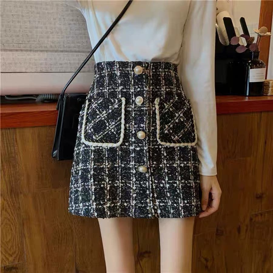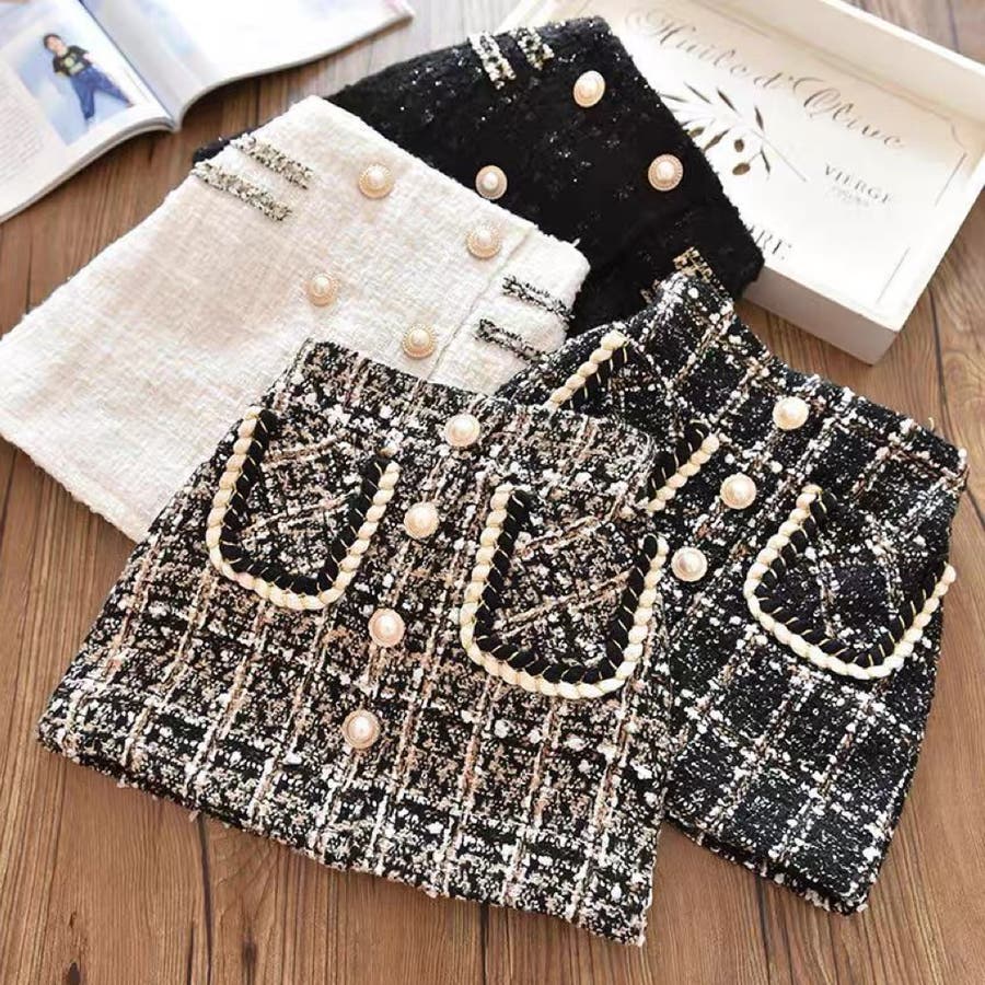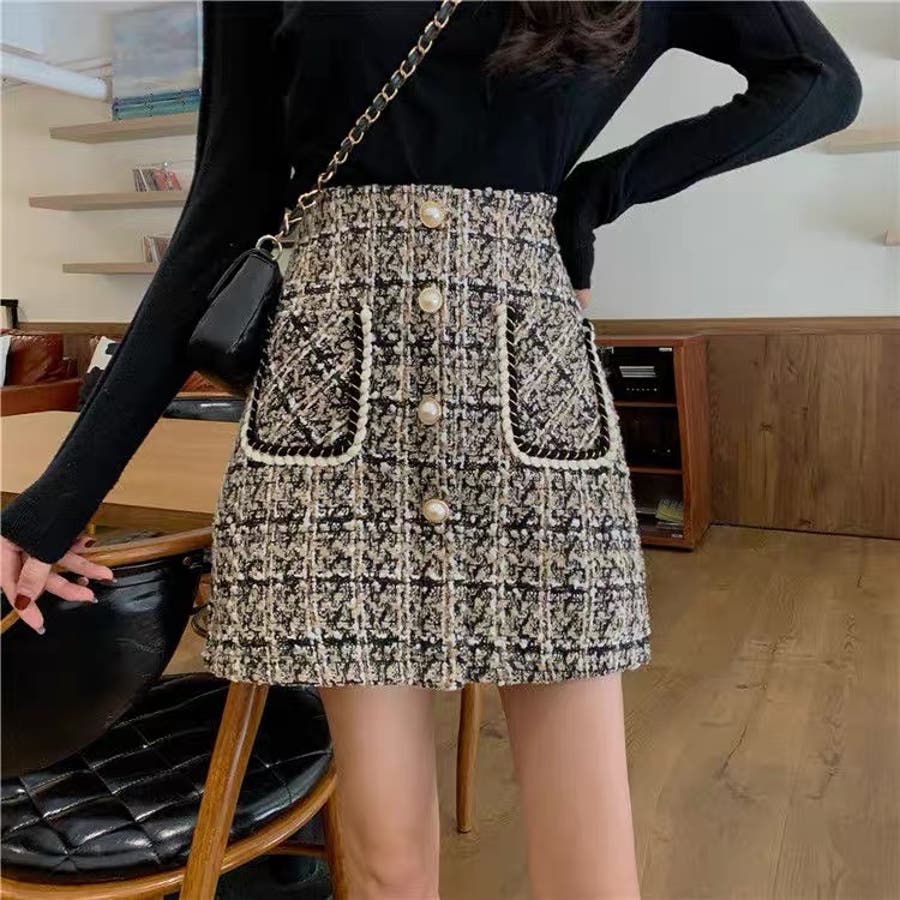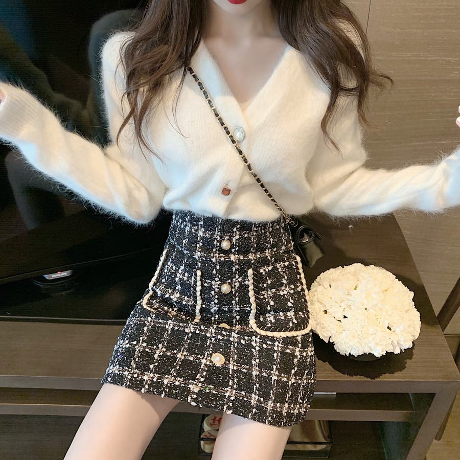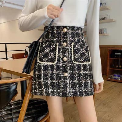 上品なツイード素材に、存在感のあるパールボタンをあしらったミニスカート。