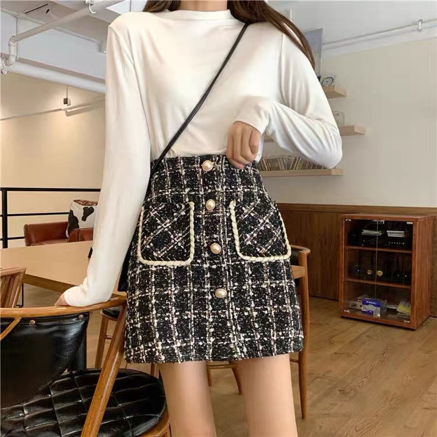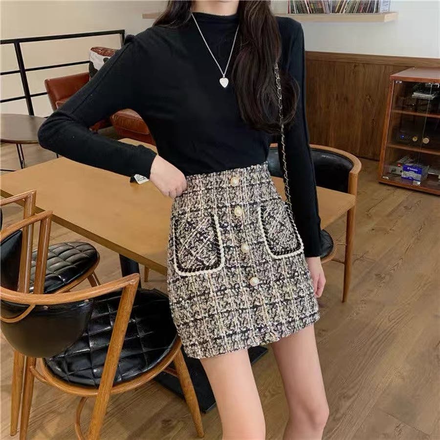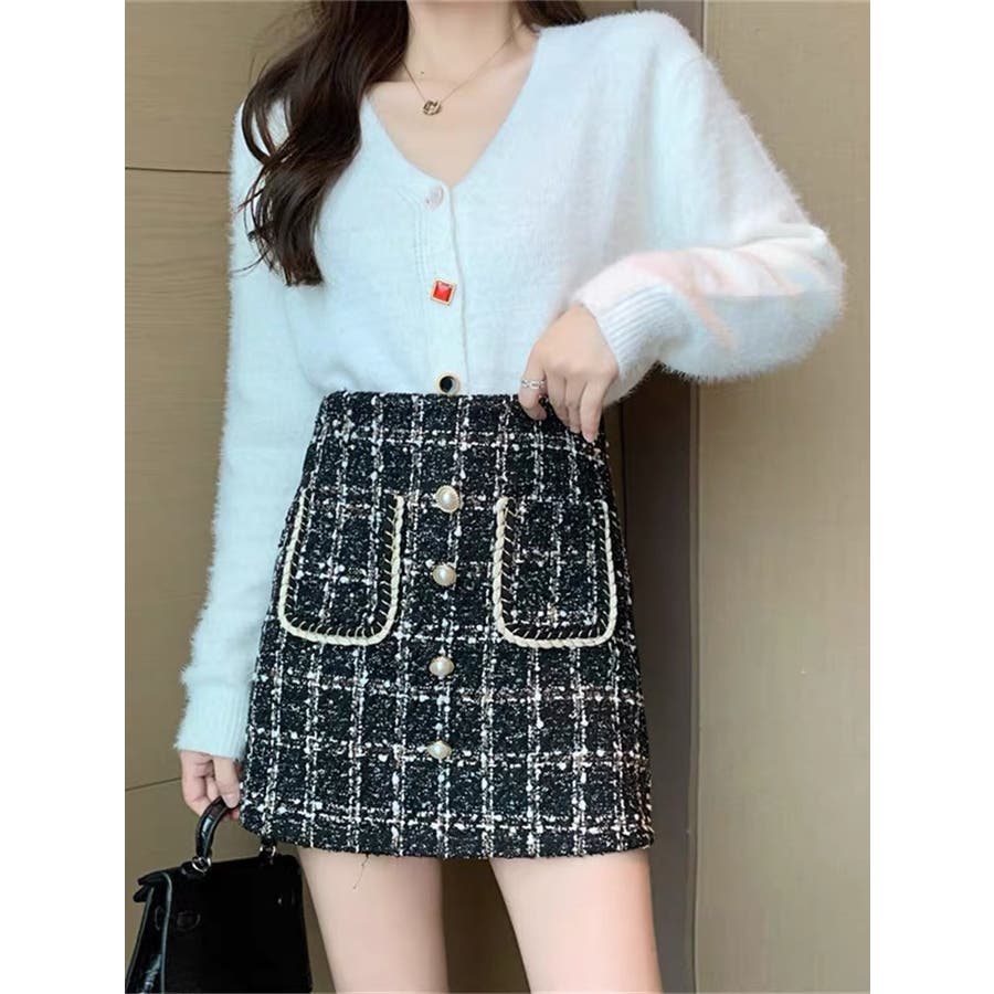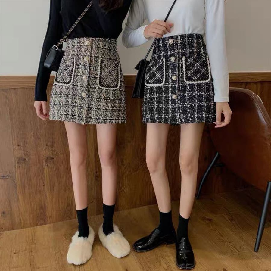 上品なツイード素材に、存在感のあるパールボタンをあしらったミニスカート。