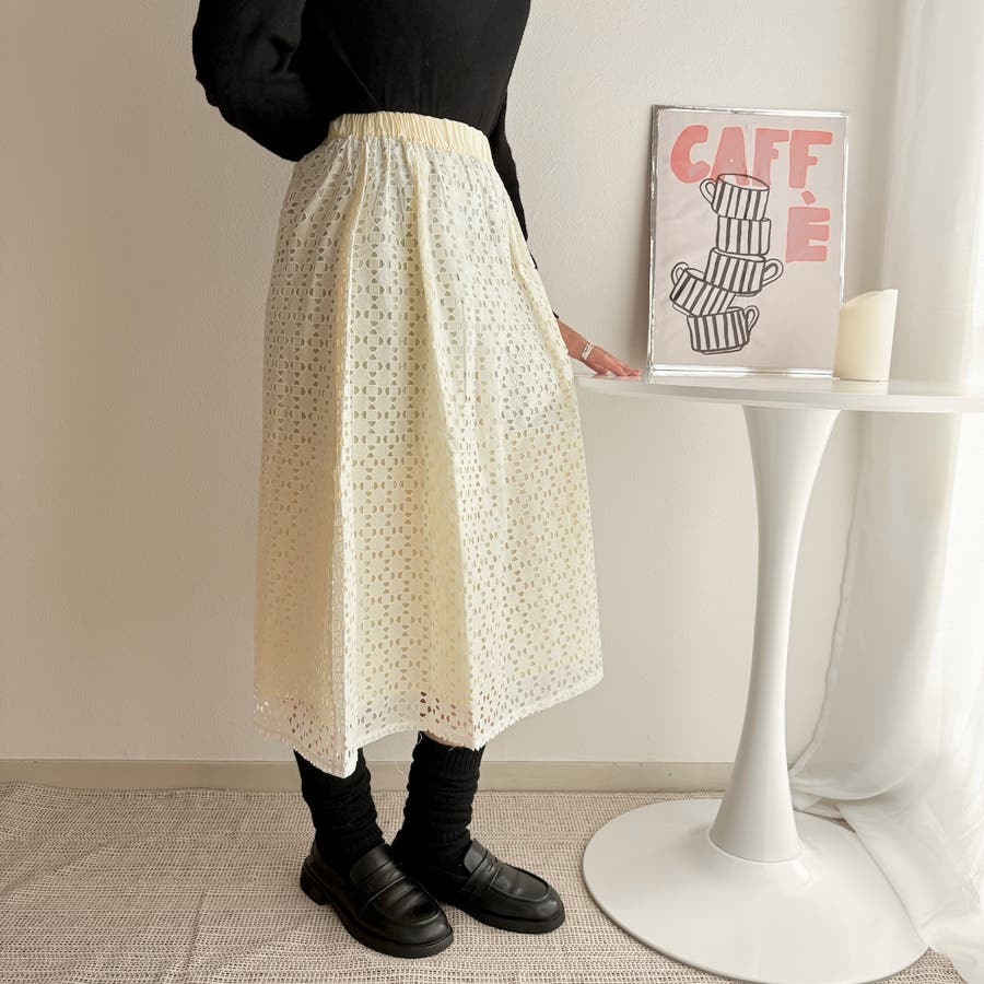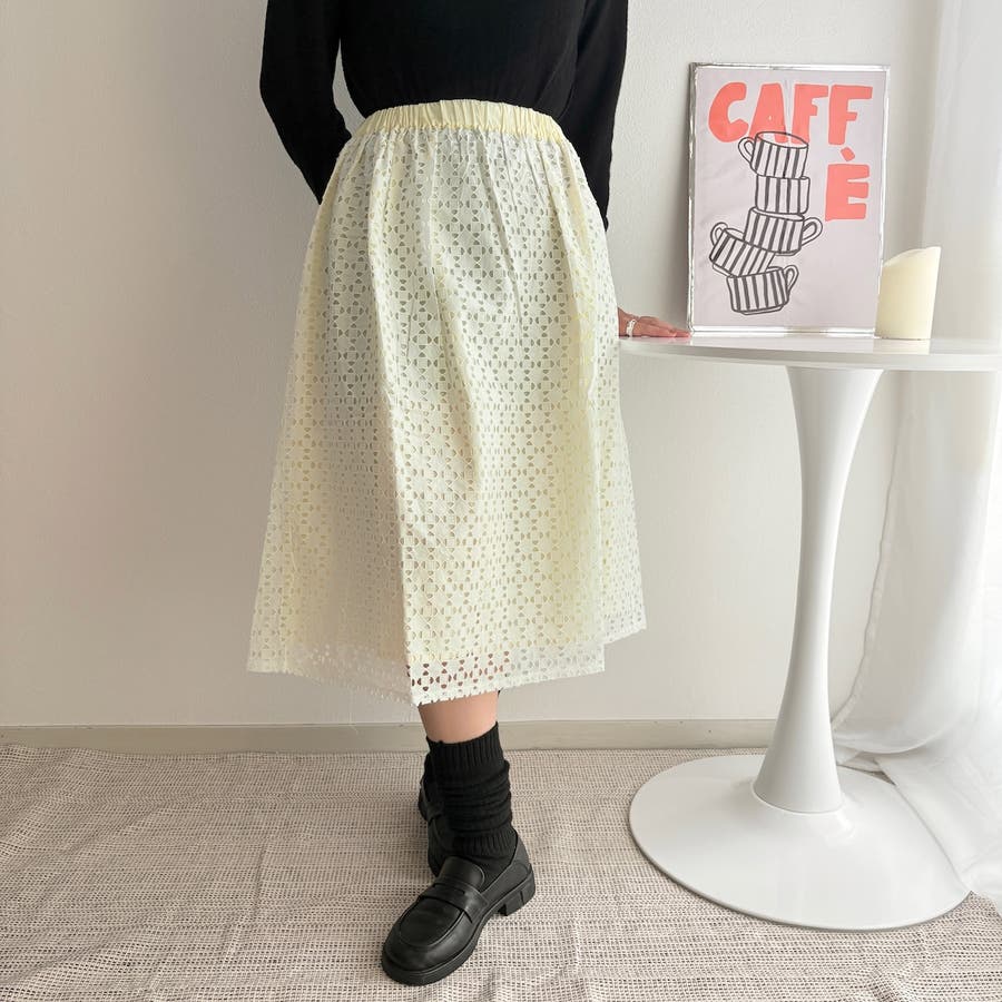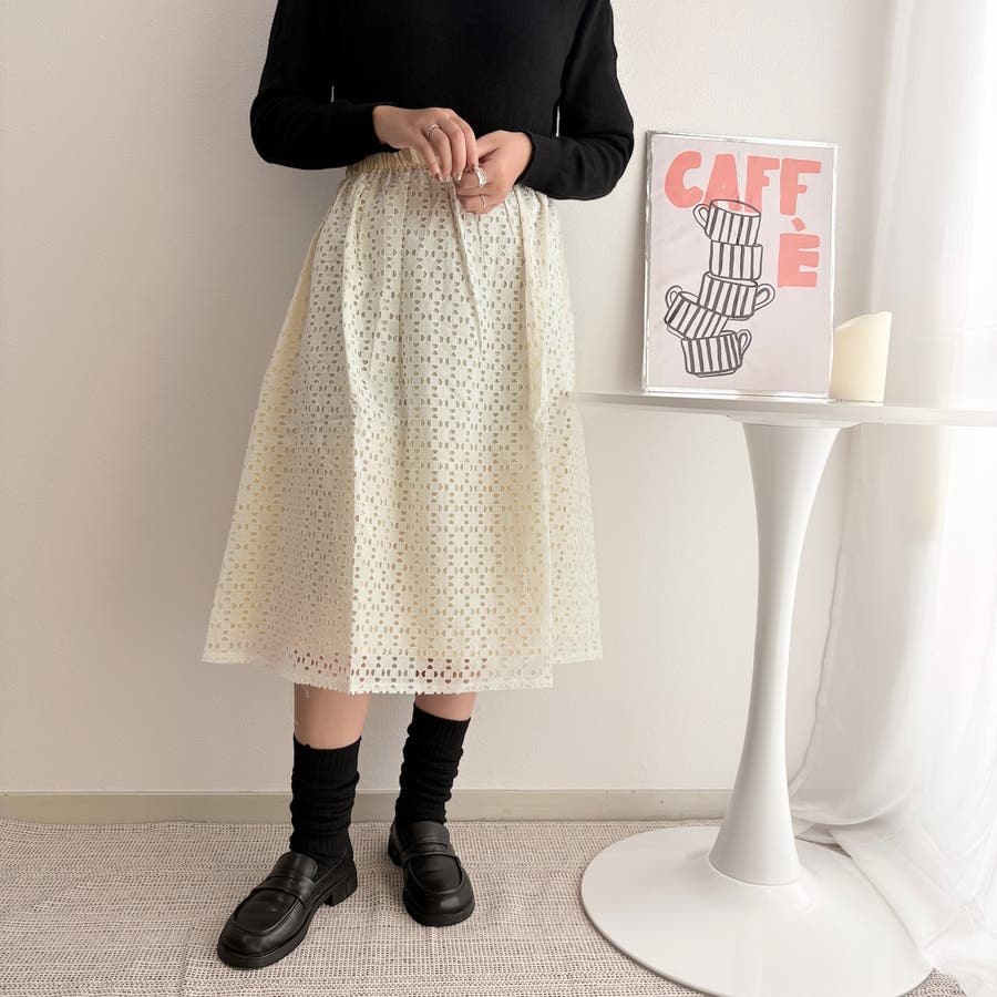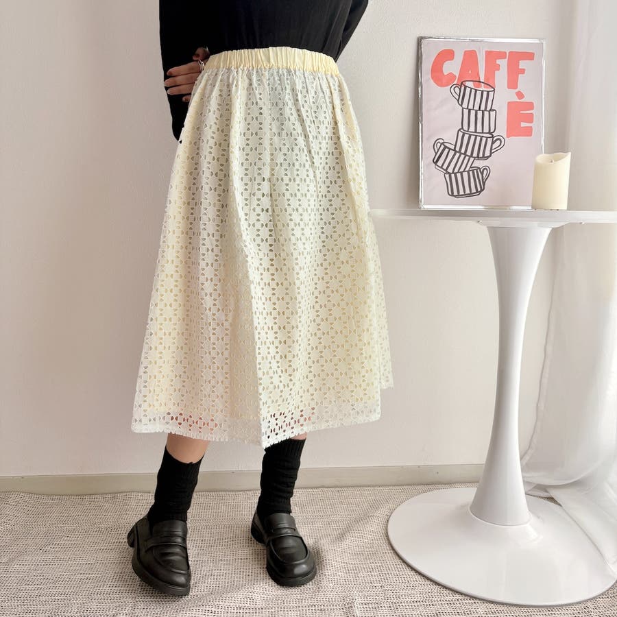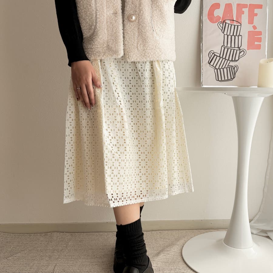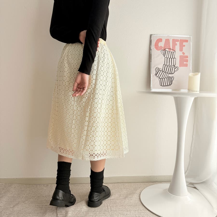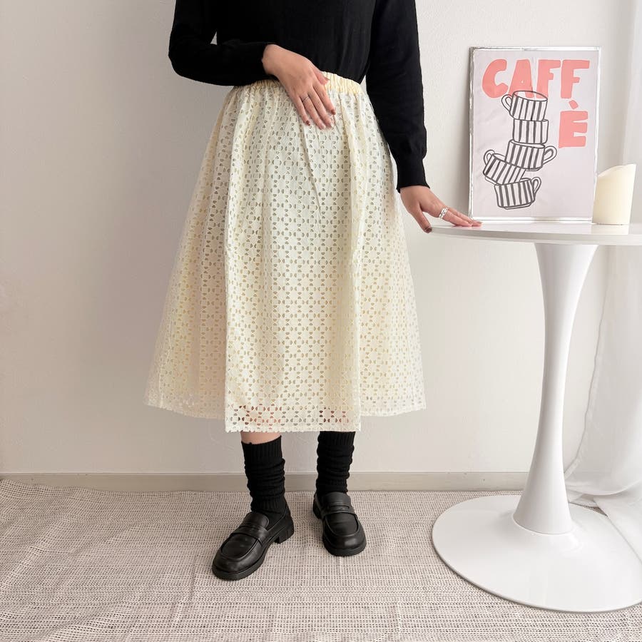 透かし編みデザインで女性らしい印象のミディスカート✨