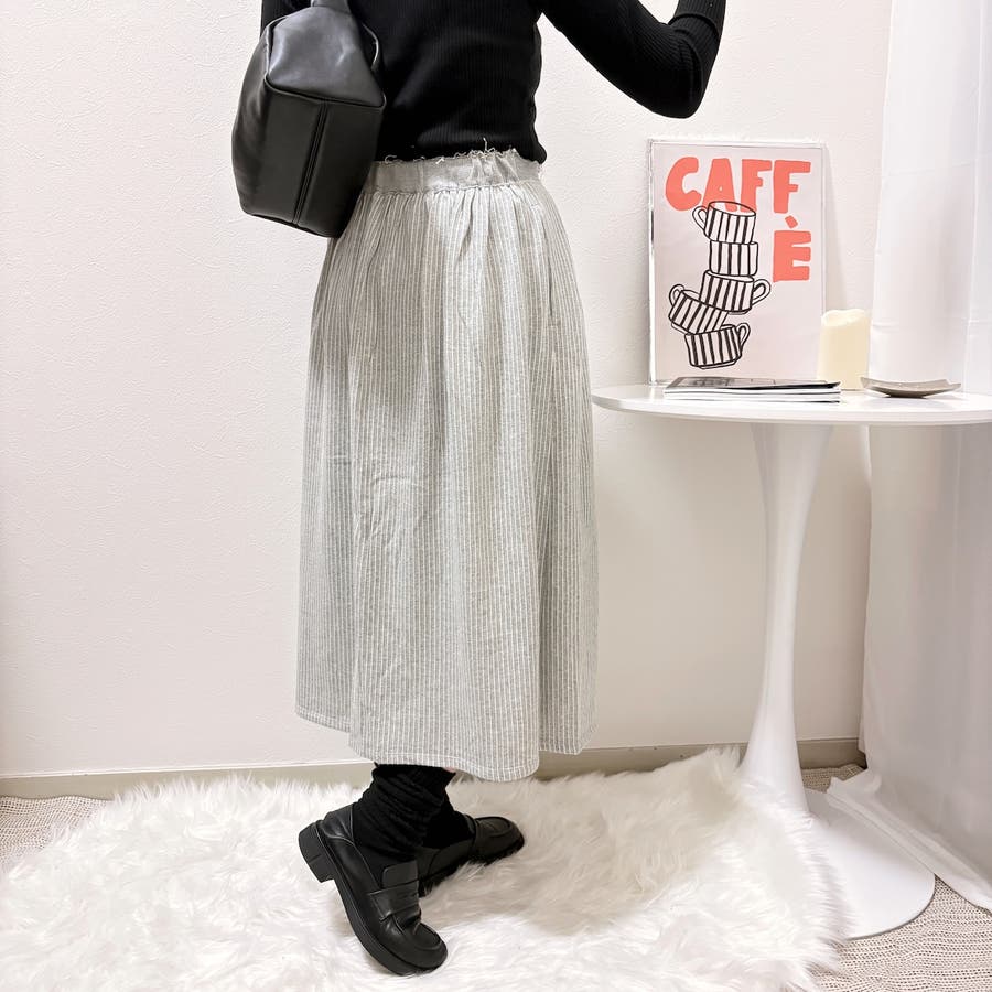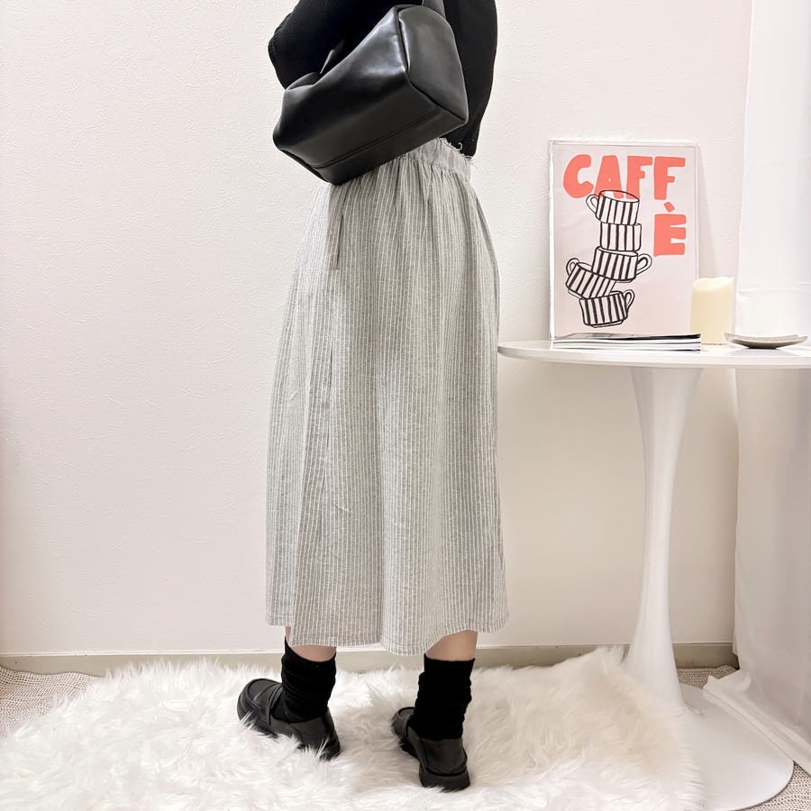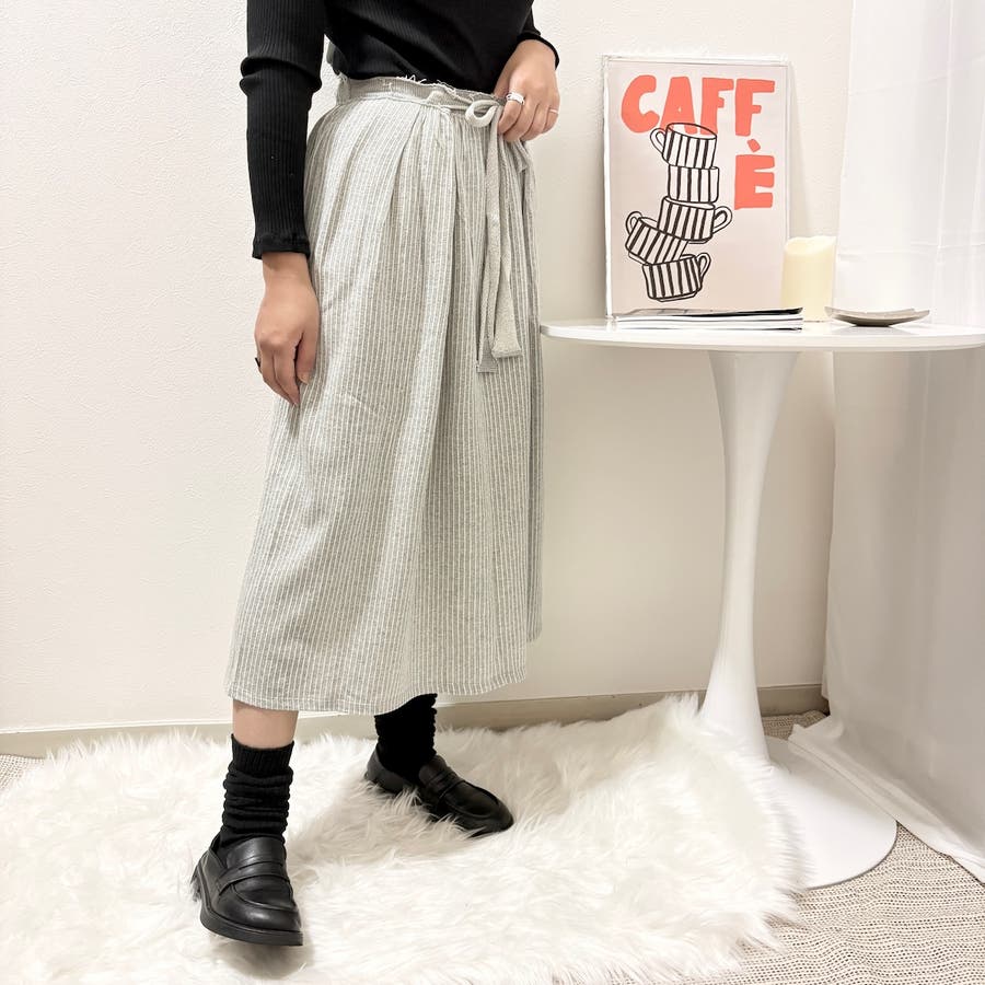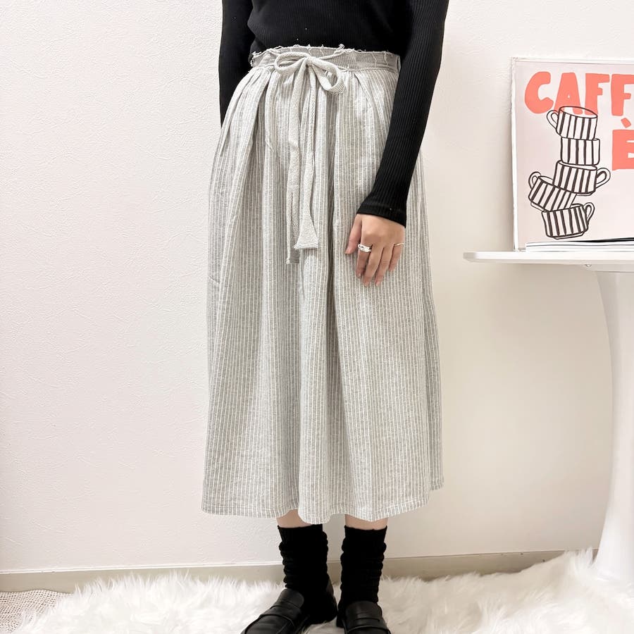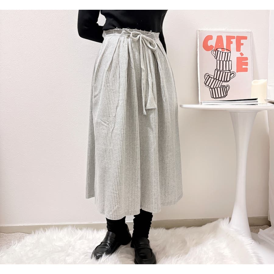 ストライプ柄とウエストリボンがポイントのミディスカート✨