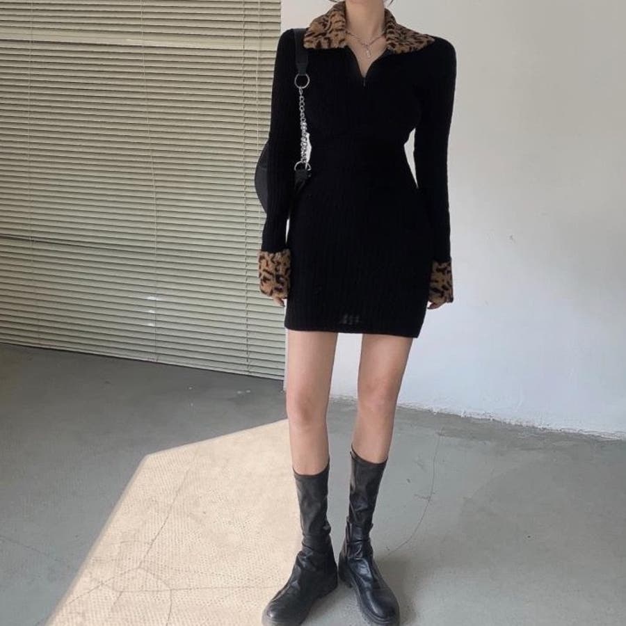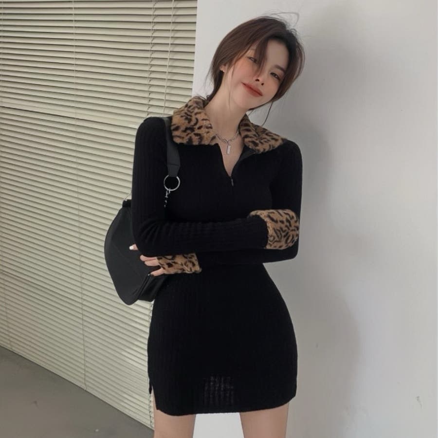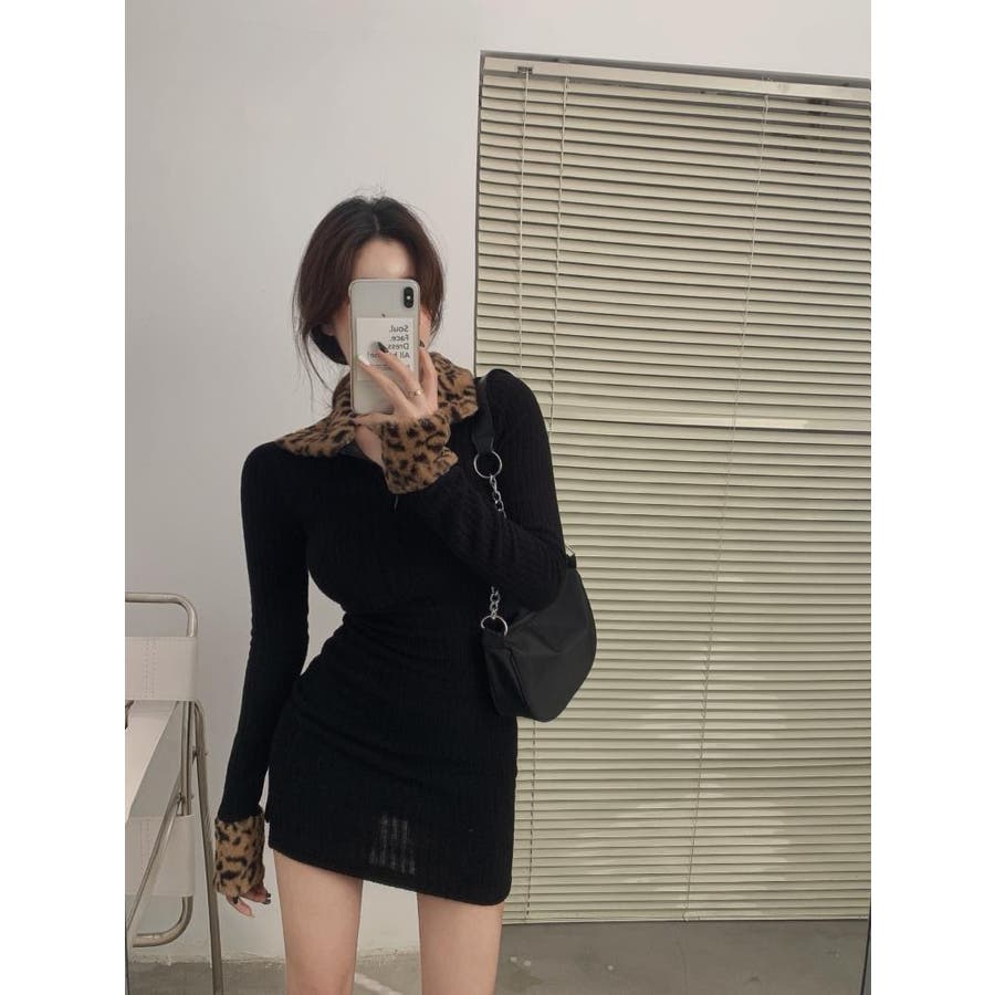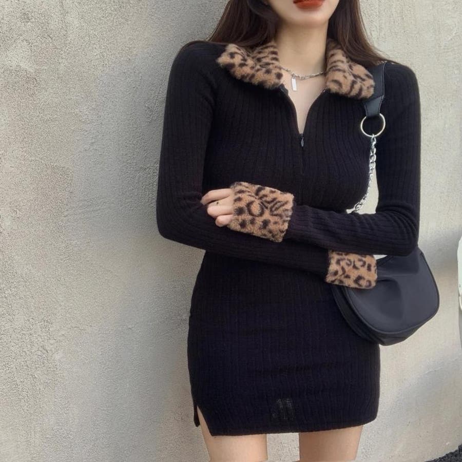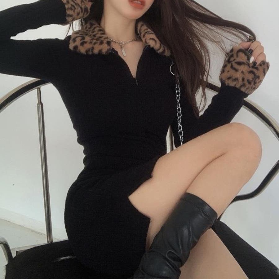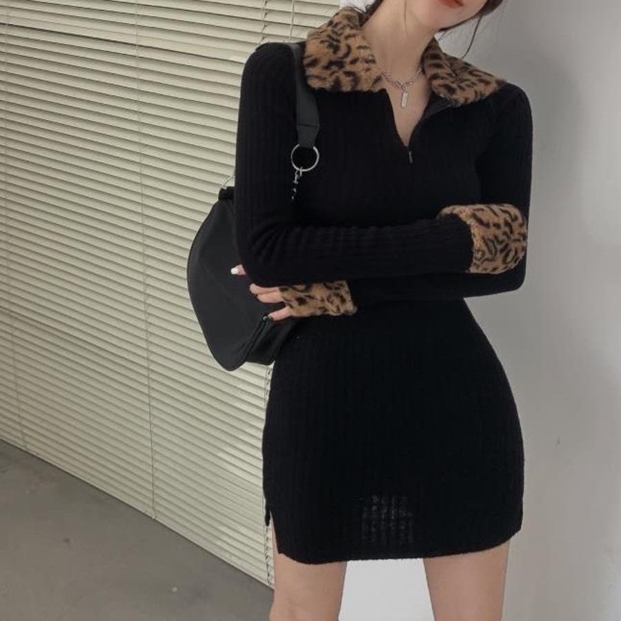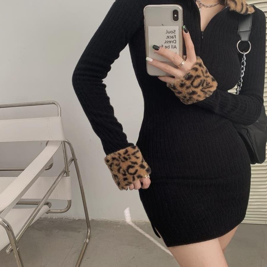 レオパード柄ファー付きリブミニワンピーストレンド柄・フェミニン・秋冬コーデ