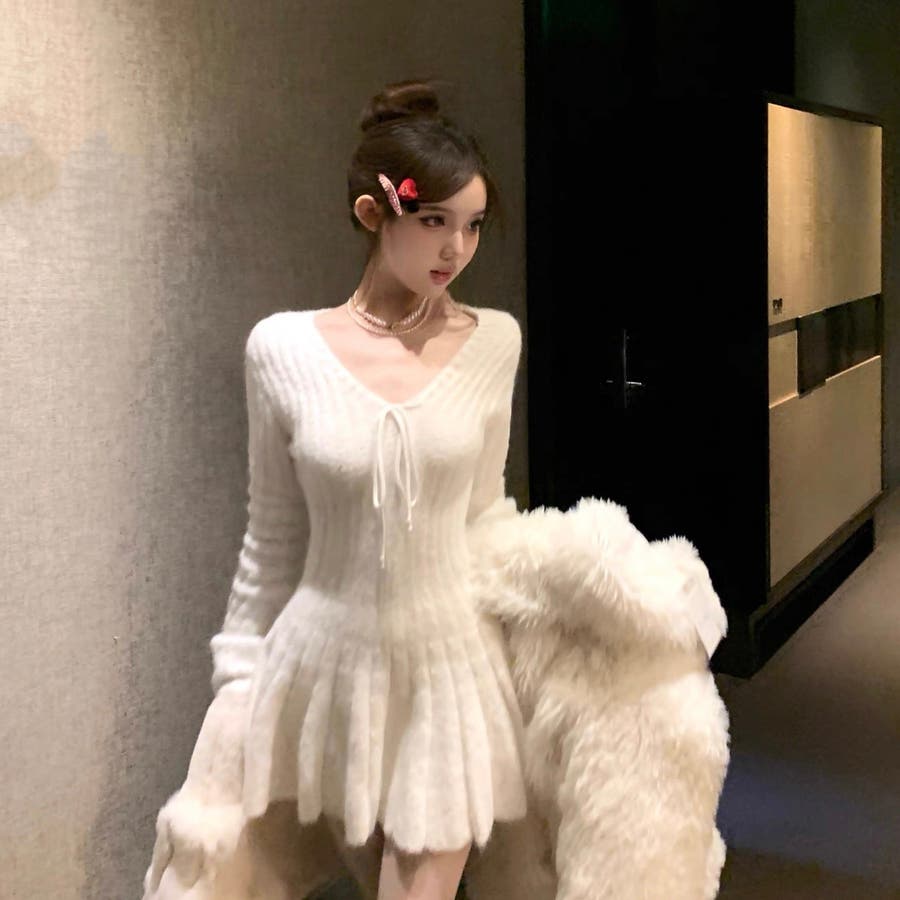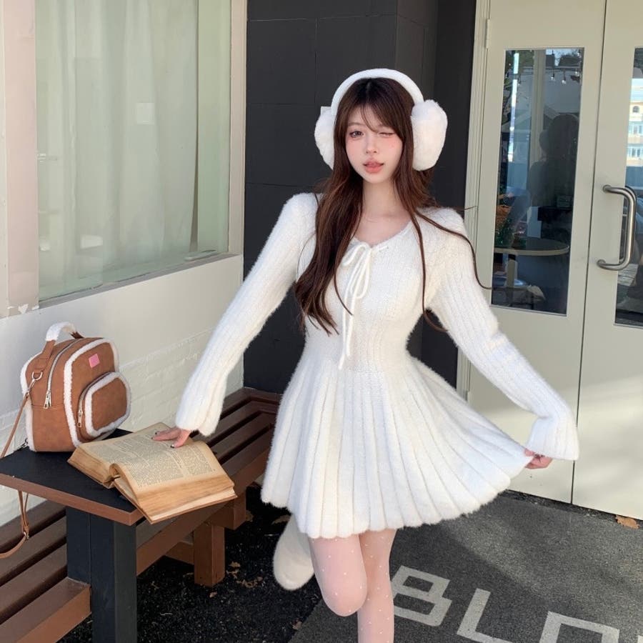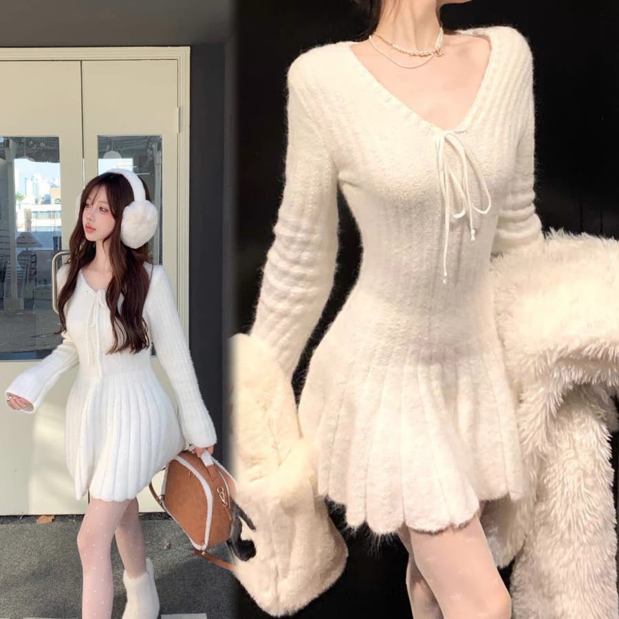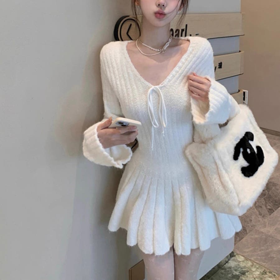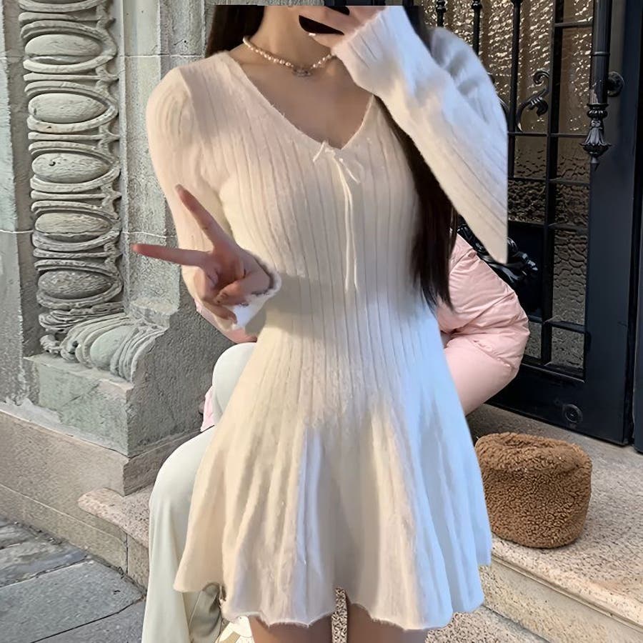 Vネックと胸元のレースアップリボンで、大人っぽさと可愛さを両立したモテワンピです。