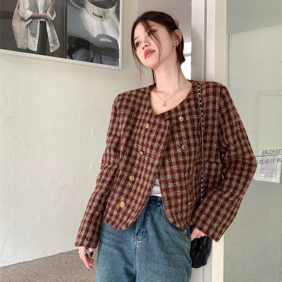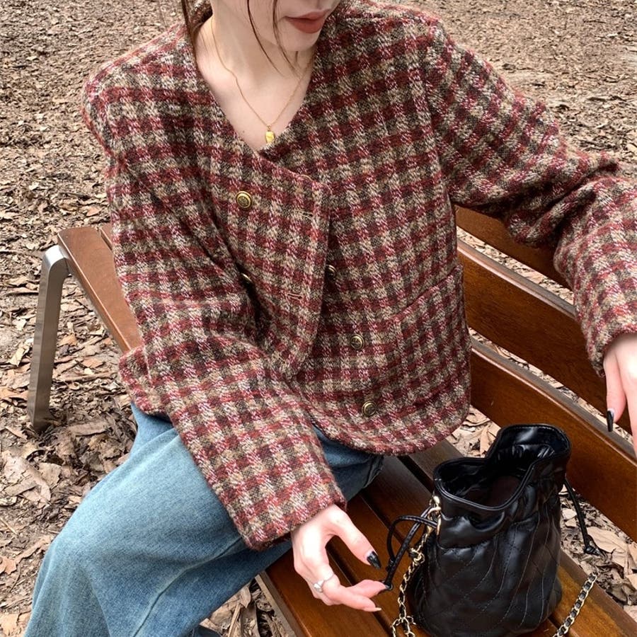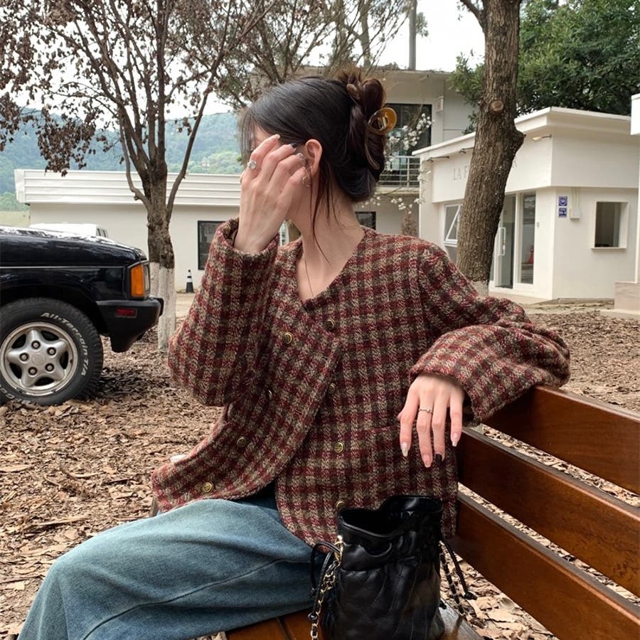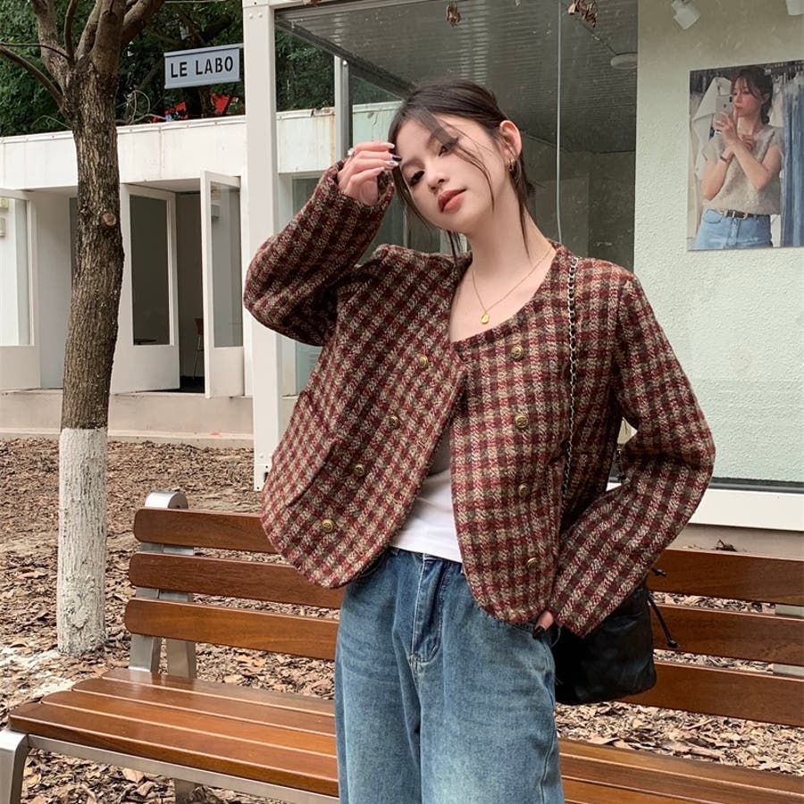 首元すっきりのノーカラーデザインで上品に着こなせ、大柄チェック柄がアクセントになったジャケットです。