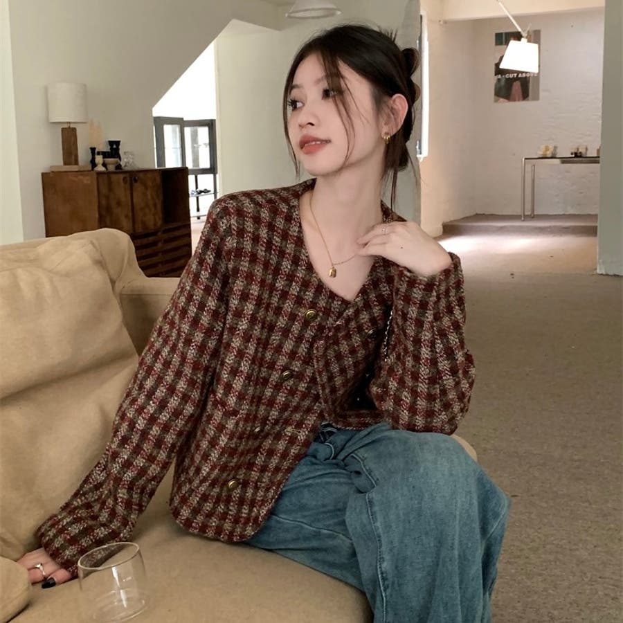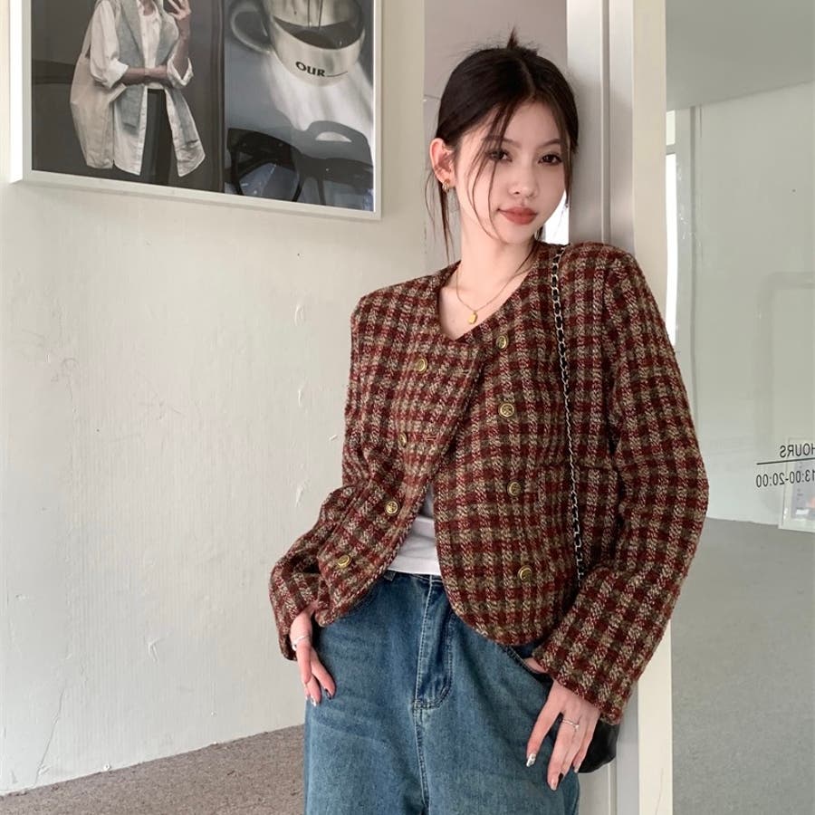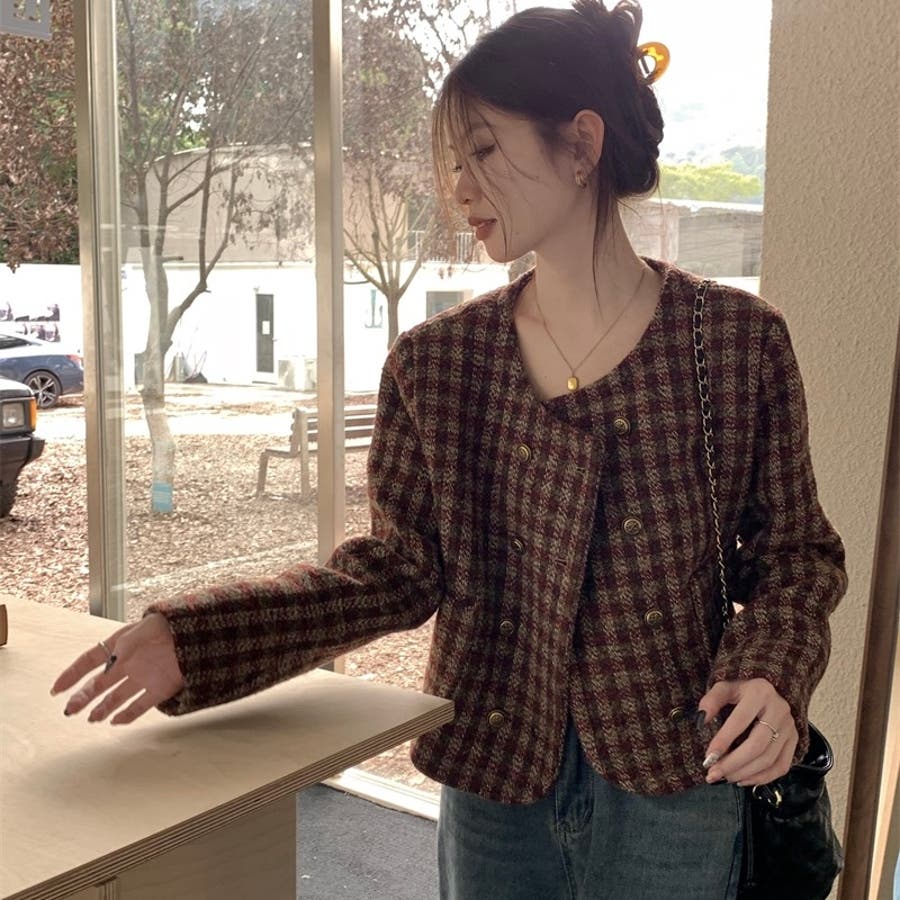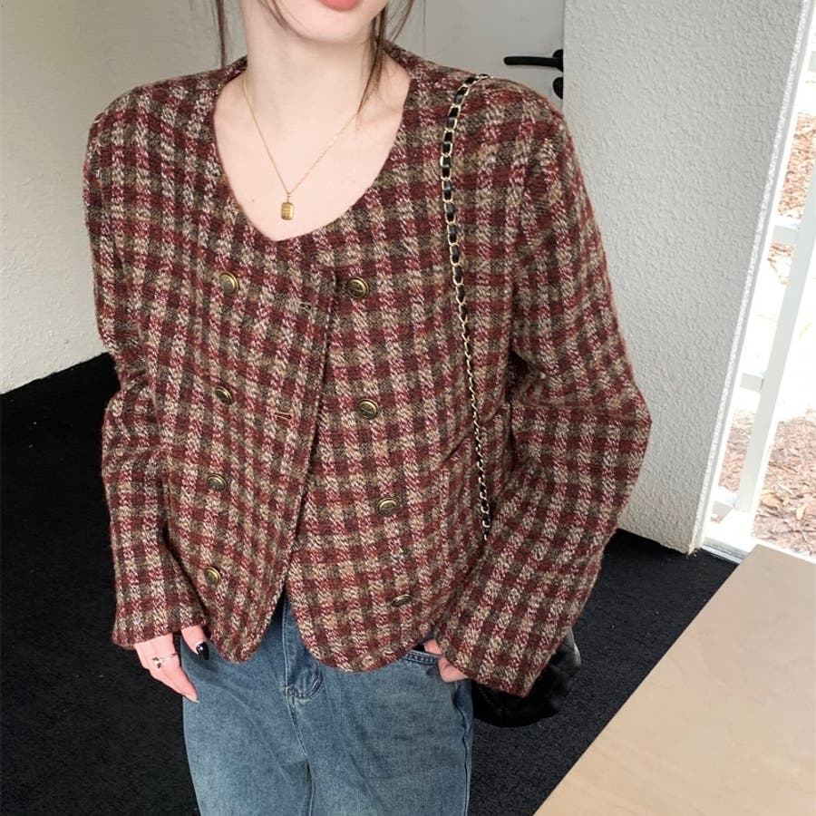 首元すっきりのノーカラーデザインで上品に着こなせ、大柄チェック柄がアクセントになったジャケットです。