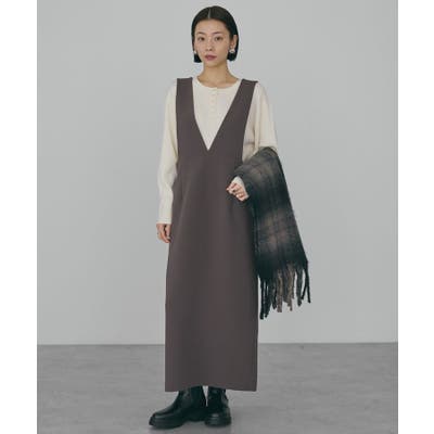 フロントVカットのベーシックなロング丈シルエットが汎用性抜群のワンピース。ウエストタックでやや絞りを加え、自然なメリハリ感を演出した品のあるデザインです。ワントーンカラーでレイヤードしやすく、アイテム次第で雰囲気をチェンジ。バックファスナー仕様でさらに楽に着用でき、シワになりにくいイージーケア素材なのも嬉しいポイントです。透け感[なし]